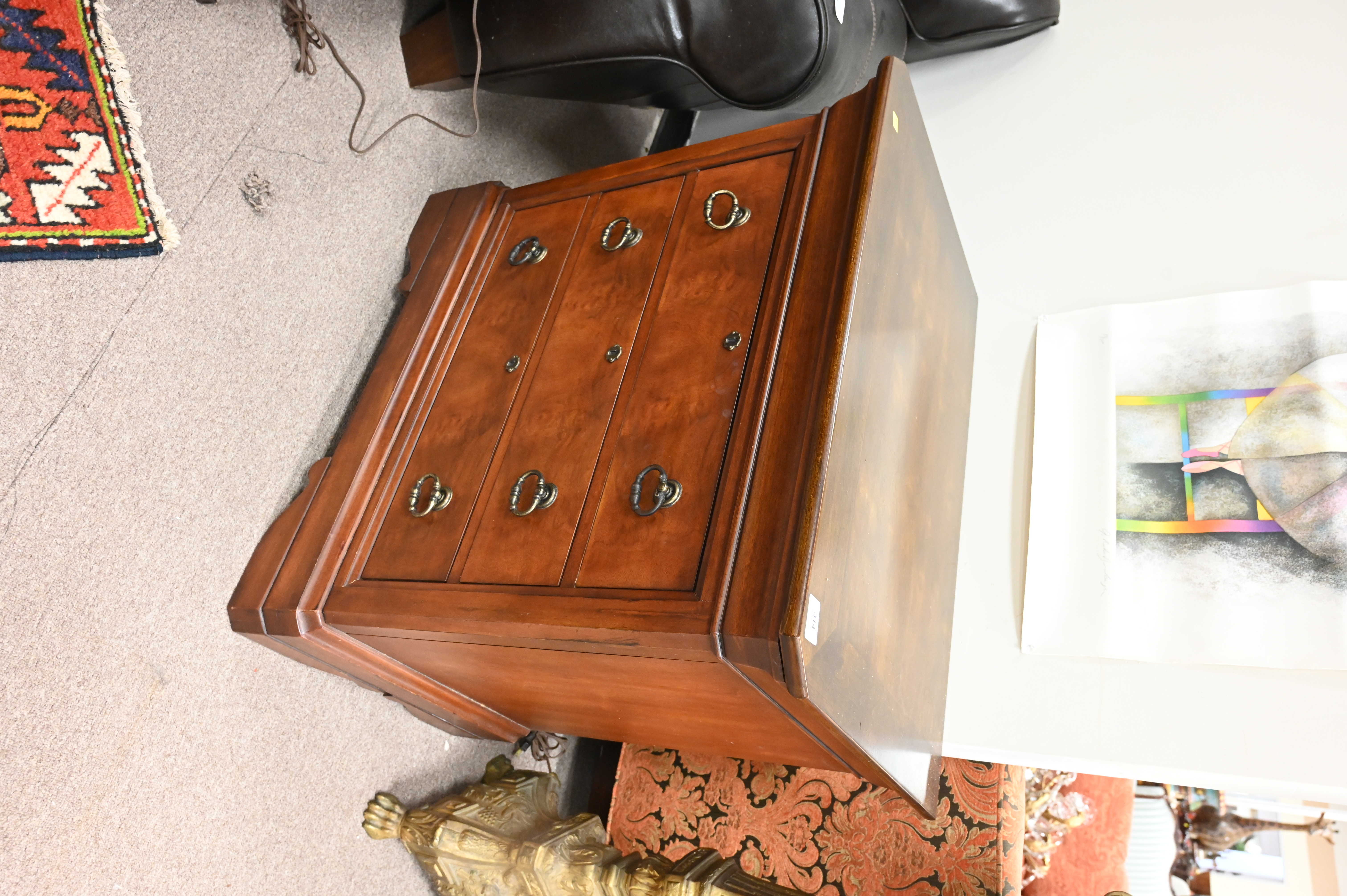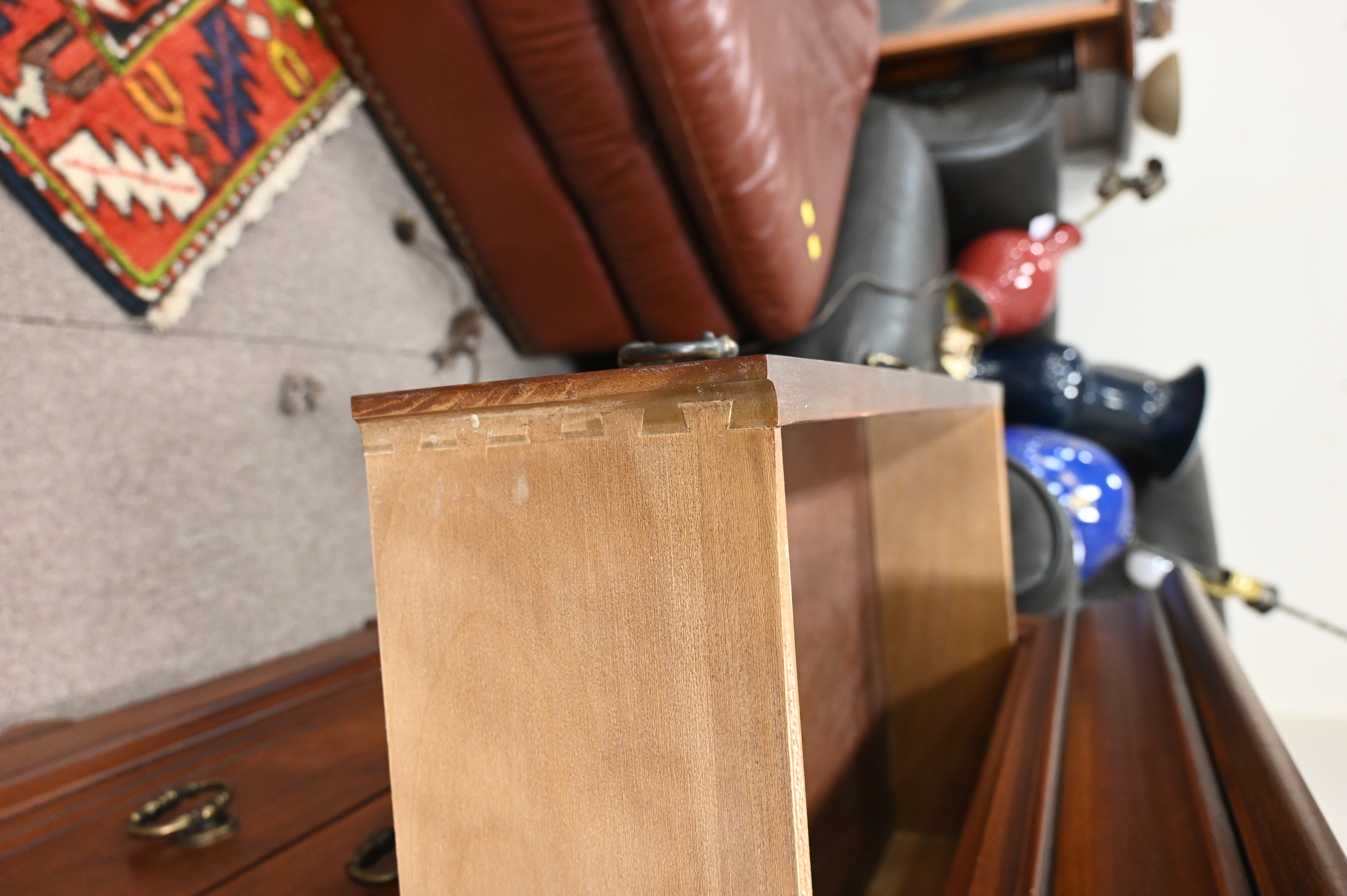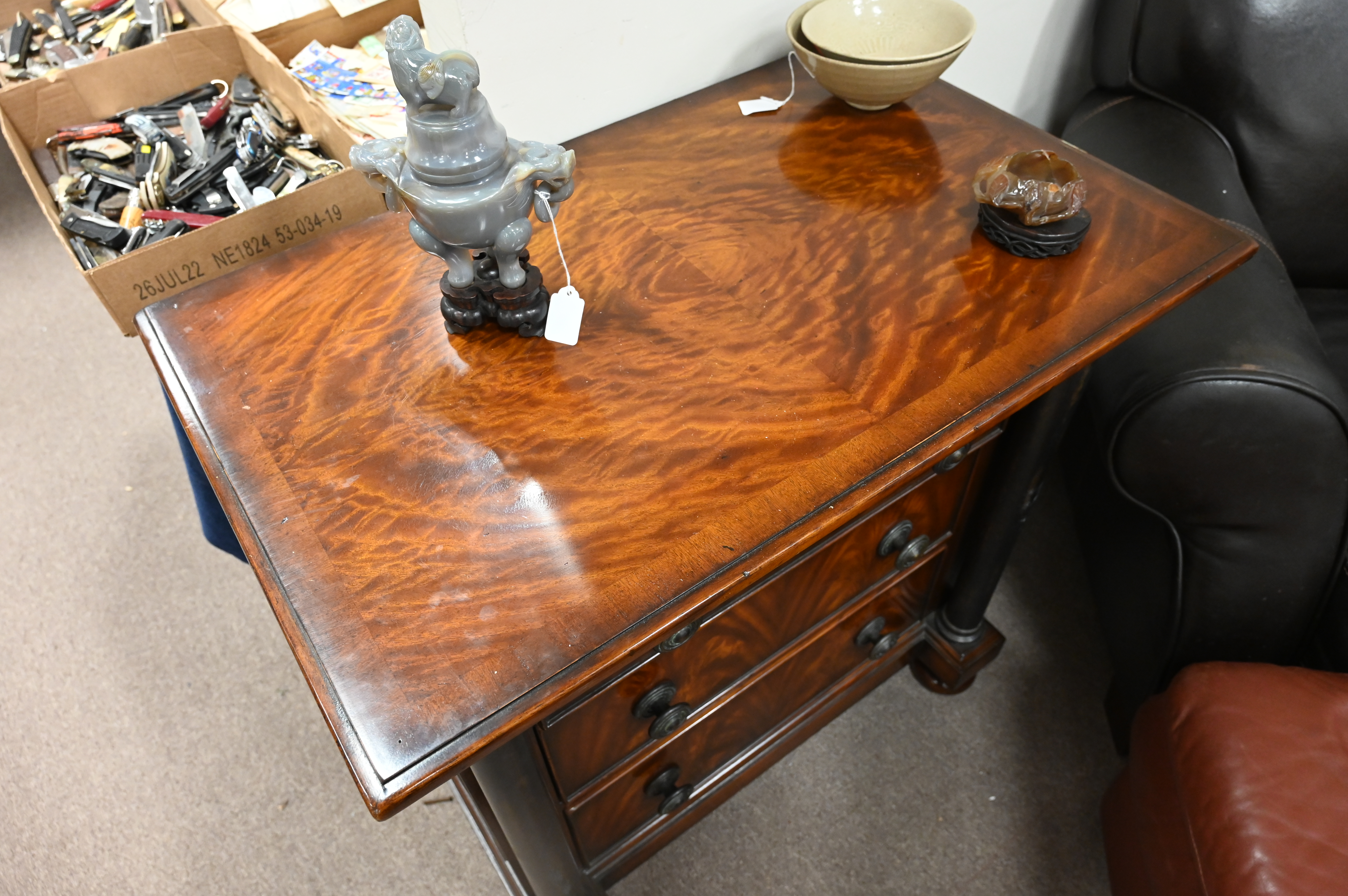 Two Mahogany Night Stands/Side Tables, each having three drawers, one marked Henredon, heights 30 and 31 inches, widths 32 and 32 1/2 inches.
