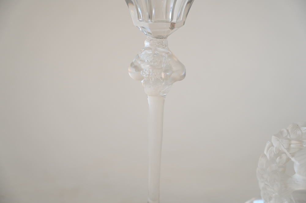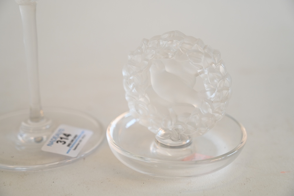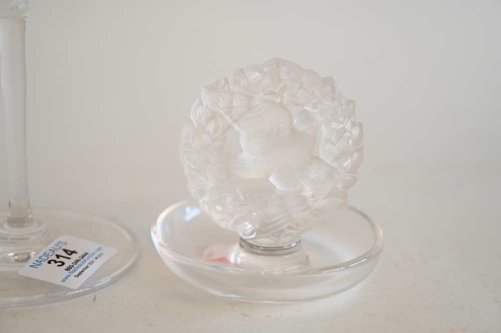 Lot 314: Two Piece Lalique Lot, to include a “Bacchus” martini glass, along with ring dish having a dove in a wreath, both marked to the underside, martini height 8 1/4 inches.