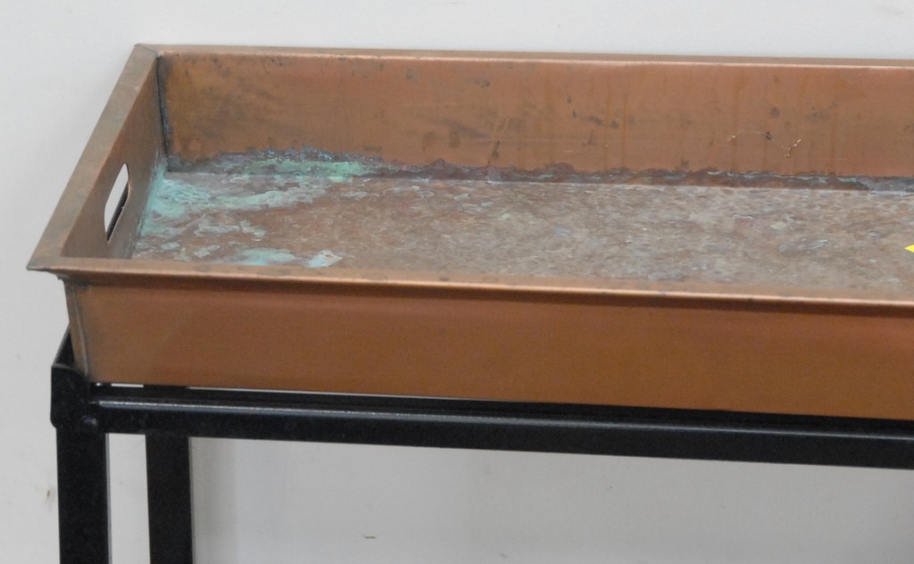 Two piece lot plant stand with copper top on iron legs along with iron outdoor planter.
