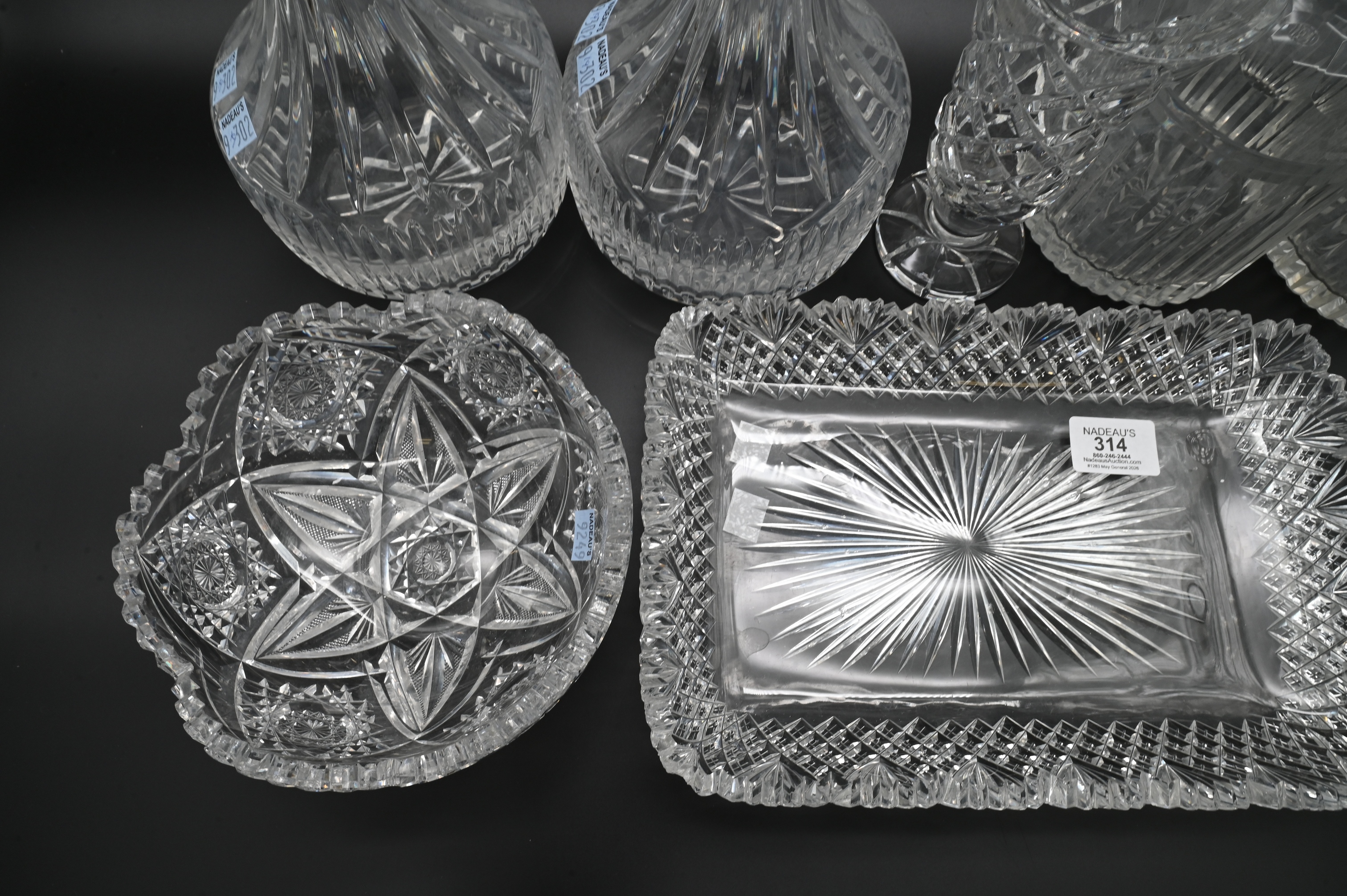 pair of Waterford cut crystal decanters and stoppers, circa 1940, height 14 1/2 inches, Waterford cut crystal serving plate, vase, two cut glass bowls in starburst and geometric decoration along with another pair of cut glass decanters