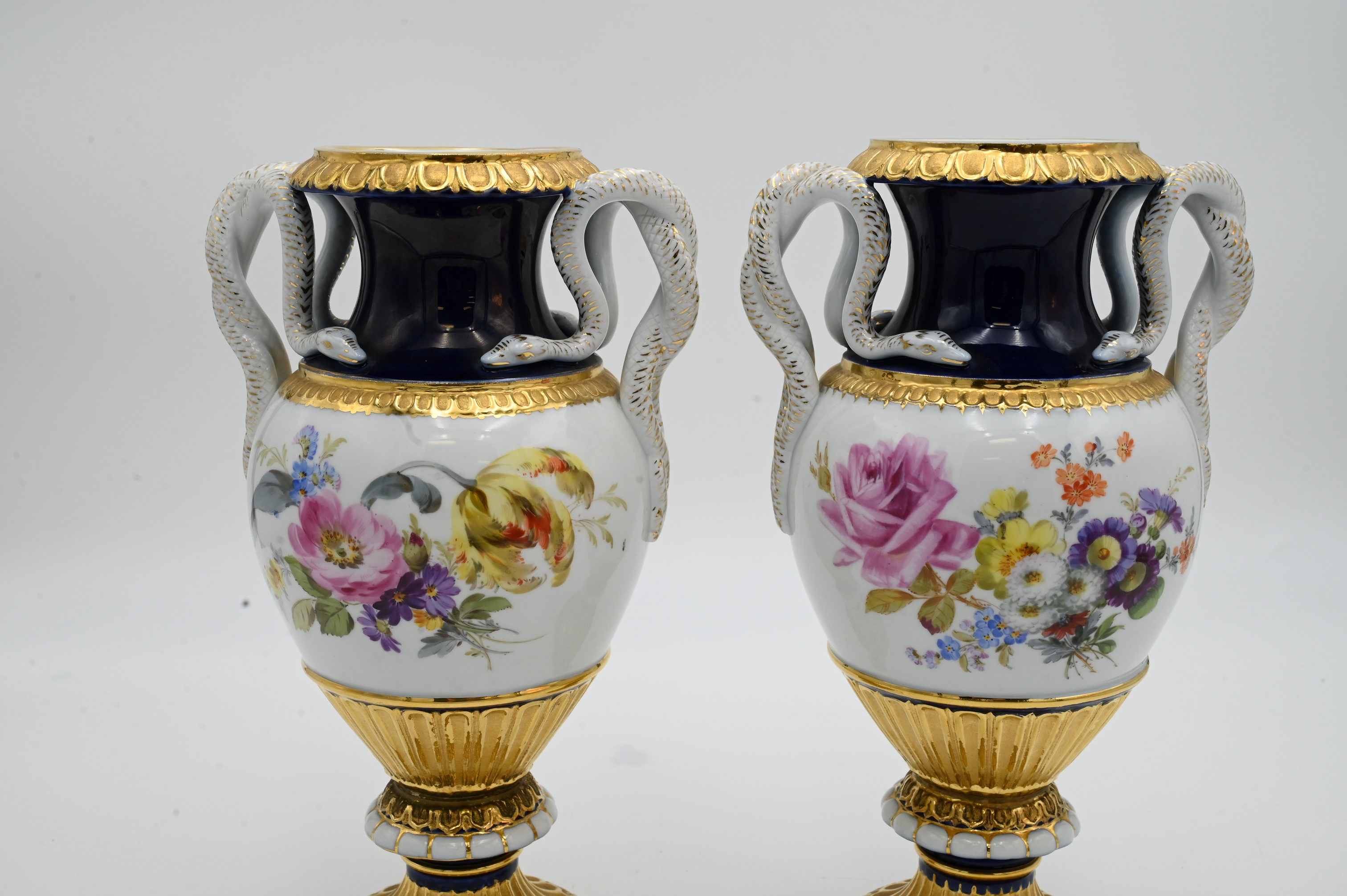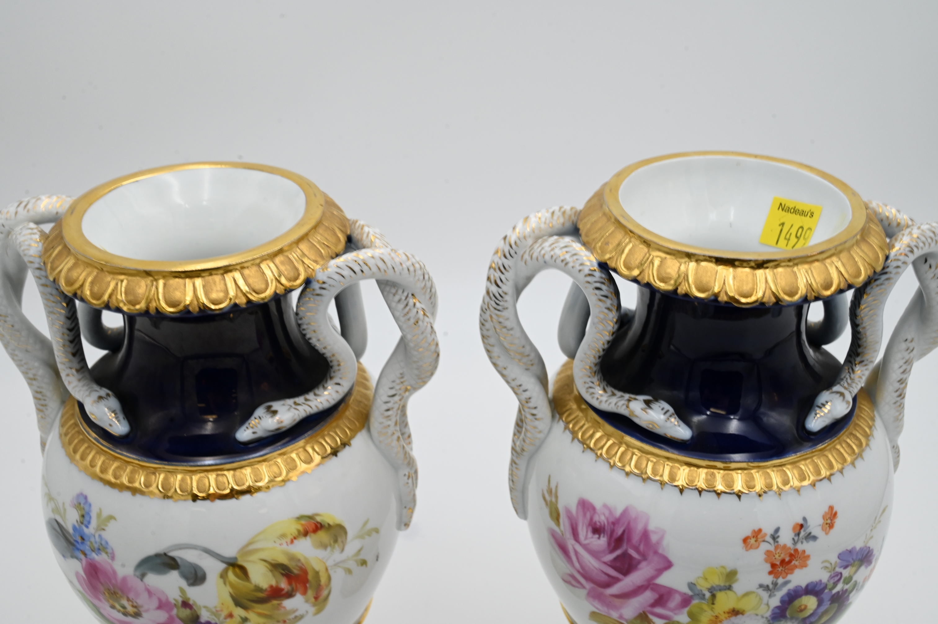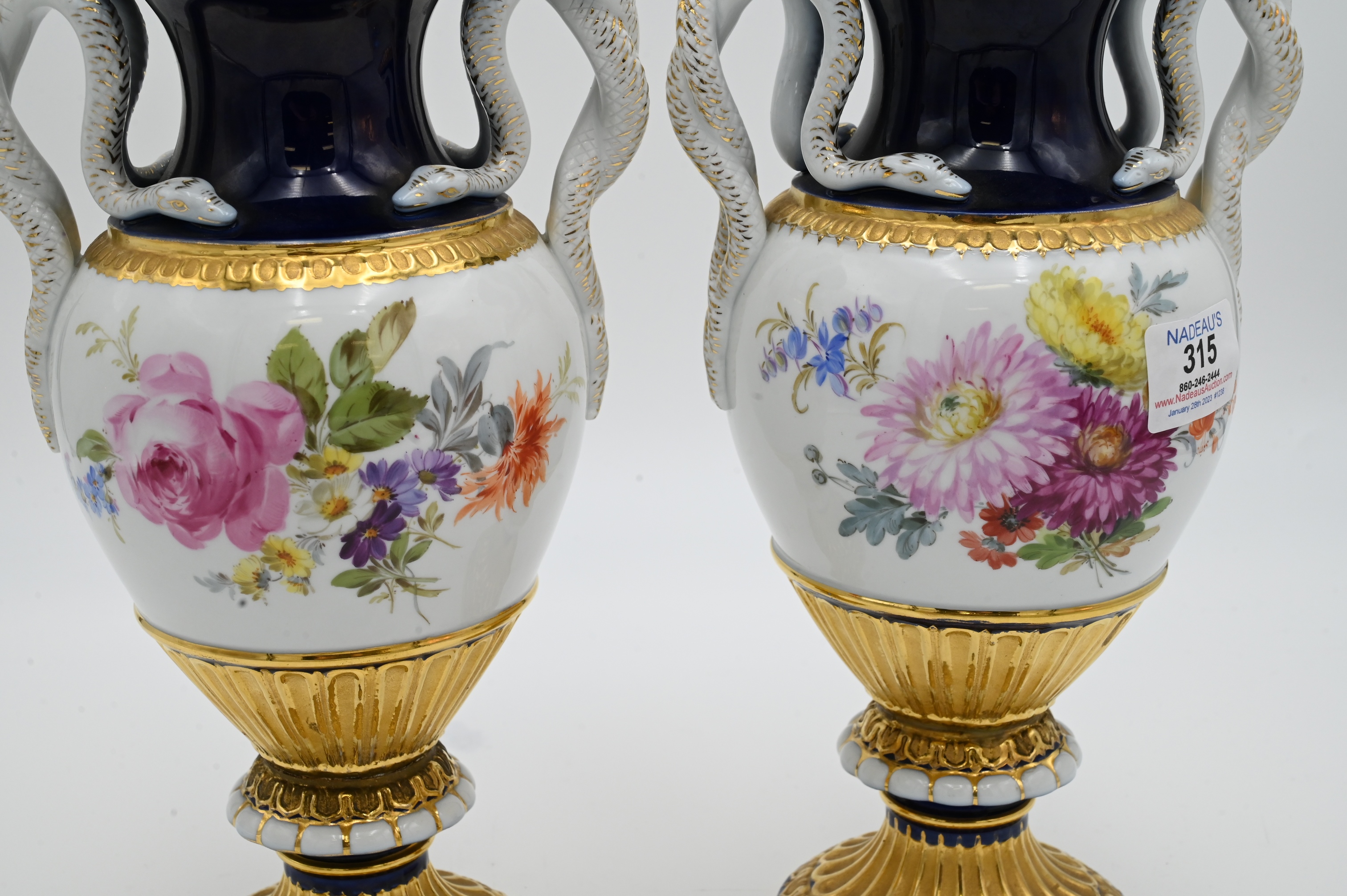 A Pair of Meissen Porcelain Vases, having molded snake handles, flower painted body, on gilt pedestal base, height 10 1/2 inches.