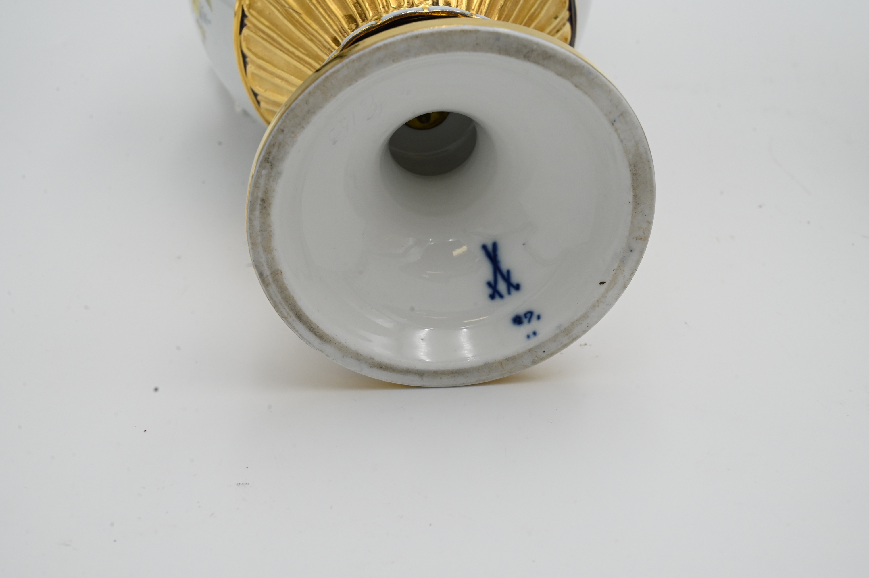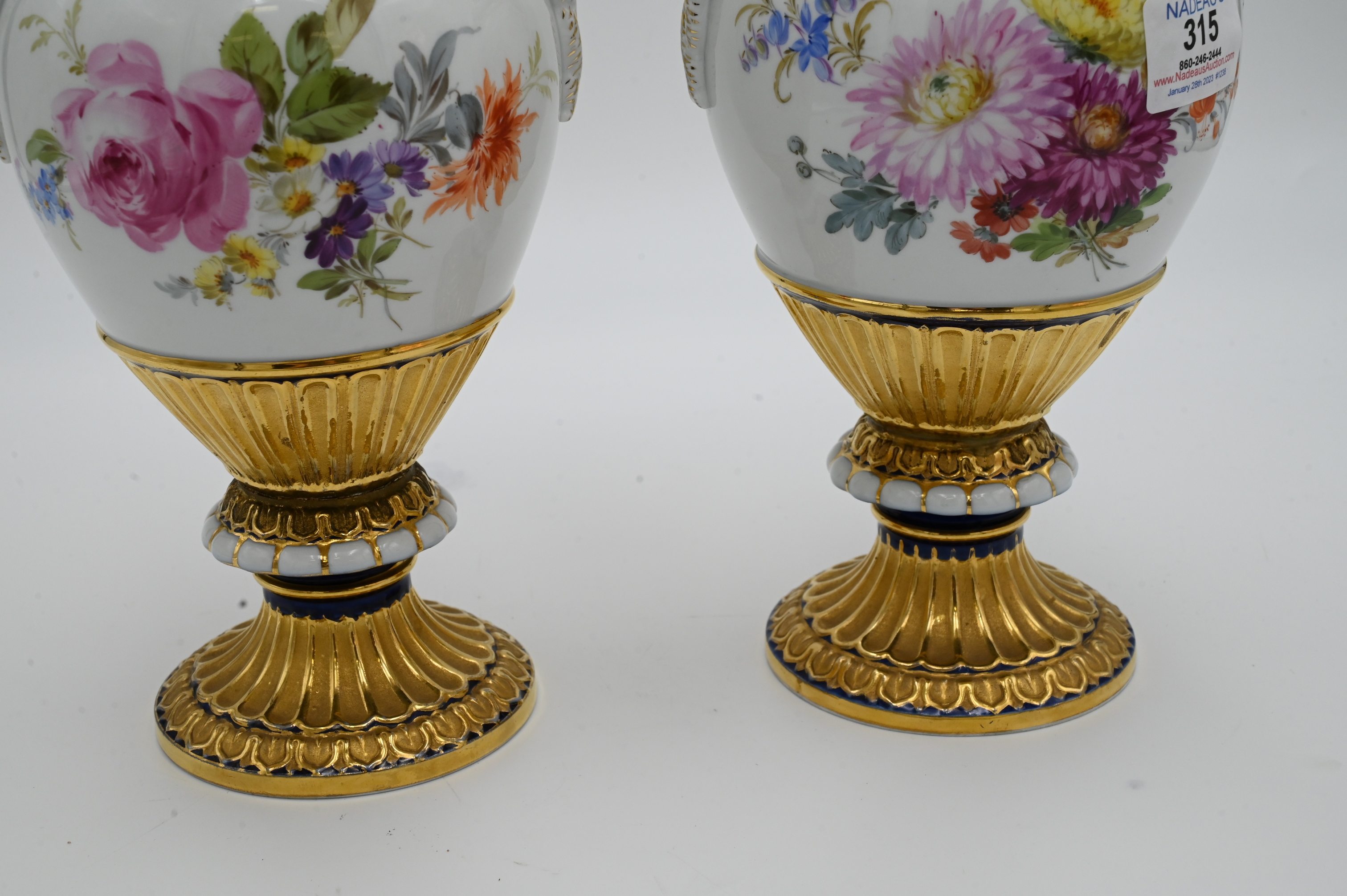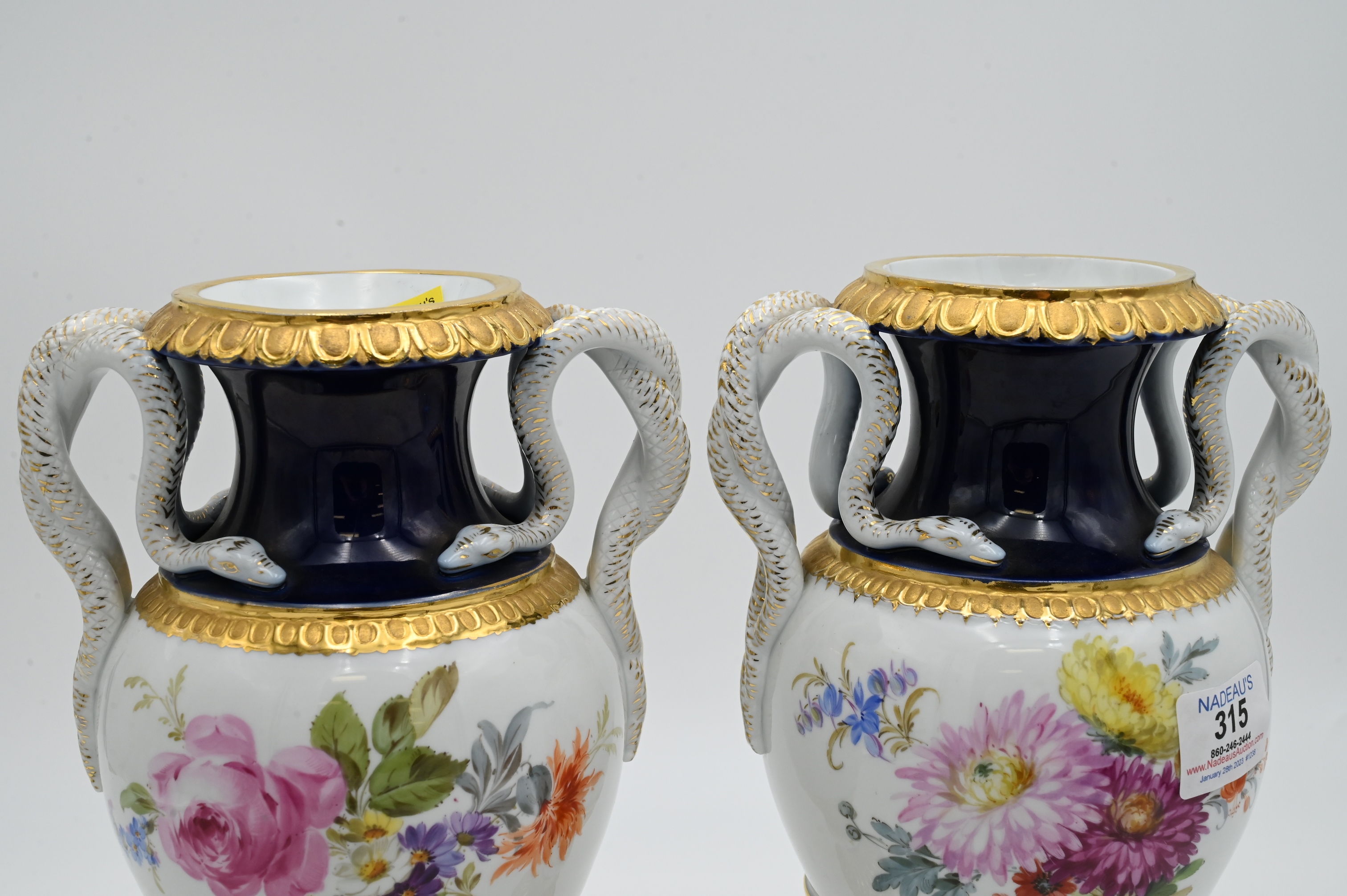 A Pair of Meissen Porcelain Vases, having molded snake handles, flower painted body, on gilt pedestal base, height 10 1/2 inches.