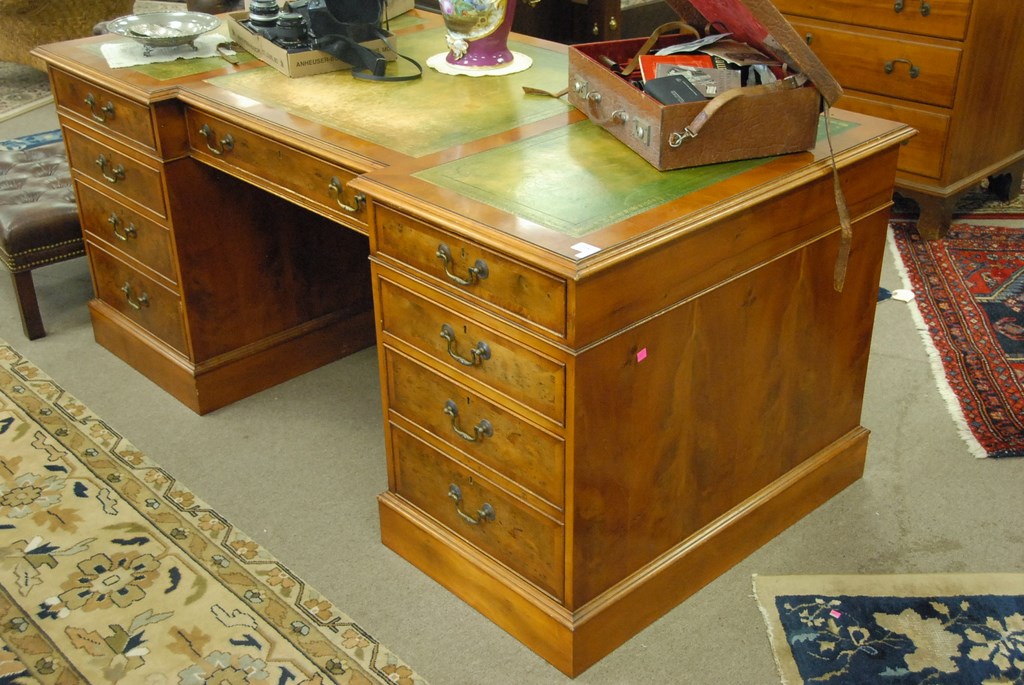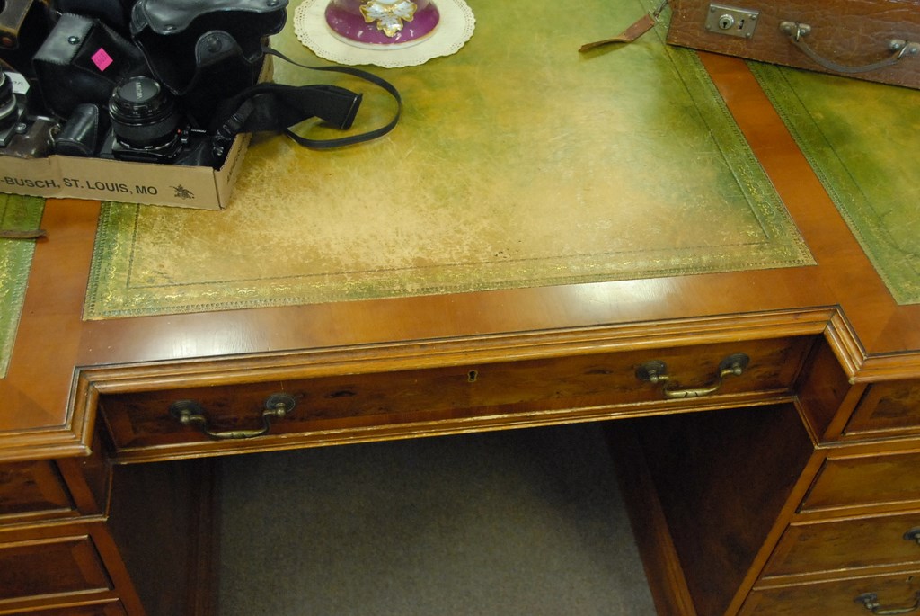 English style desk with three inset leather writing surfaces, desk is in four parts, top: 35 x 69.