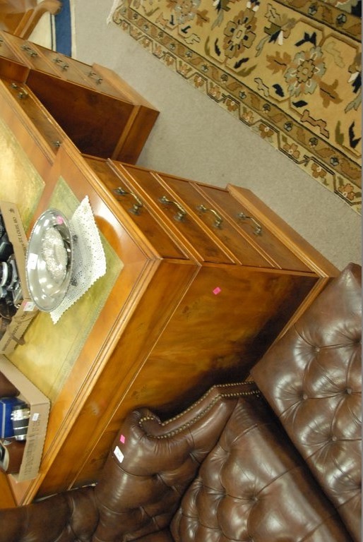 Lot 315: English style desk with three inset leather writing surfaces, desk is in four parts, top: 35 x 69.