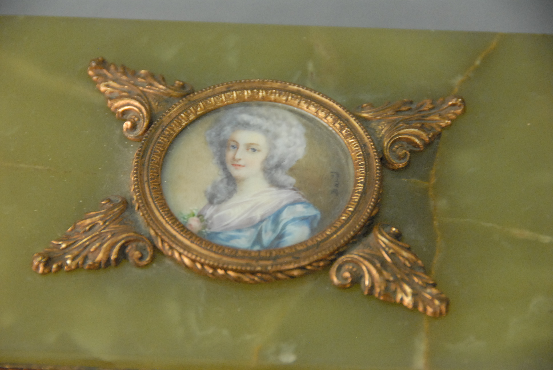 Lot 315: French green alabaster portrait box, brass bound alabaster with circle painting on ivory bust of woman marked made in France on bo…