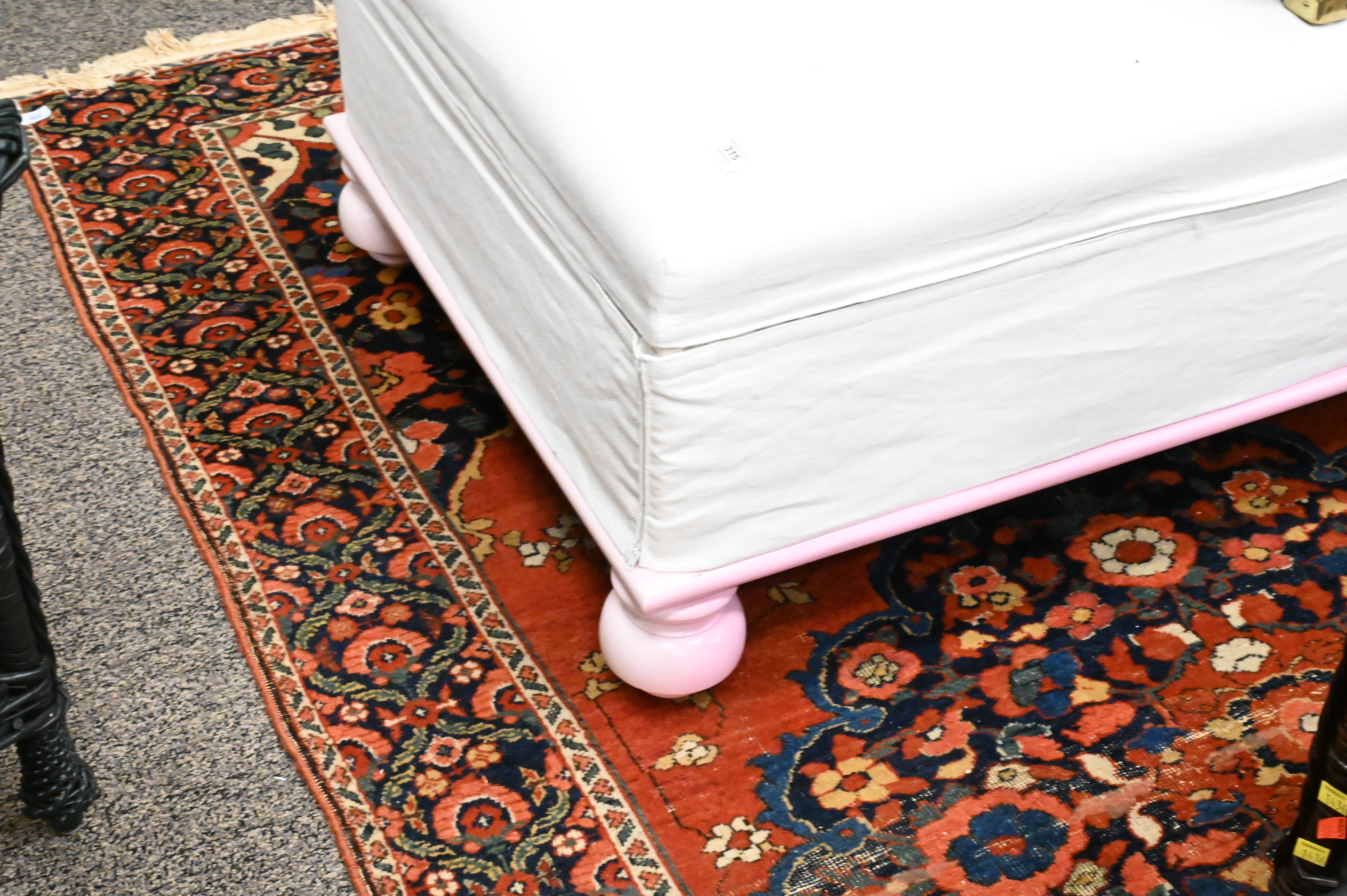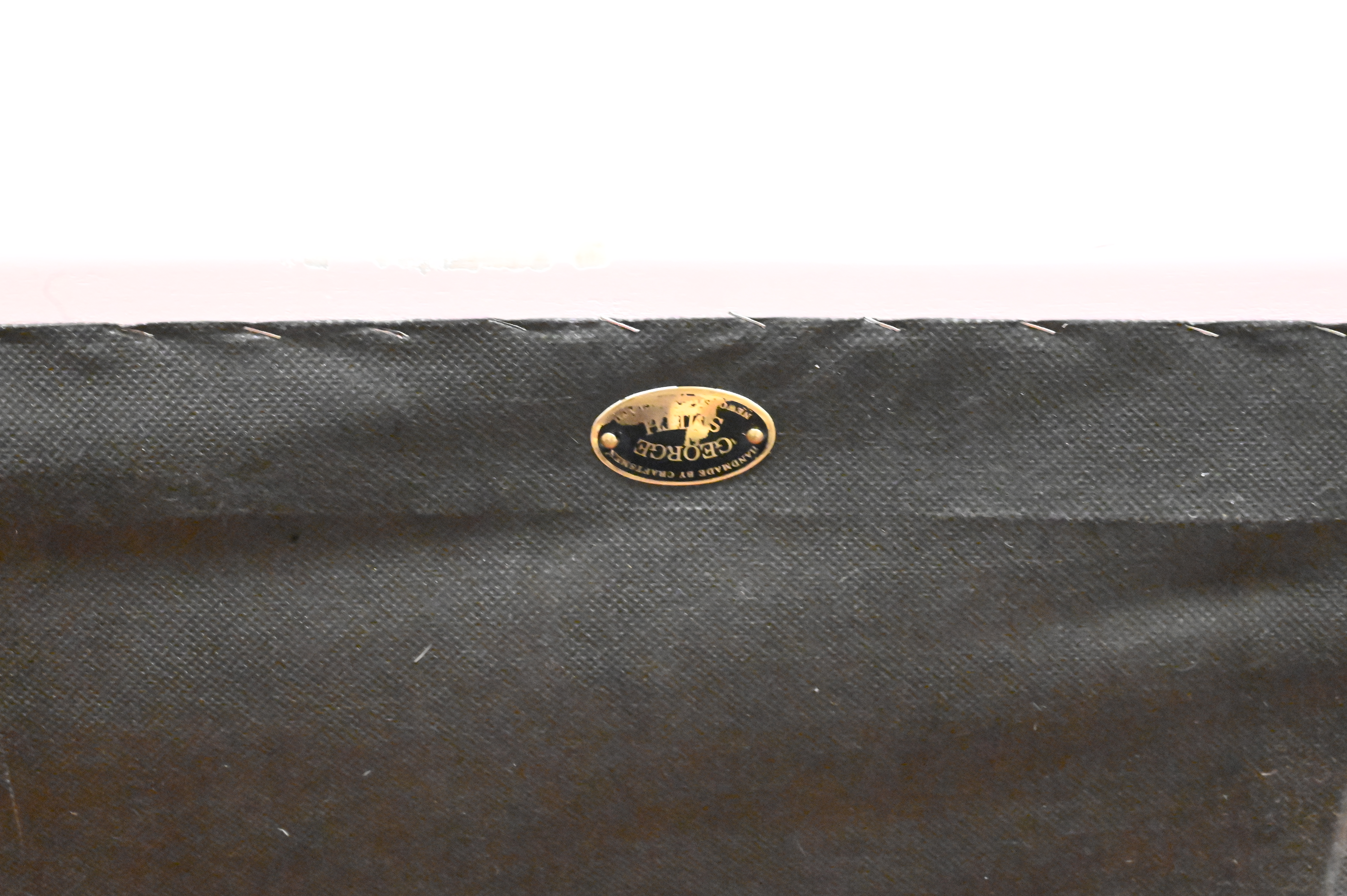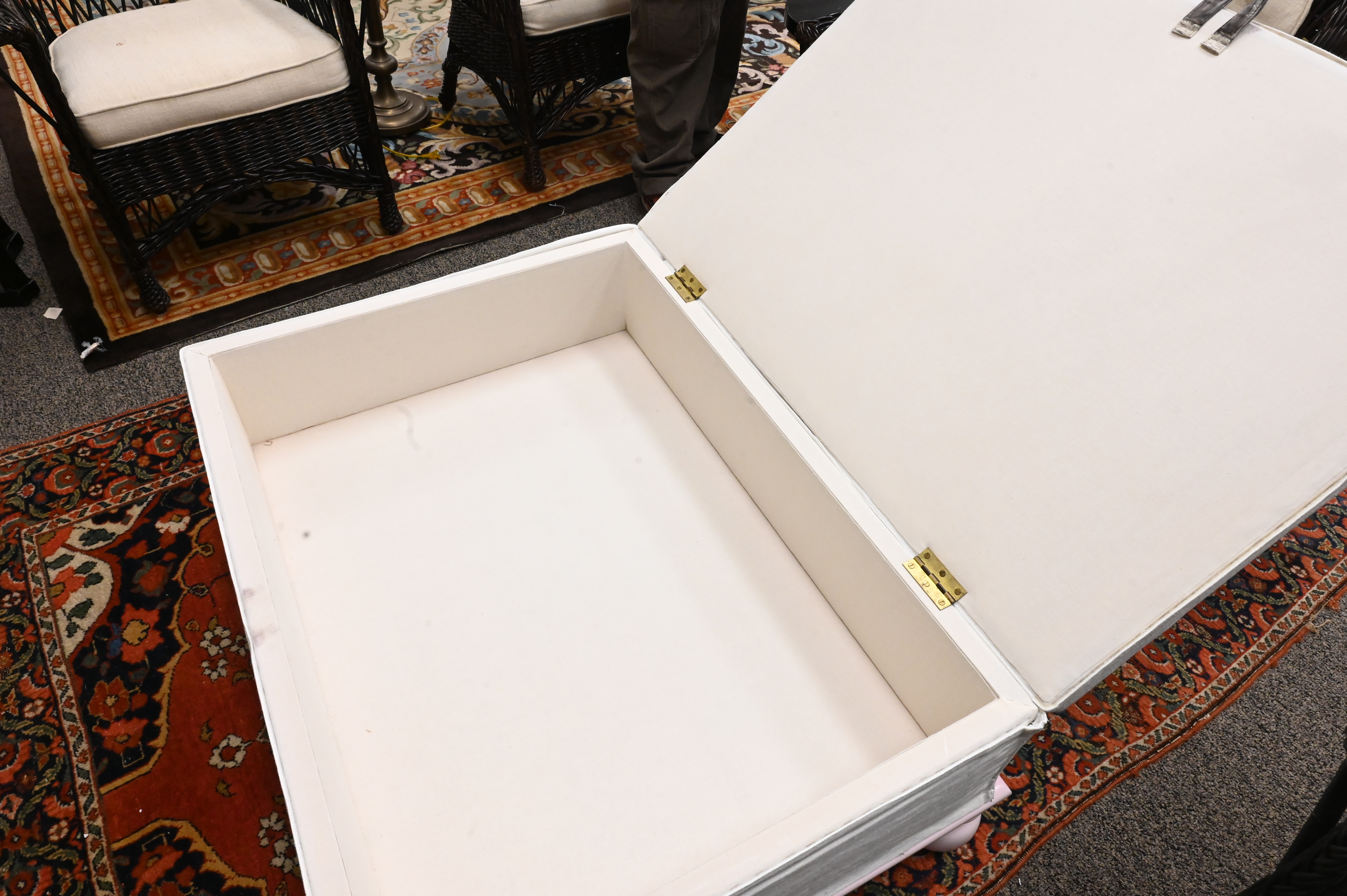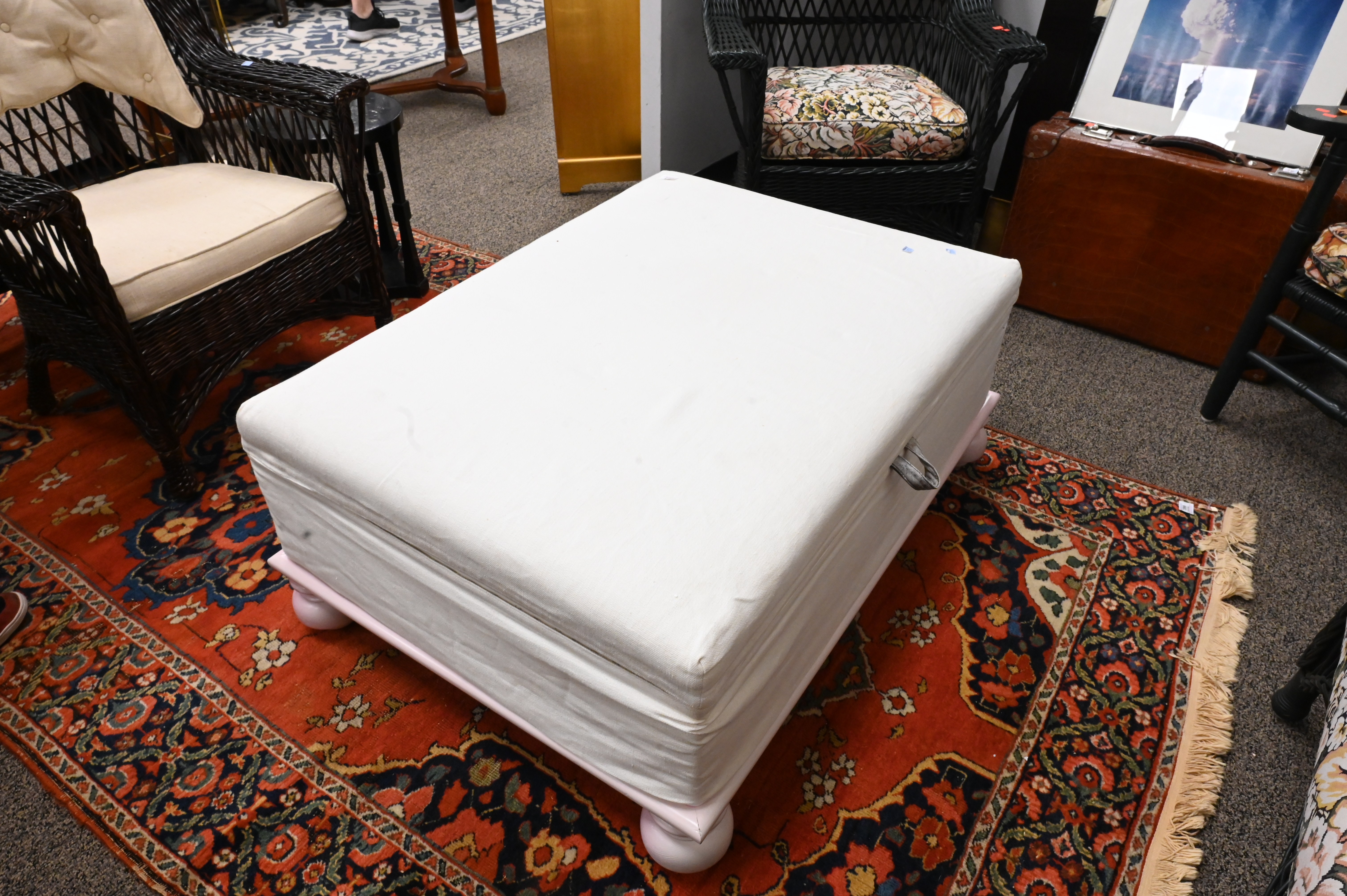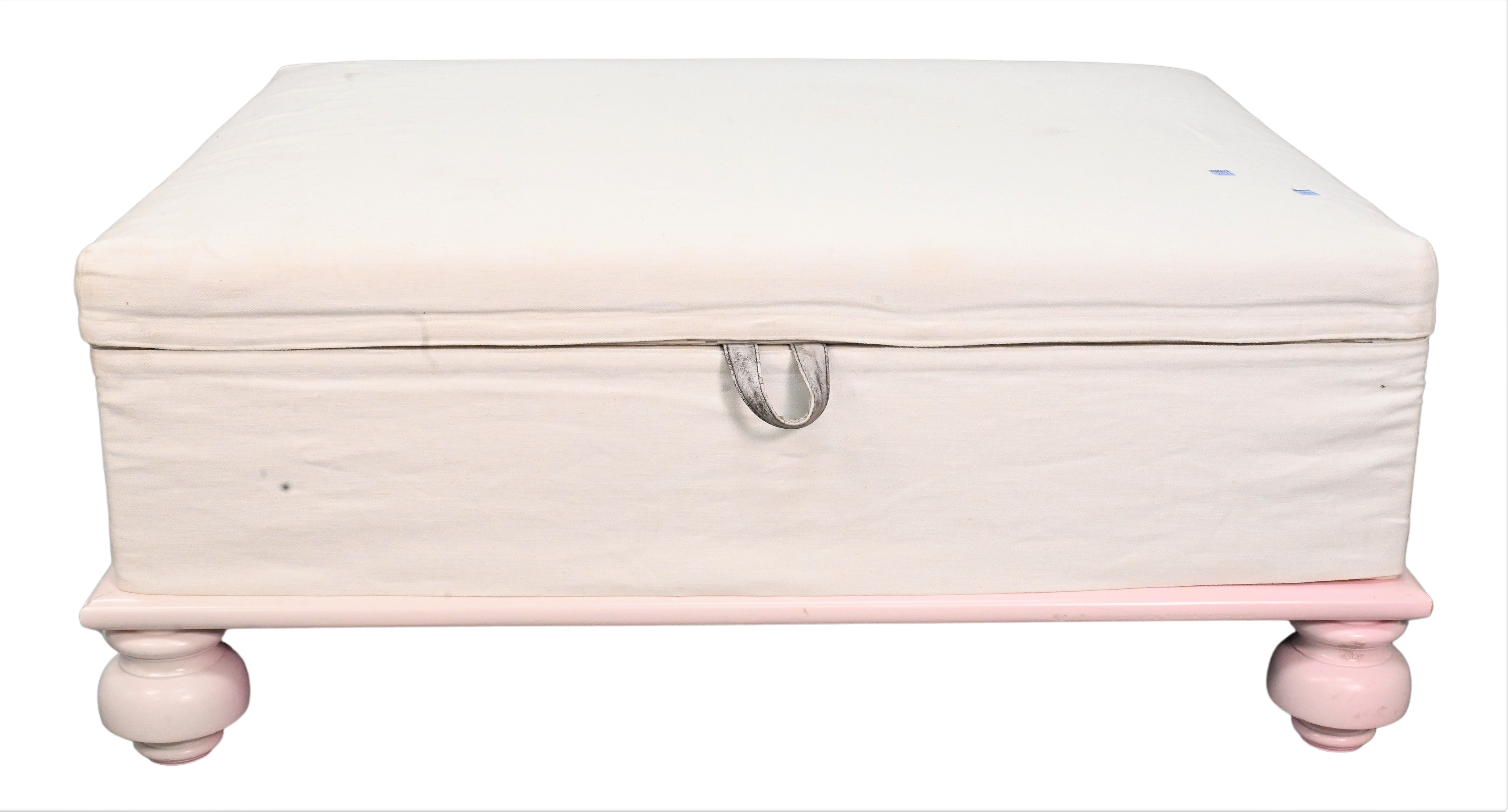 George Smith Lift Top Ottoman, having interior storage, bearing brass tag and set on ball feet, height 17 1/2 inches, top 30″ x 40″.