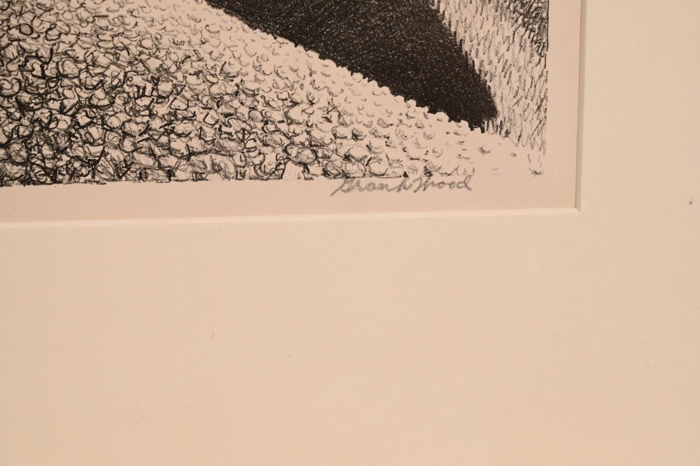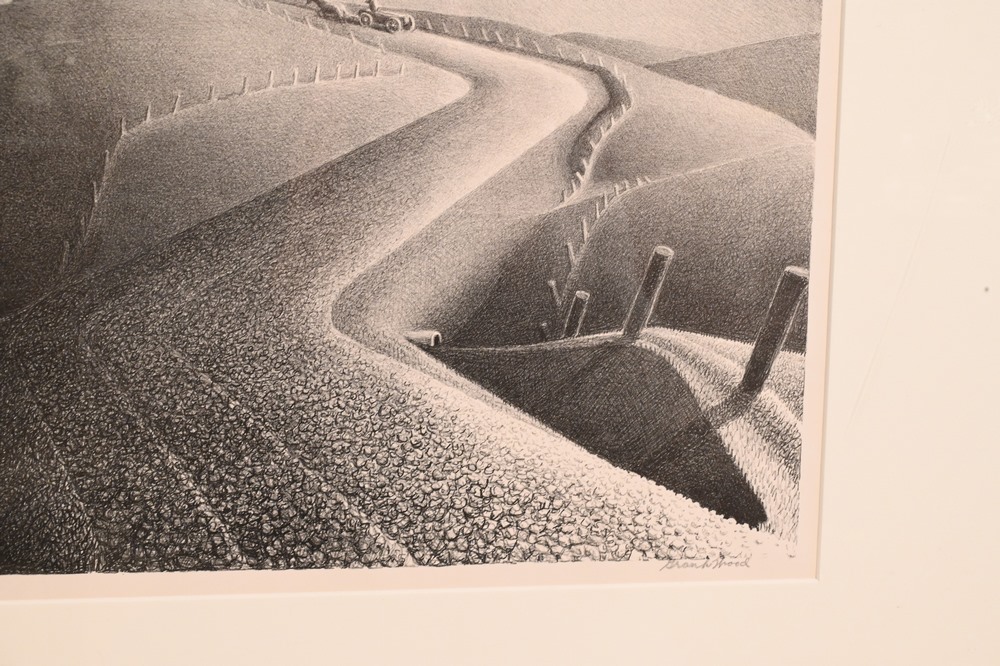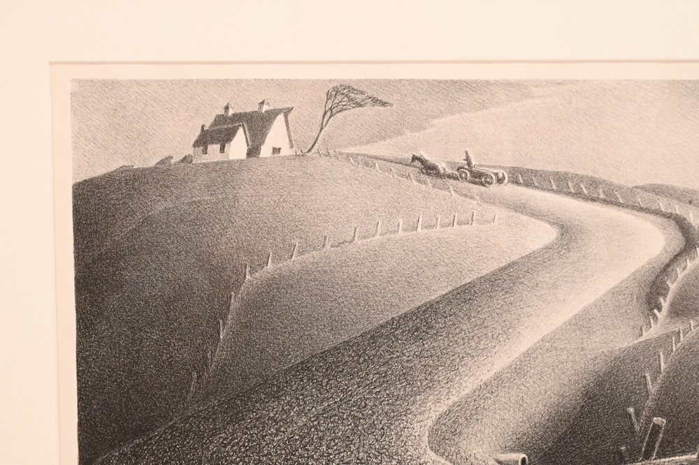 Grant Wood (1891 – 1942), March, 1939, lithograph on Rives, signed in pencil Grant Wood, edition 250, published by Associated American Artist, New York, 9″ x 11 7/8″, sheet size 11 1/2″ x 15″. Exhibited: Austin, Texas, The Archer M. Huntington Art Gallery, College of Fine Arts, The University of Texas at Austin, The Fath Collection: Selected prints from the United States and Mexico, 1915 – 1950, May 15 – July 6, 1986, no. 87. C The Creekmore and Adele Fath Charitable Foundation Collection. Sold at Doyle’s, New York, November 8, 2011, #263. Condition: Pale matstain, matsstain line, old paper tape and glue staining at top sheet corners, very minor printer’s ink in the margins and verso, otherwise in good condition, with full margins, framed.