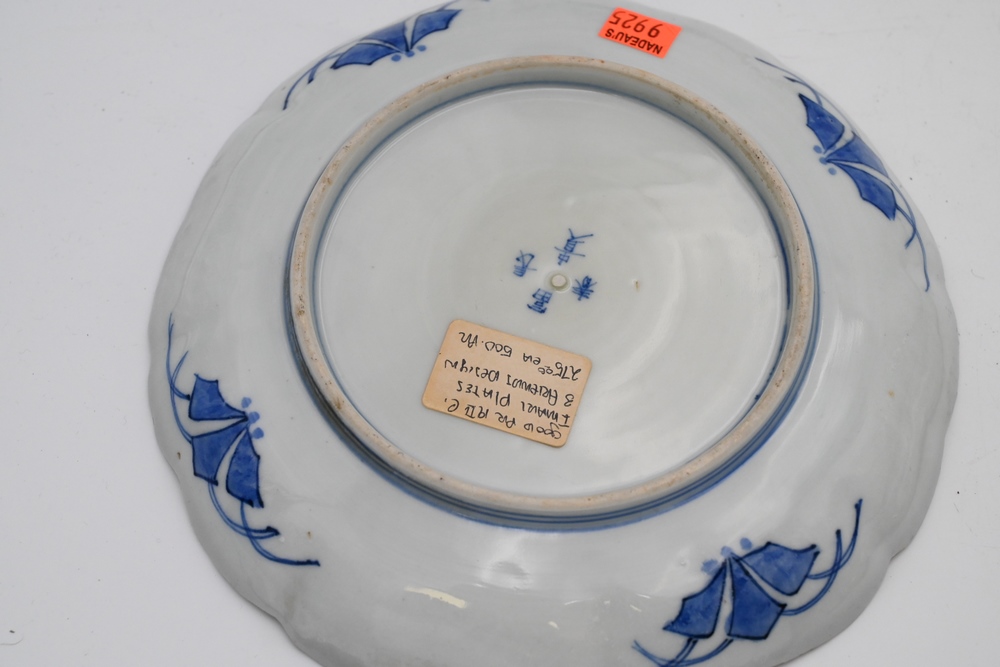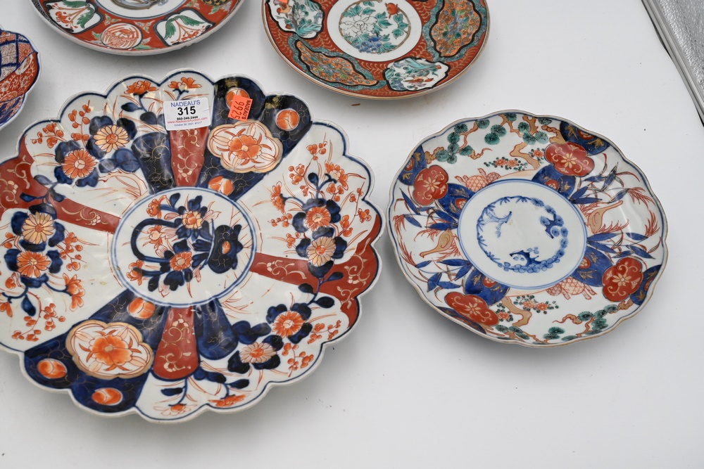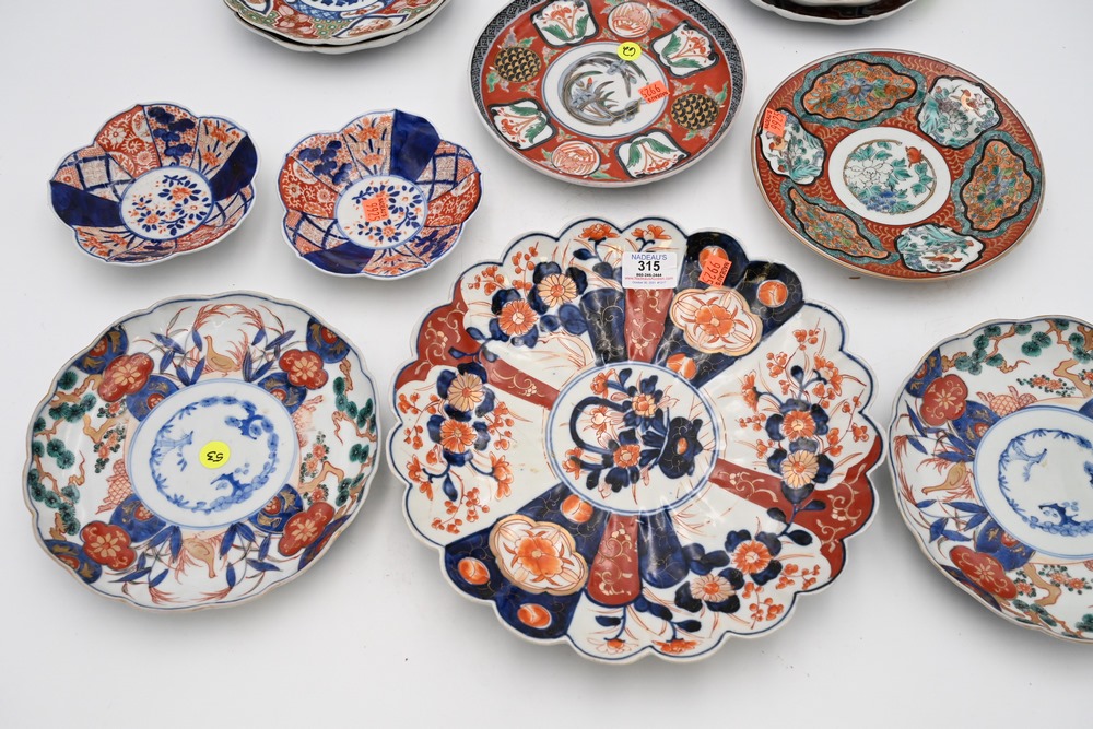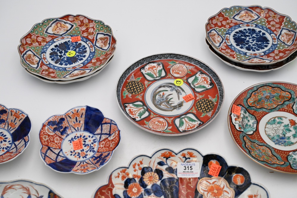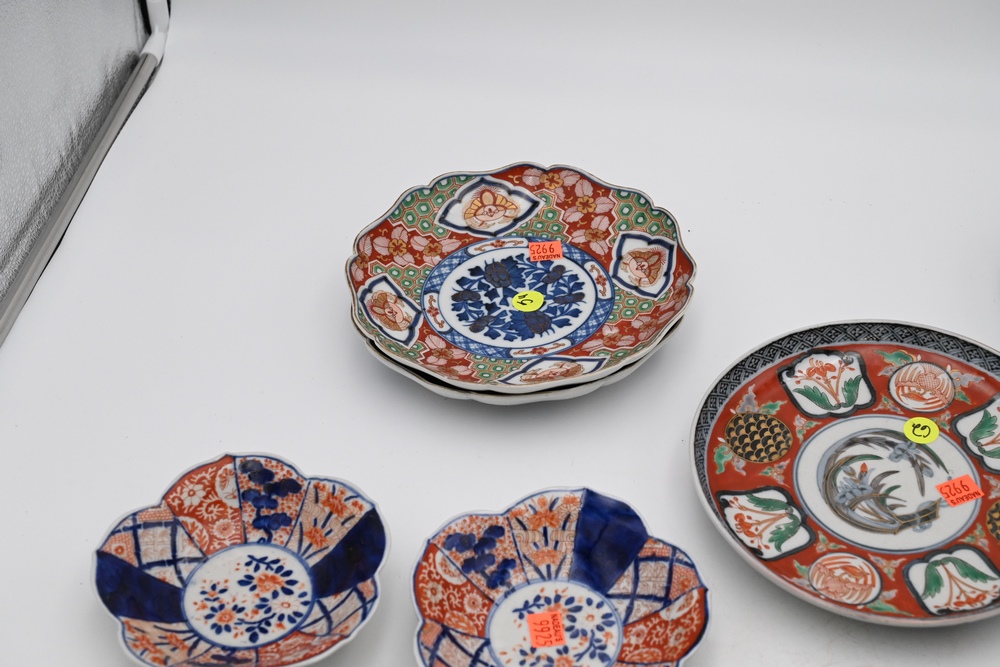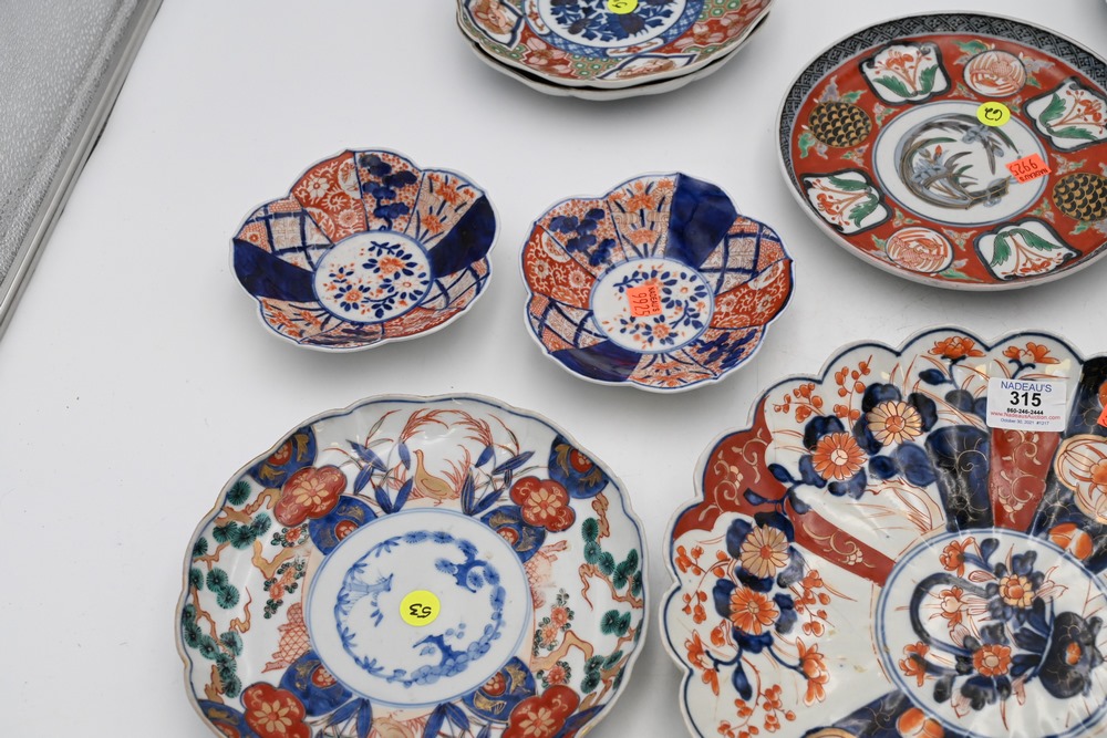 Lot 315: Group of 11 Imari Porcelain Dishes to include a set of 4 plates, signed on bottom diameter 8 3/8 inches; charger having scallop edge (cracked), diameter 12 inches; a pair of small bowls or saucers, a pair of 19th century plates, having four character mark on bottom 2 Imari porcelain plates, having six character marks on bottom Provenance: From a private New York City collection.