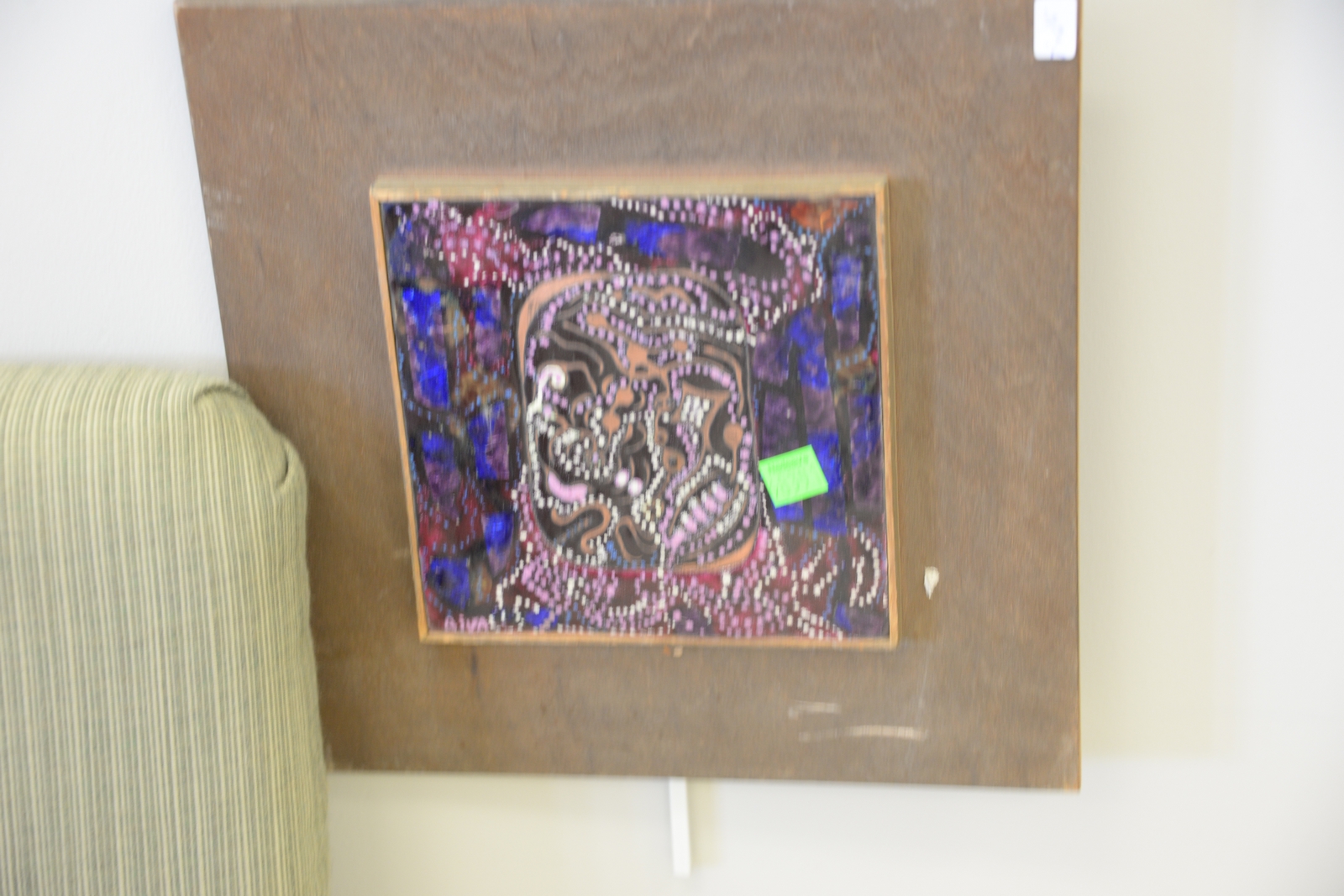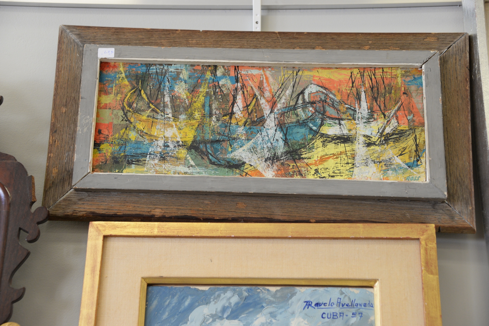 Group of four framed pieces to include Shlomo van der Berg still life oil on canvas of flowers signed Von der Berg 64, copper enameled plaque Aiva, oil on masonite abstract signed Ross, and oil on board Cuba 57 signed Ravelo Avellaneda. 7 x 6 3/4 to 13 x 10