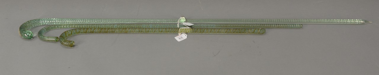 Group of three American art glass parade canes, all swirl clear glass. lg. 29 in., lg. 39 in., and lg. 54 in.