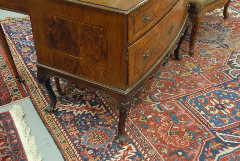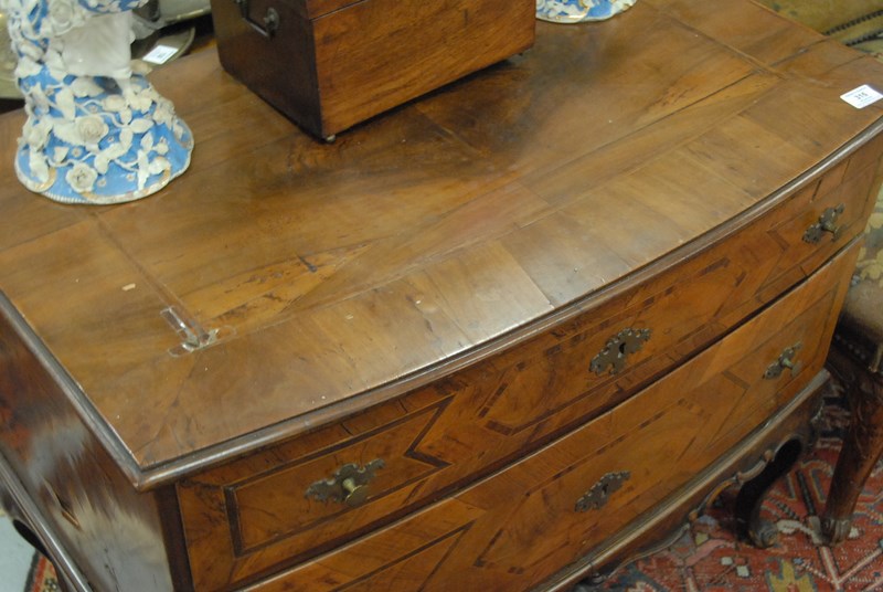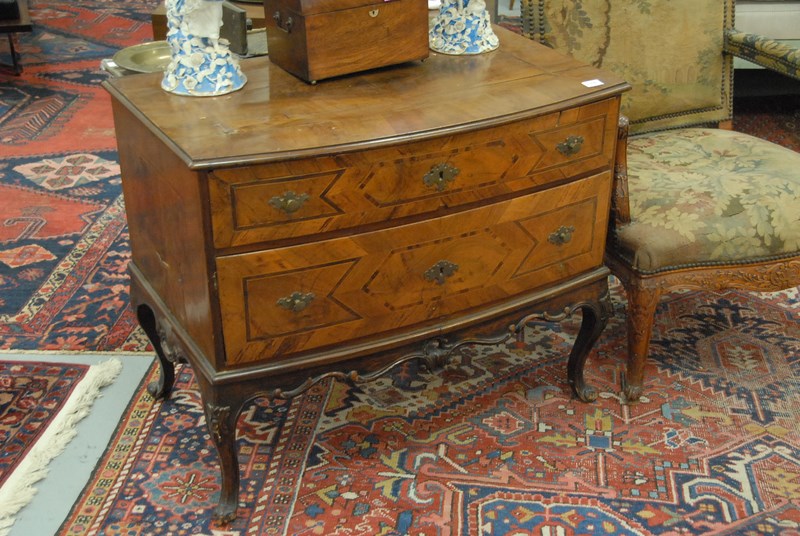 Lot 315: Louis XV commode with inlaid top and front having two bow front drawers all set on carved cabriole legs, 18th century restored. ht. 30in. wd. 35in.