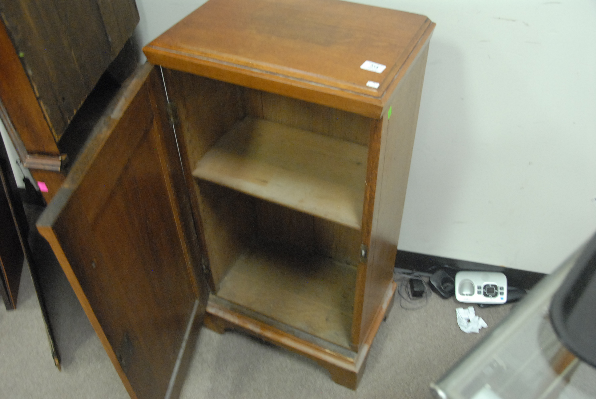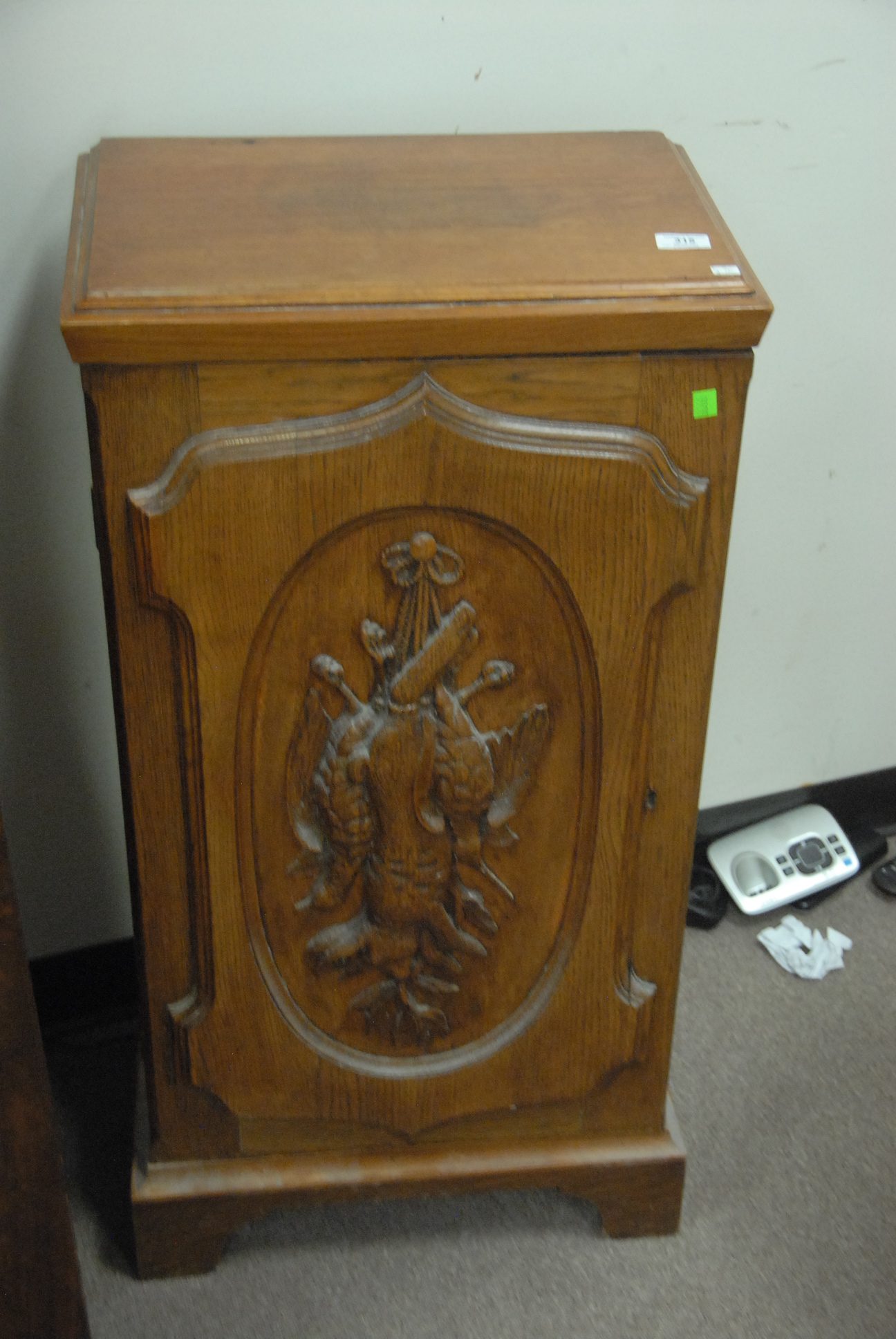 Oak cabinet with carved door. ht. 38 in. wd. 19 in.