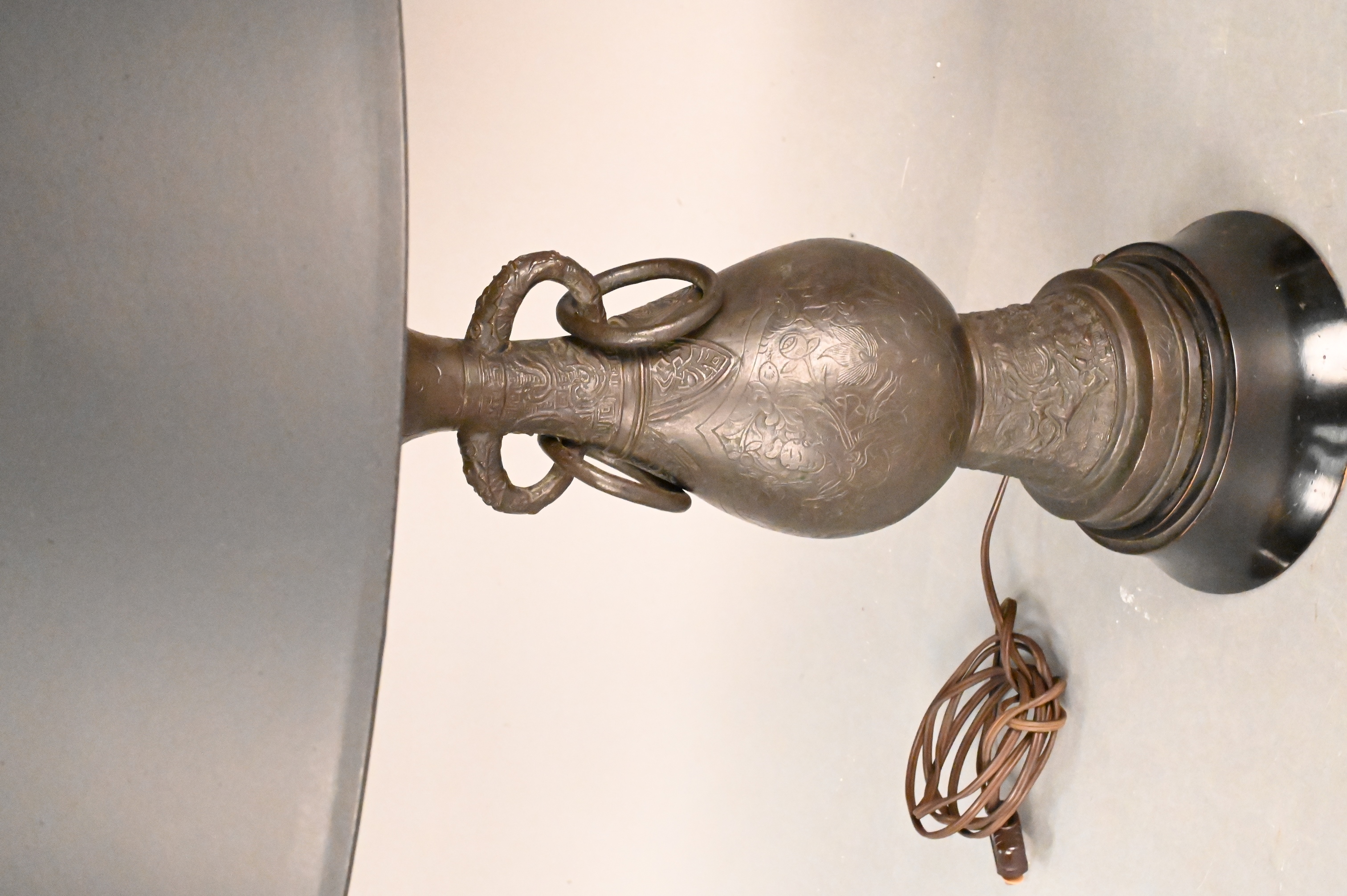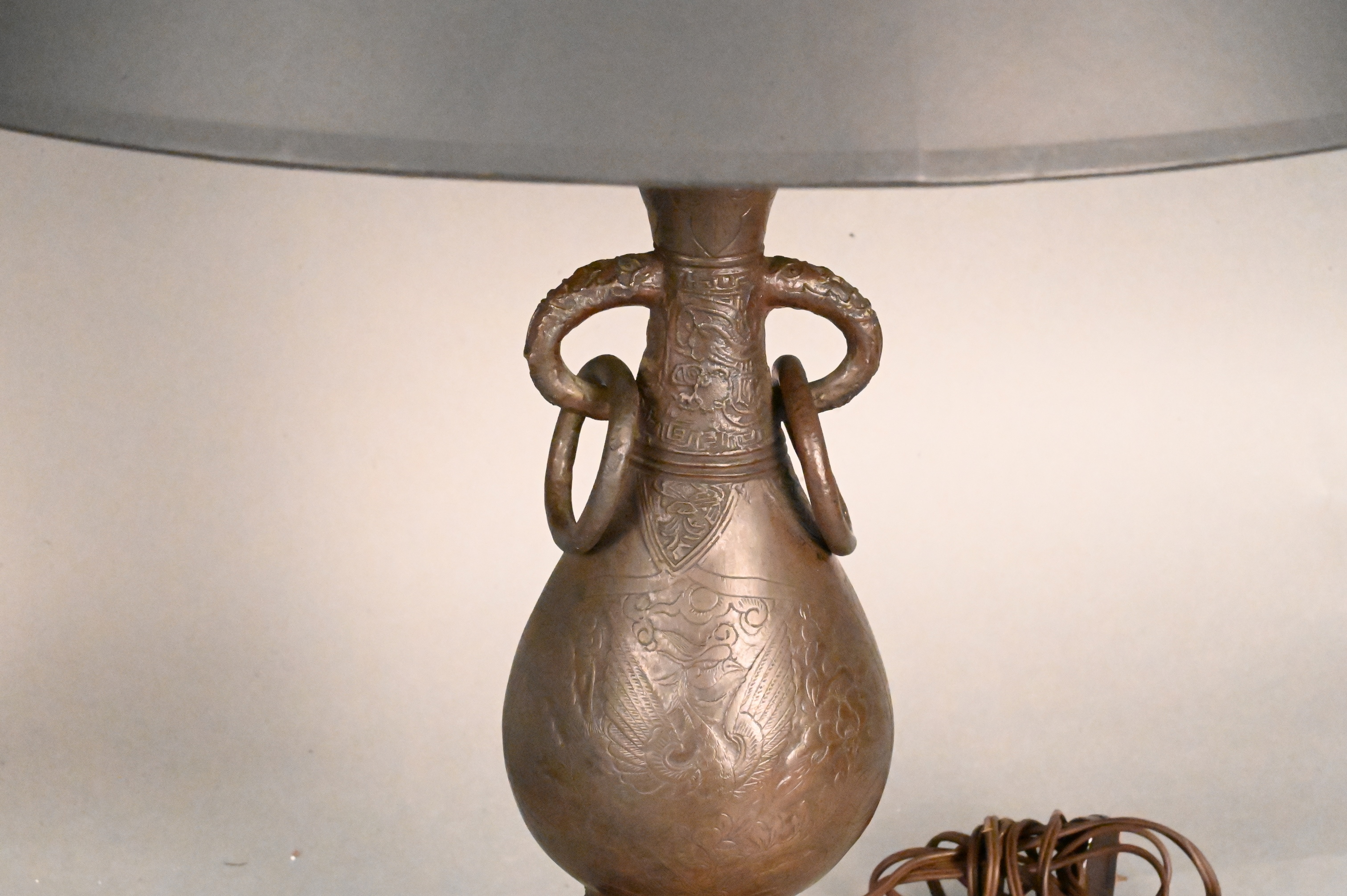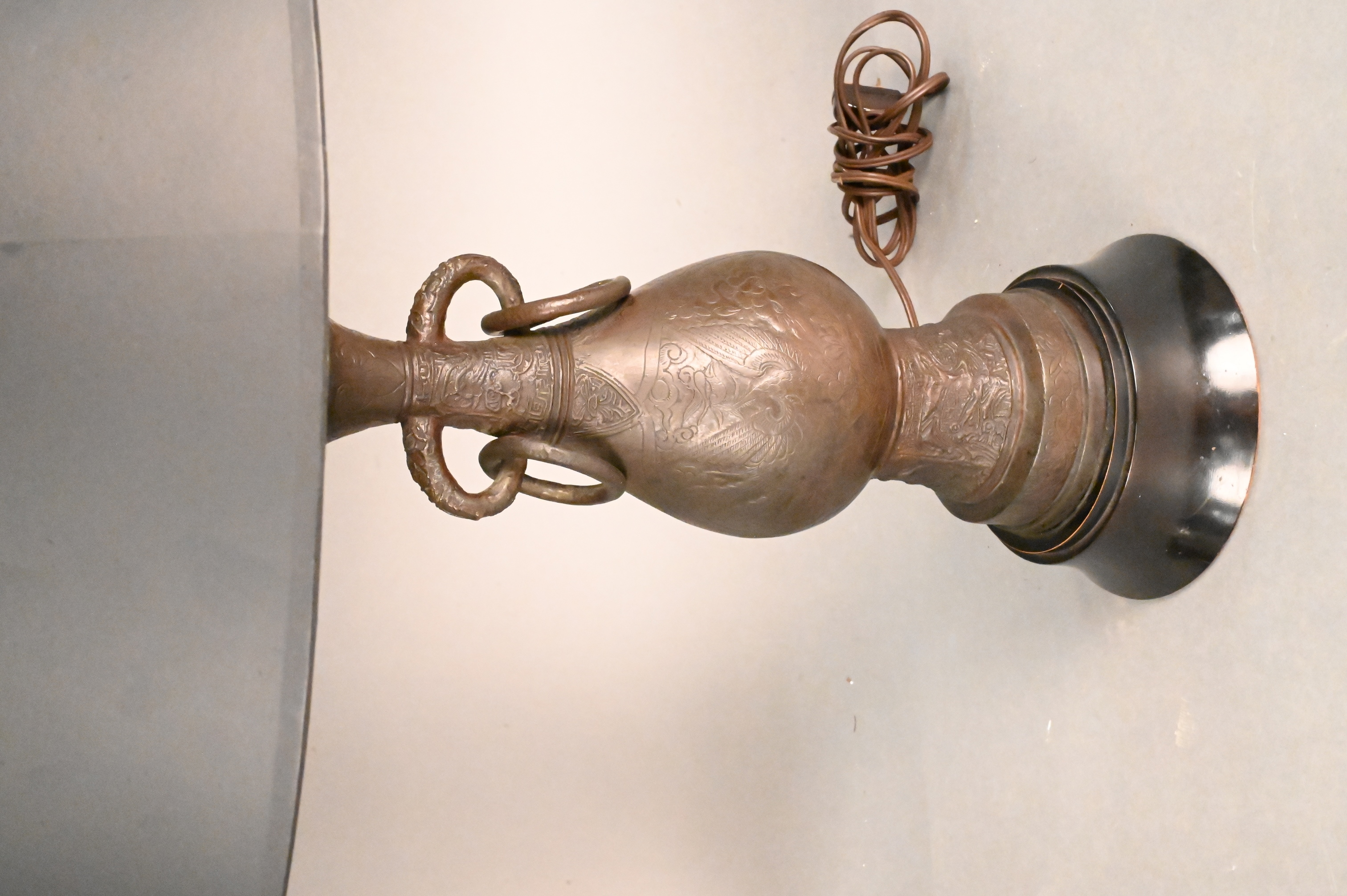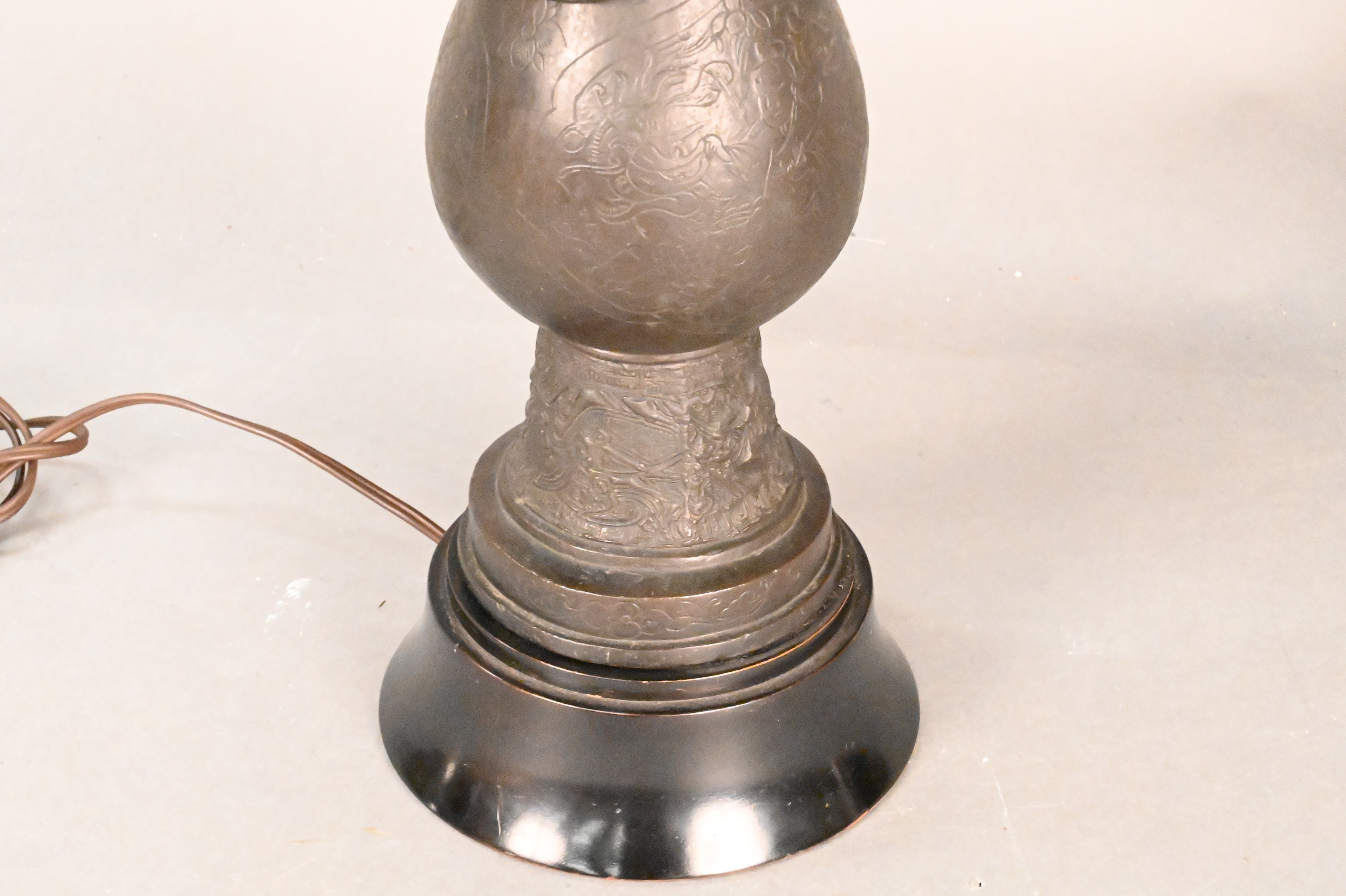 having ring handles made into table lamps, each incised with scrolling vine, floral, phoenix, and buddha motif