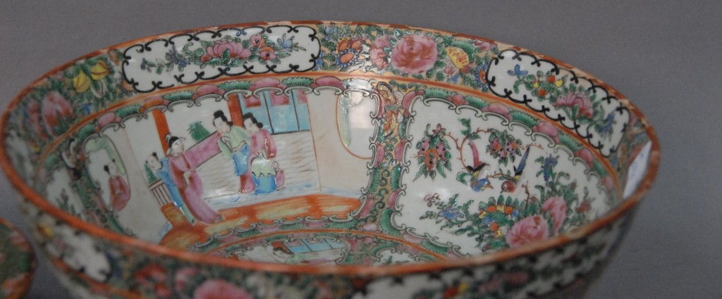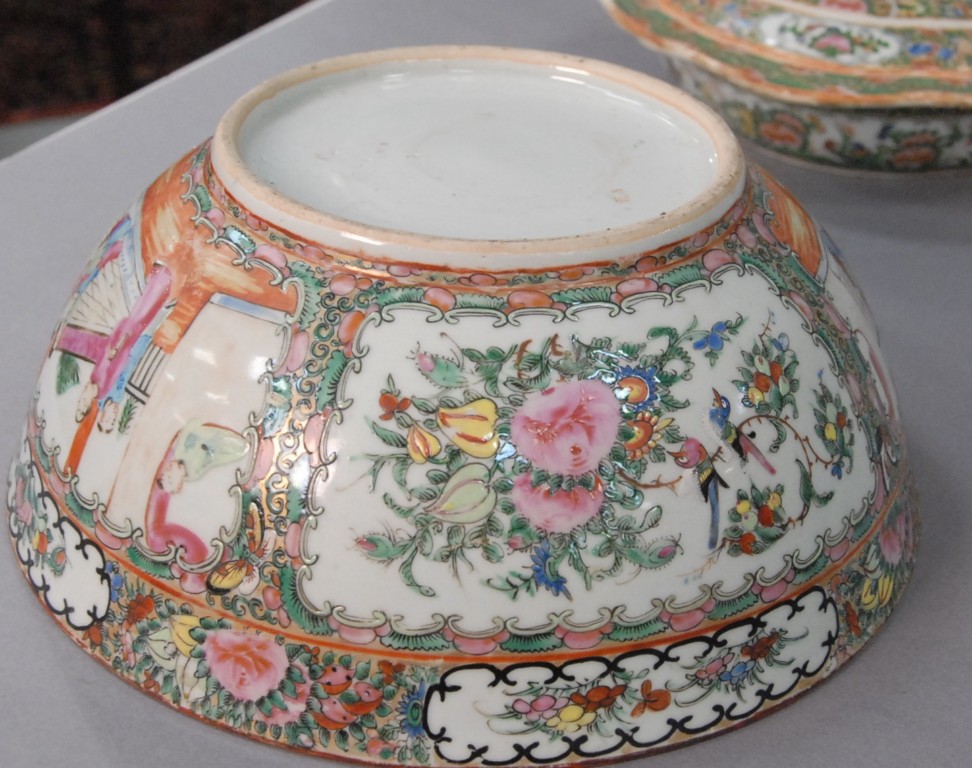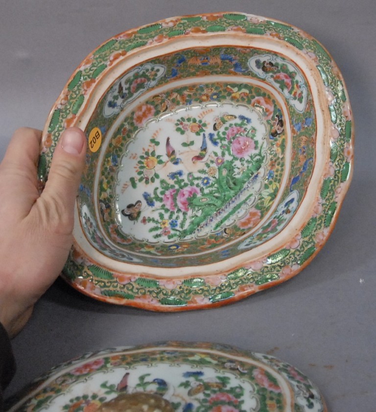 Rose Medallion two piece lot center bowl and covered vegetable dish. Center bowl: diameter 11 1/2in. vegetable dish: length 11in.