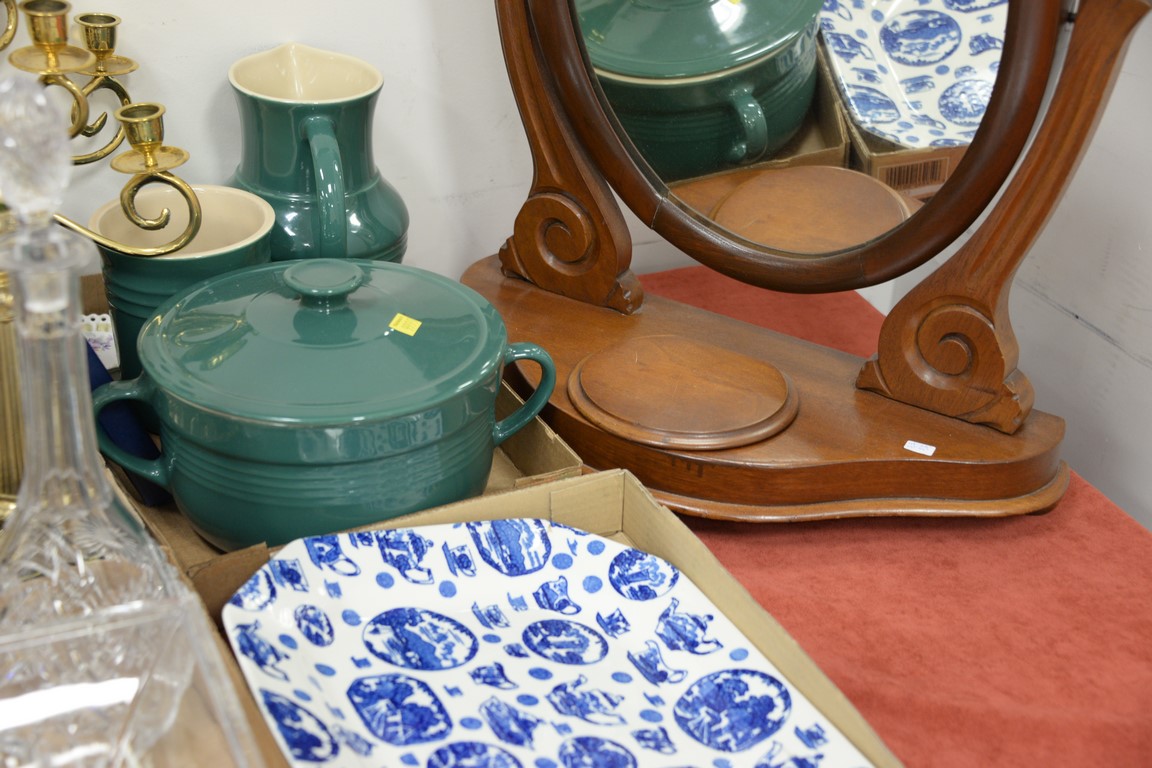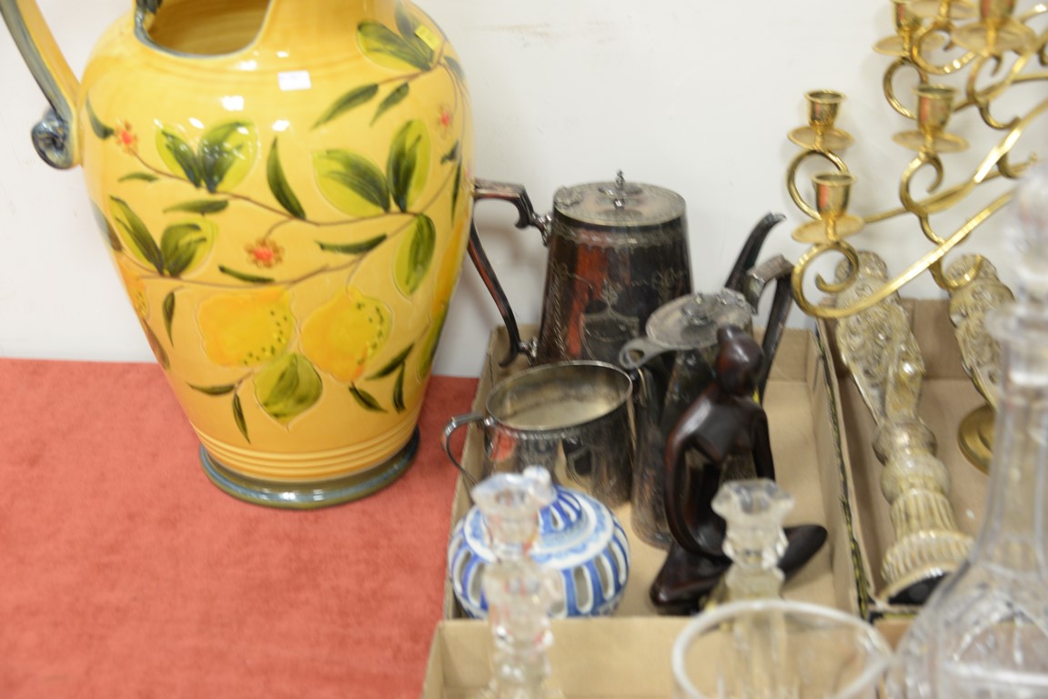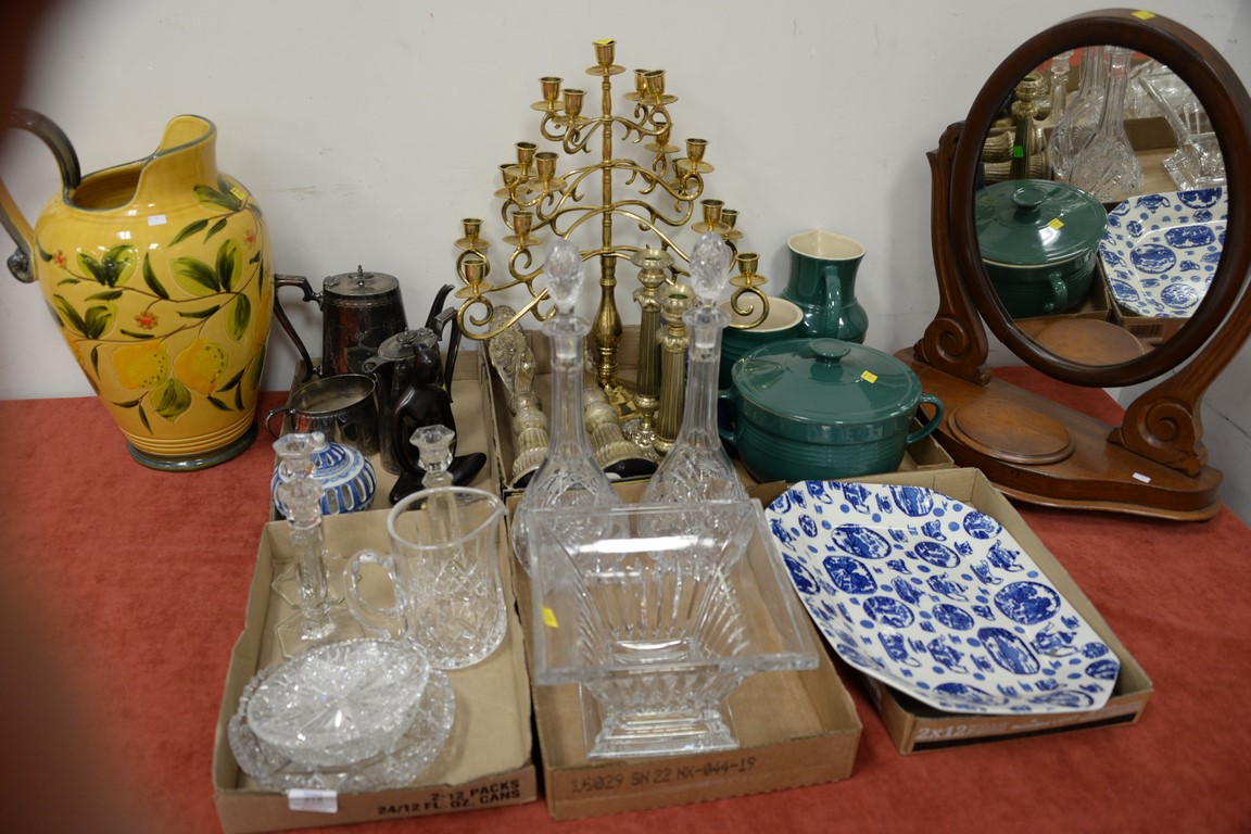Six box lots to include crystal, silverplate tea set, vanity mirror, candlesticks, bottles, etc.
