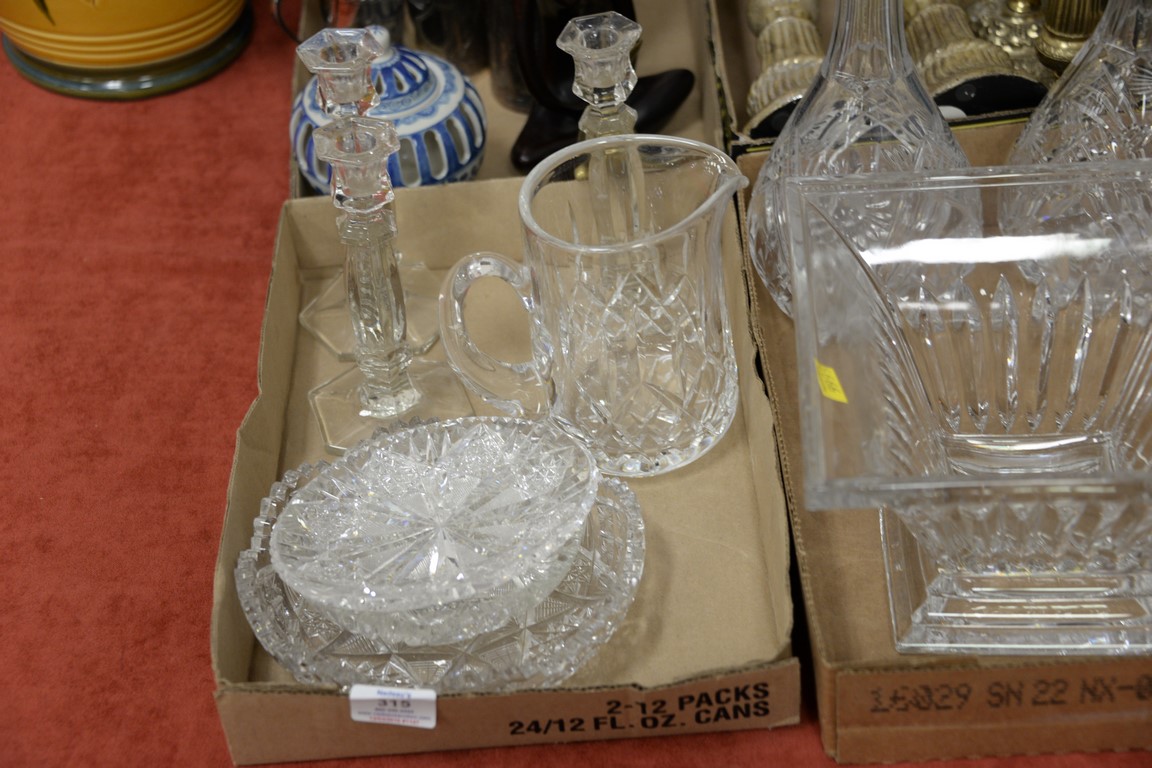 Lot 315: Six box lots to include crystal, silverplate tea set, vanity mirror, candlesticks, bottles, etc.