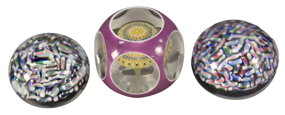 Three Baccarat Millefiori Glass Paperweights, to include a double overlay mushroom paperweight having purple exterior, numbered 137 on the underside; along with two scrambled Millefiori paperweights, both marked to the underside, diameter 2 3/4 and 2 5/8 inches. Provenance: Estate of James Wadhams.