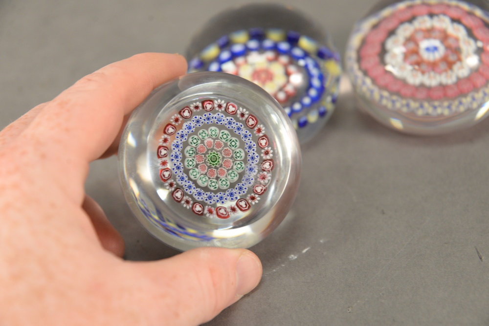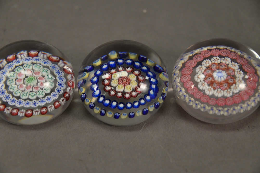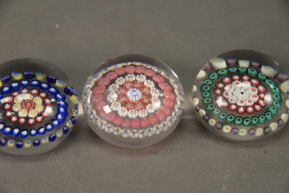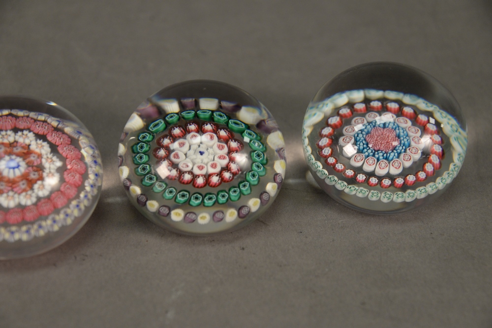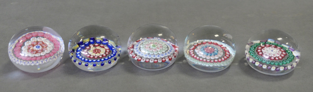 Five Baccarat Millefiori Glass Paperweights, each having five rows of flowers, each marked to the underside, height 2 inches, diameter 2 1/2 inches. Provenance: Estate of James Wadhams.