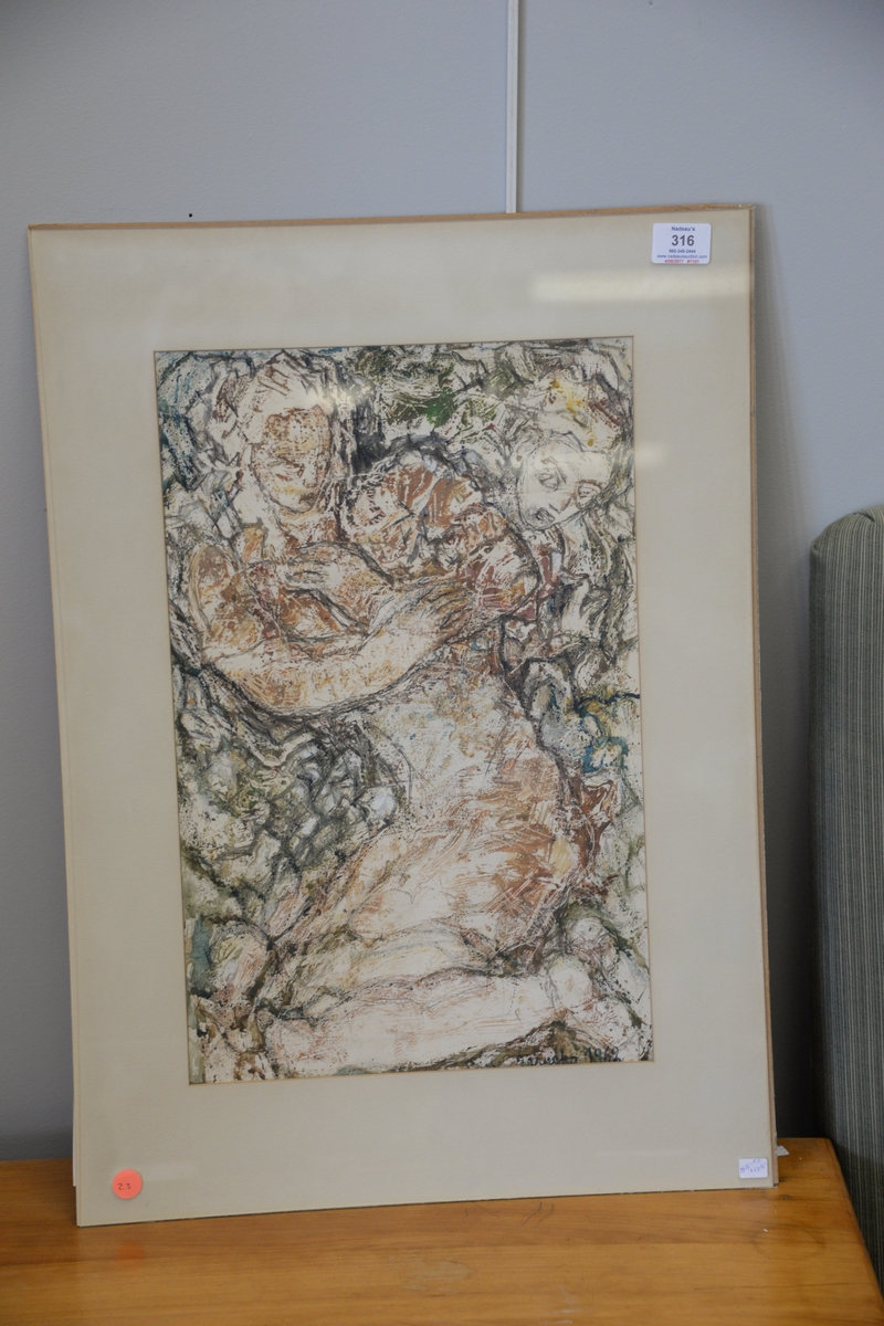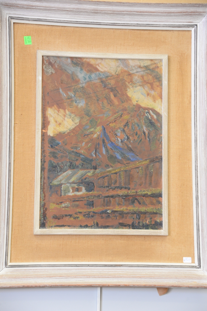 Five piece lot to include Abstract oil on board initialed lower right C.K.O., an oil on board city scene unsigned, Abstraction mountainous landscape signed lower right M. Pa…, oil on canvas landscape, and watercolor abstract Sarucka. 16 x 22 to 28 x 20