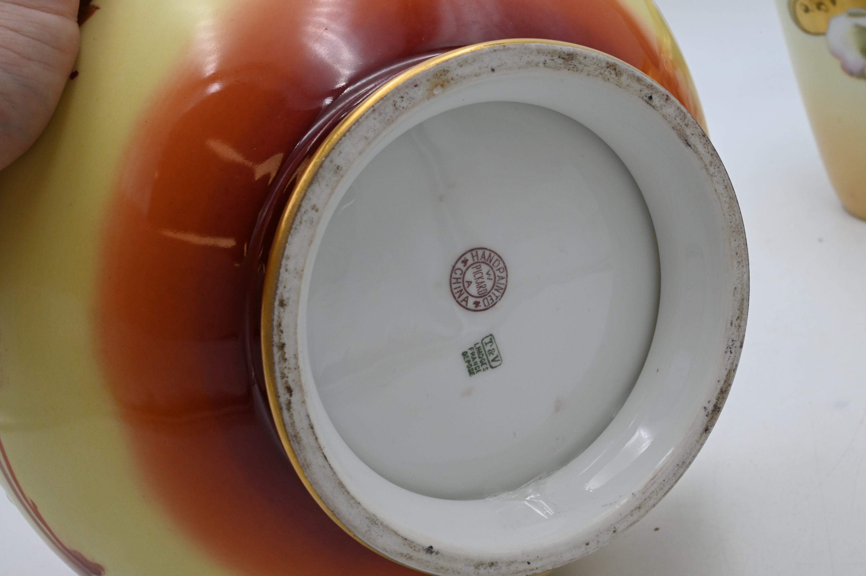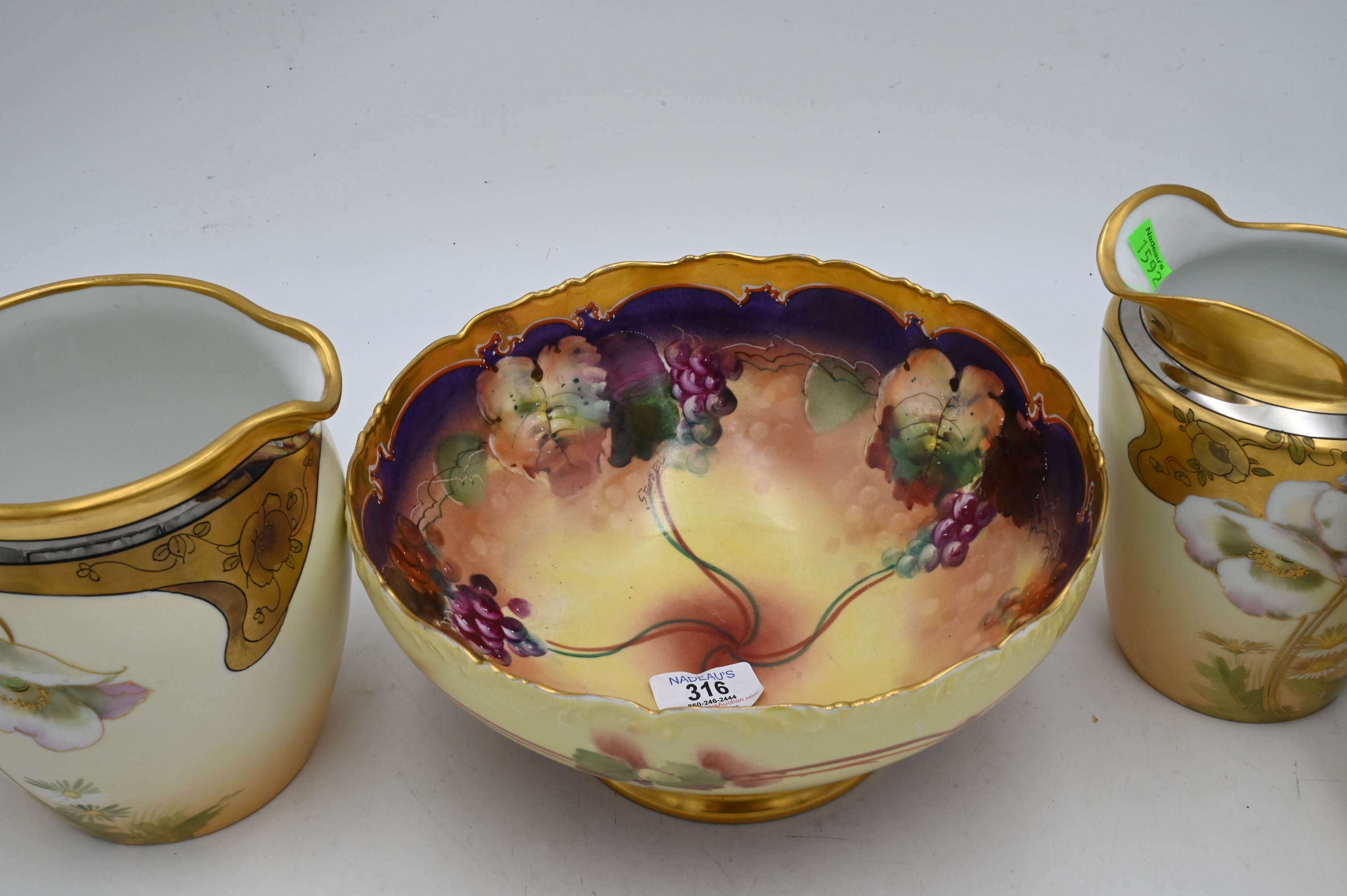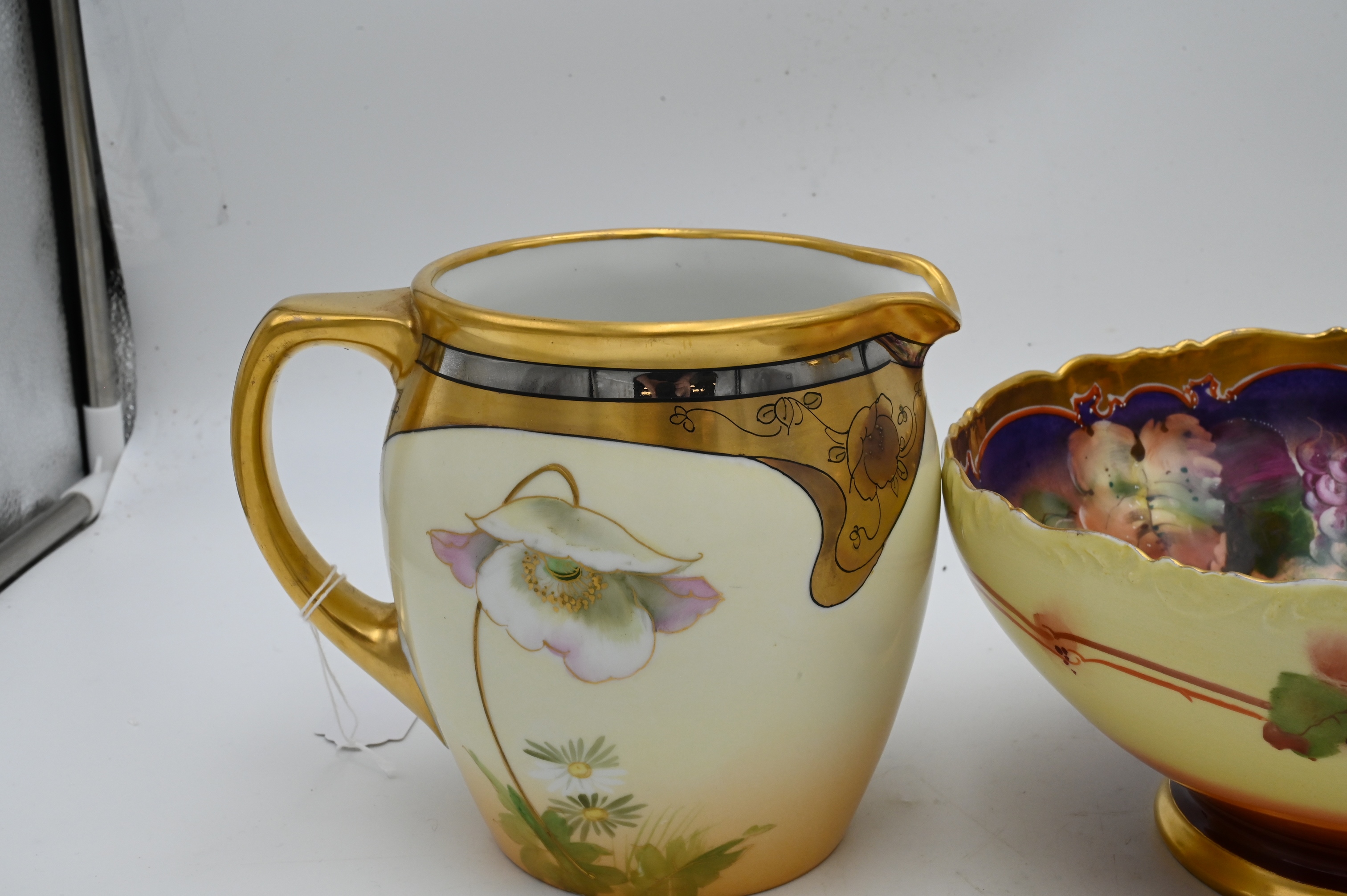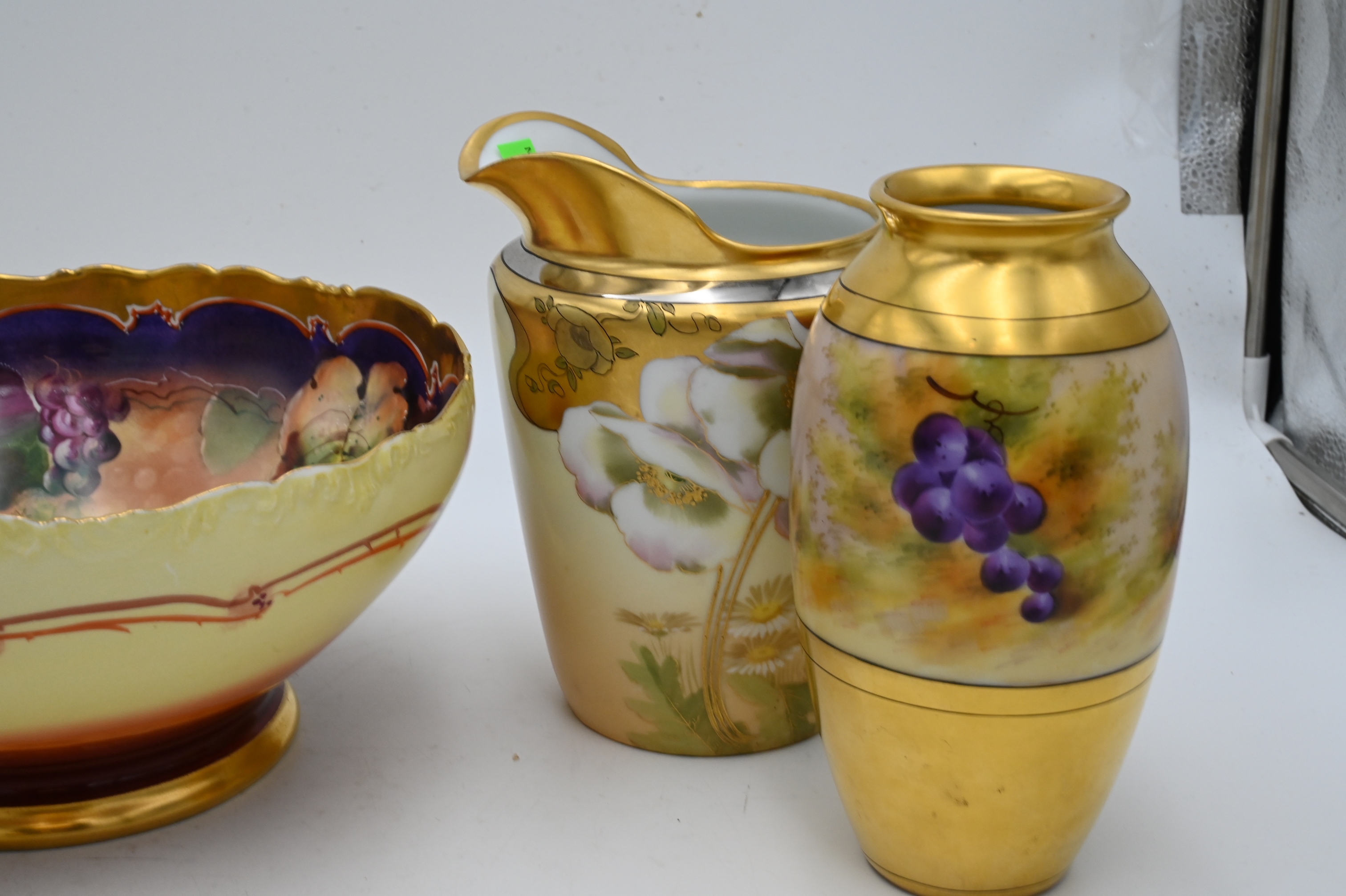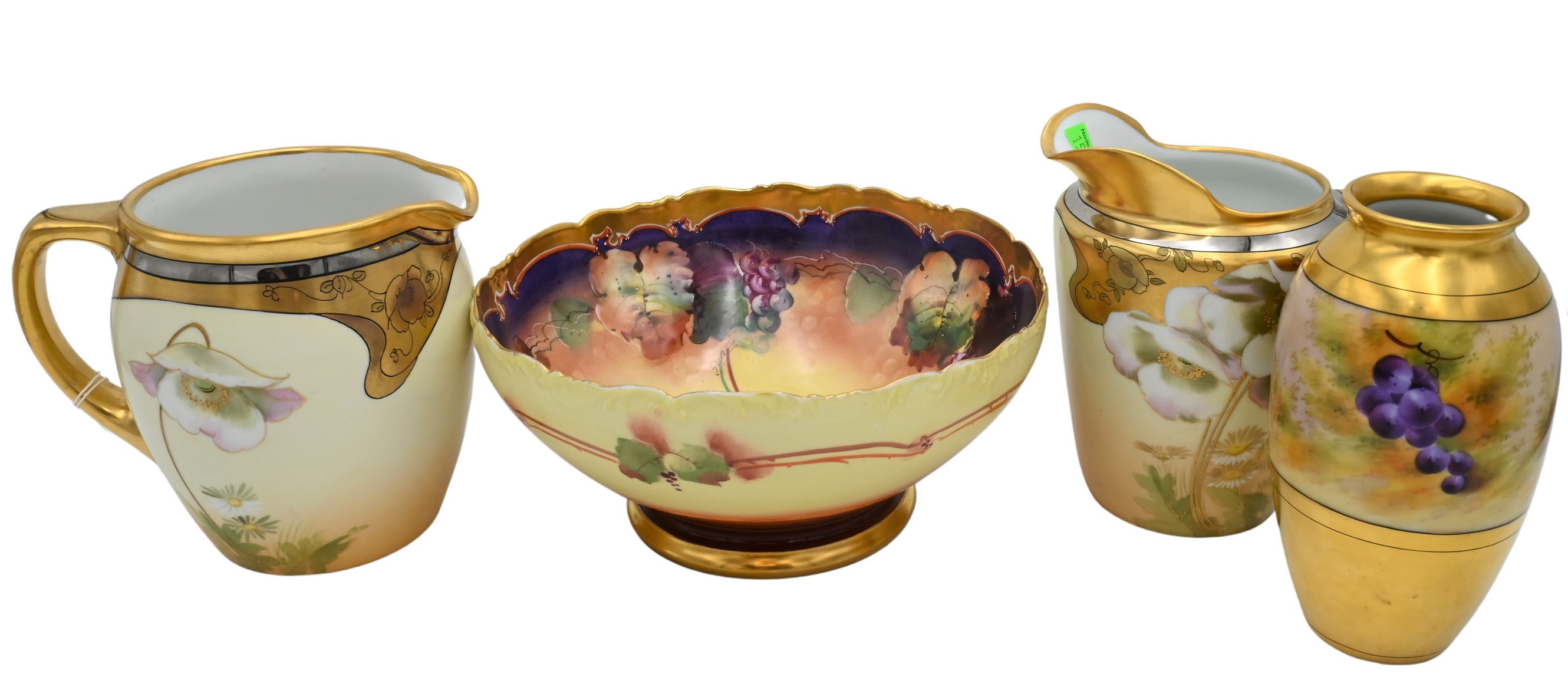 Four Pickard Porcelain Pieces, fruit bowl, small vase gold gilt painted with fruit, pair of matching pitchers, tallest piece 6 1/2 inches.