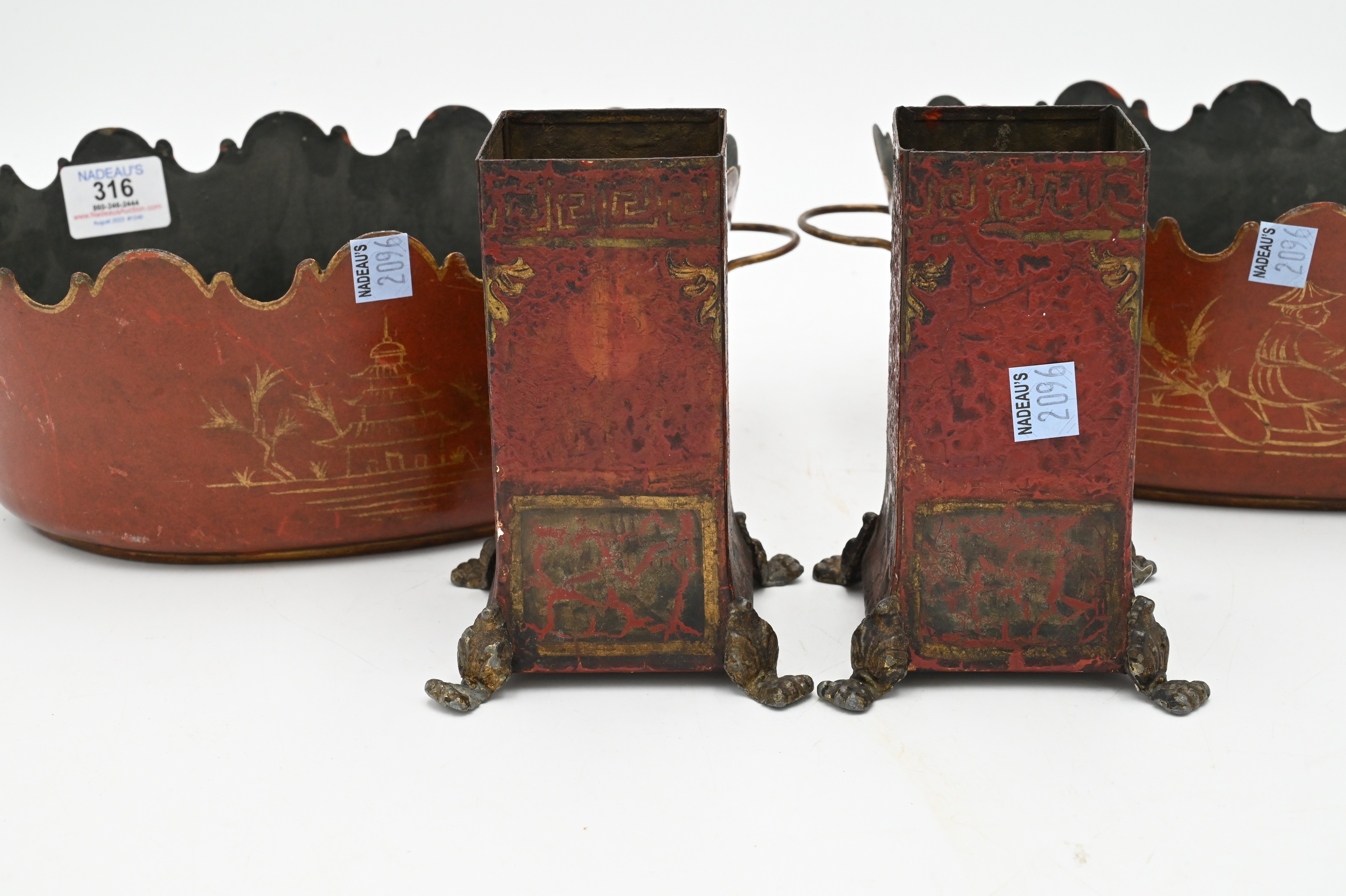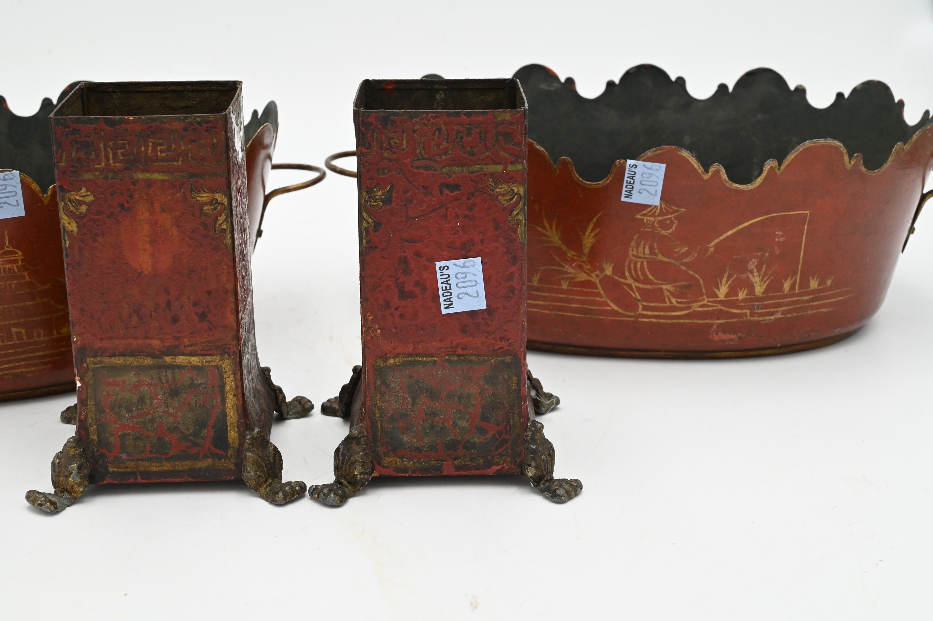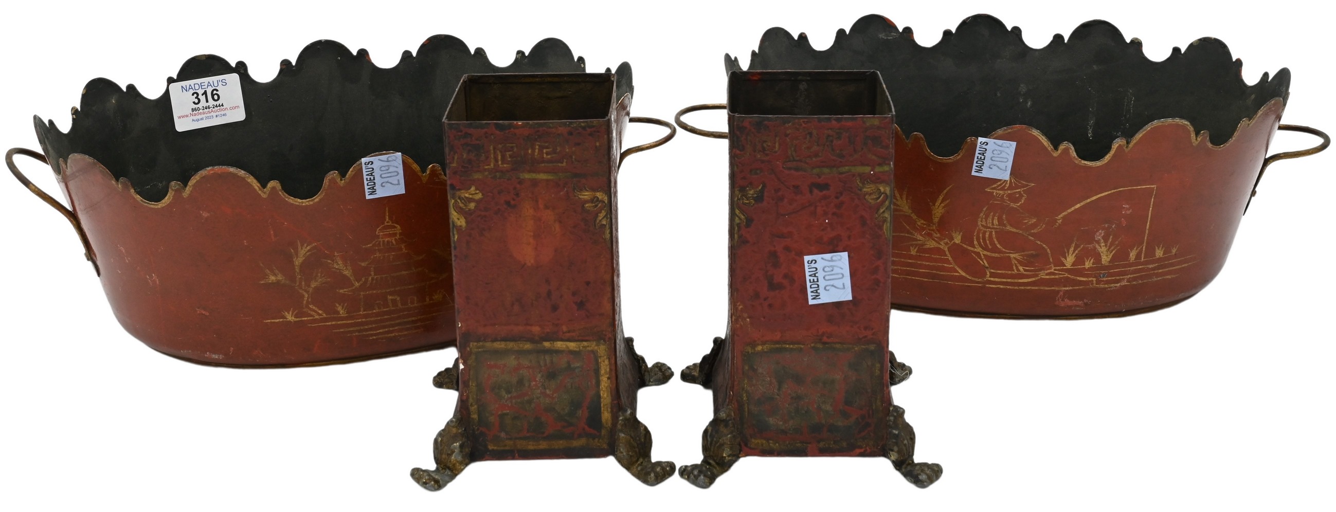 Four Piece Red Painted Tole Group, to include a pair of oval planters, having scallop rim and handles, length 11 inches, height 4 inches, along with a pair of small vases on claw feet, height 6 inches.