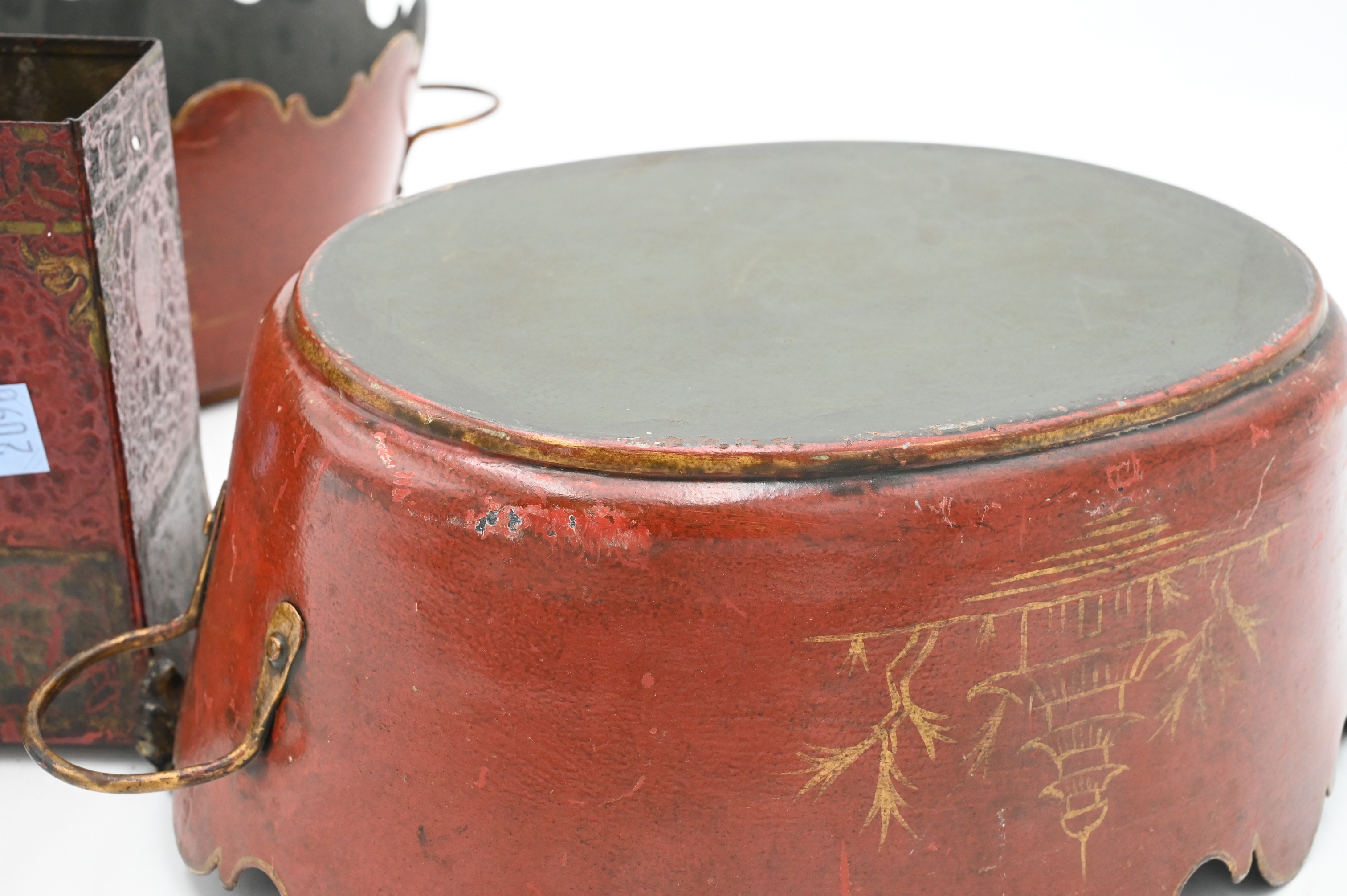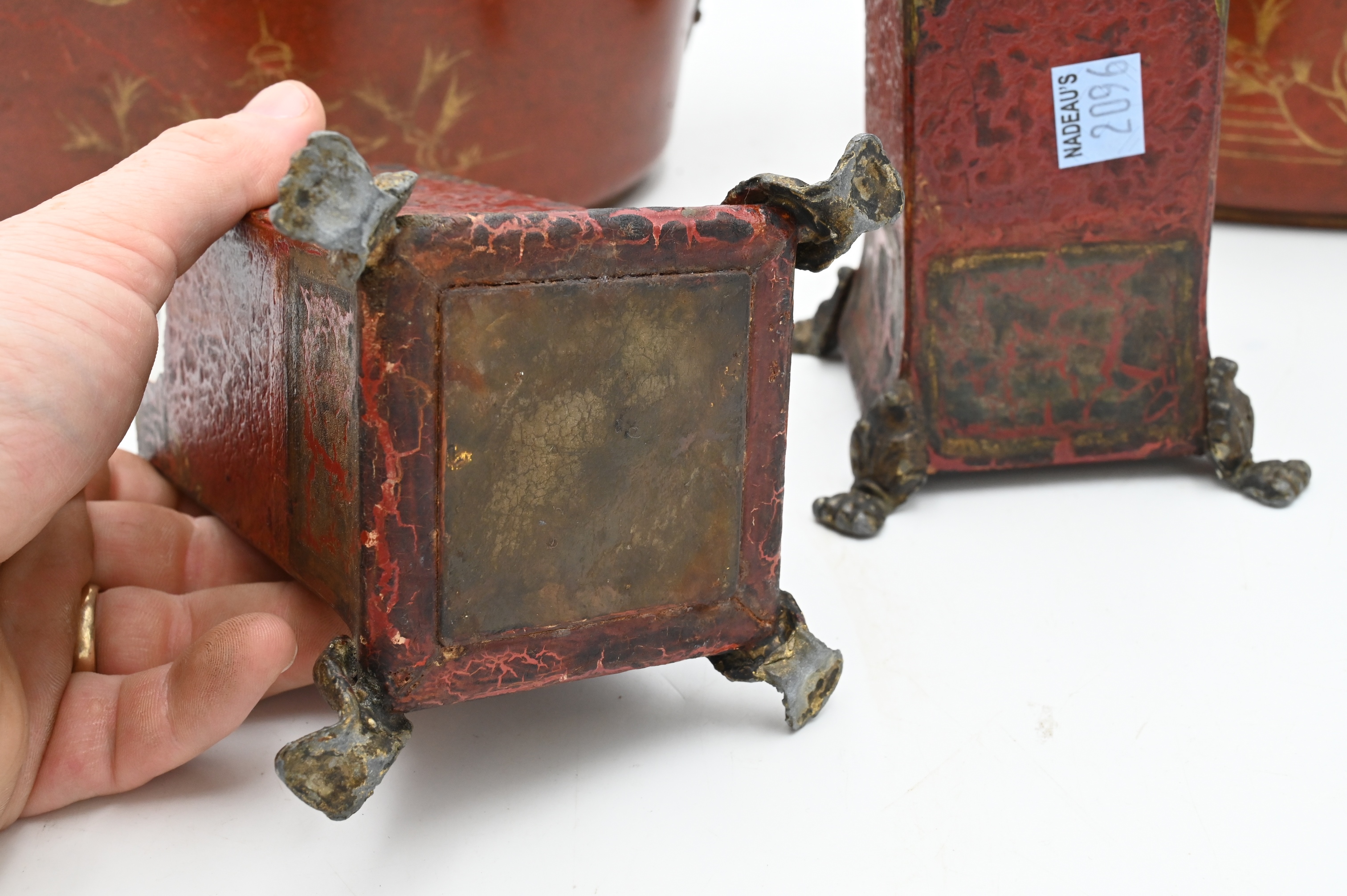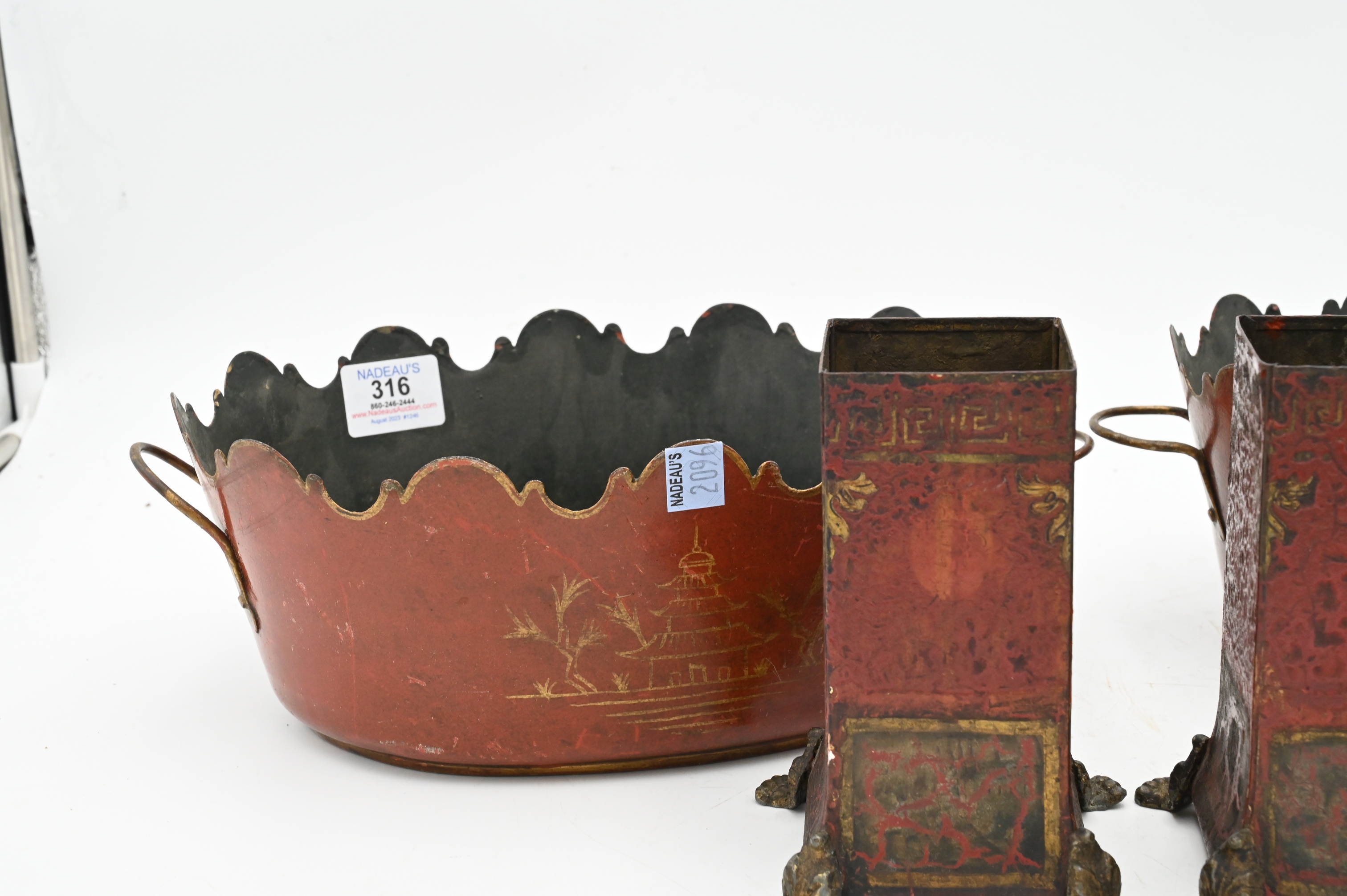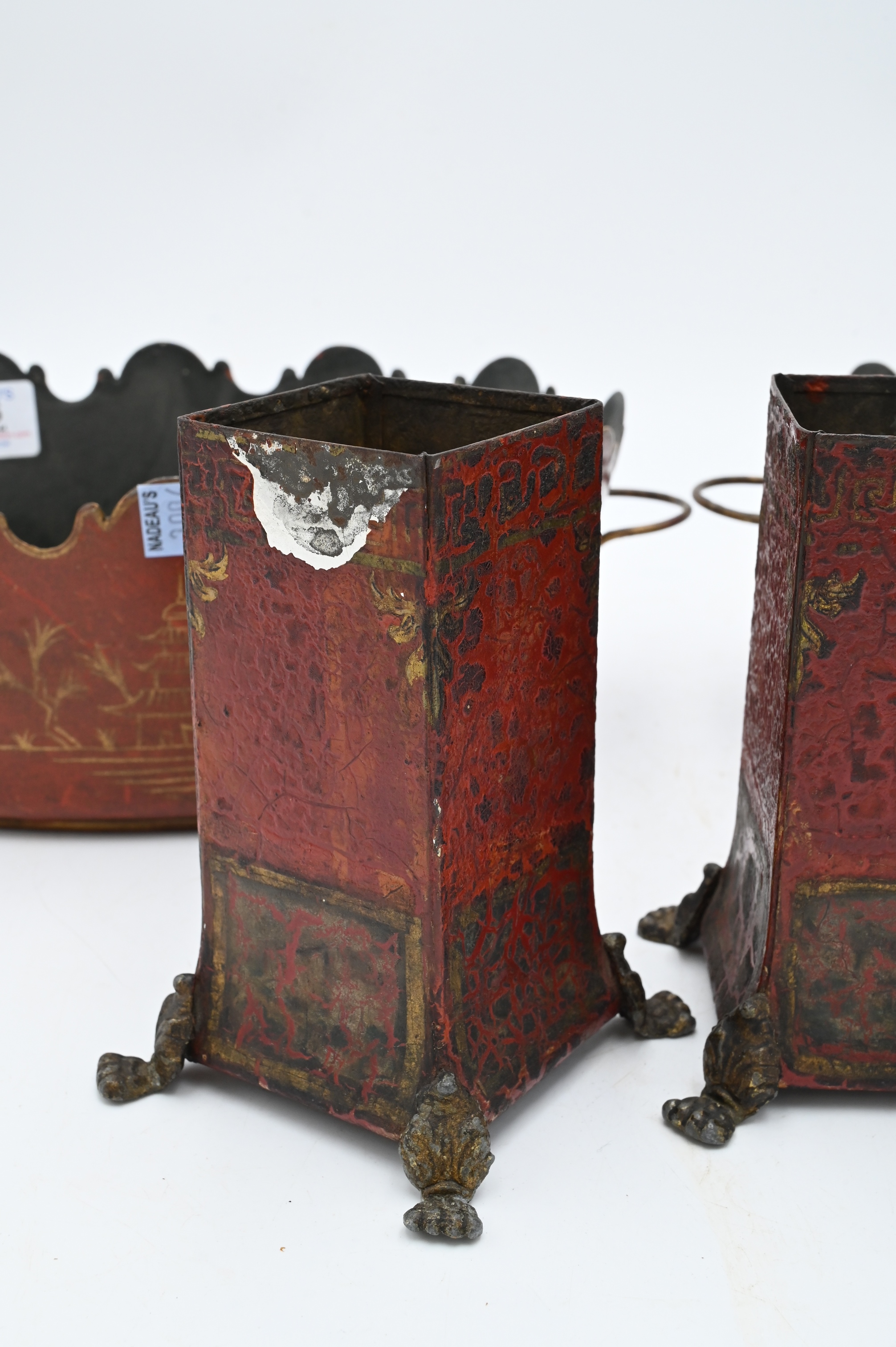 Four Piece Red Painted Tole Group, to include a pair of oval planters, having scallop rim and handles, length 11 inches, height 4 inches, along with a pair of small vases on claw feet, height 6 inches.