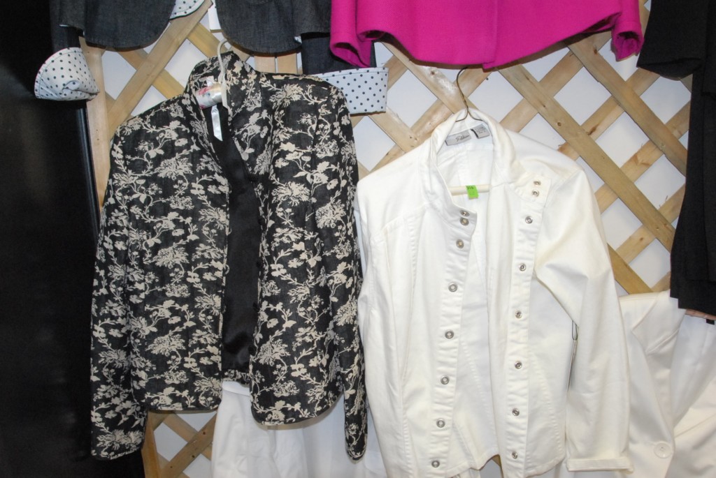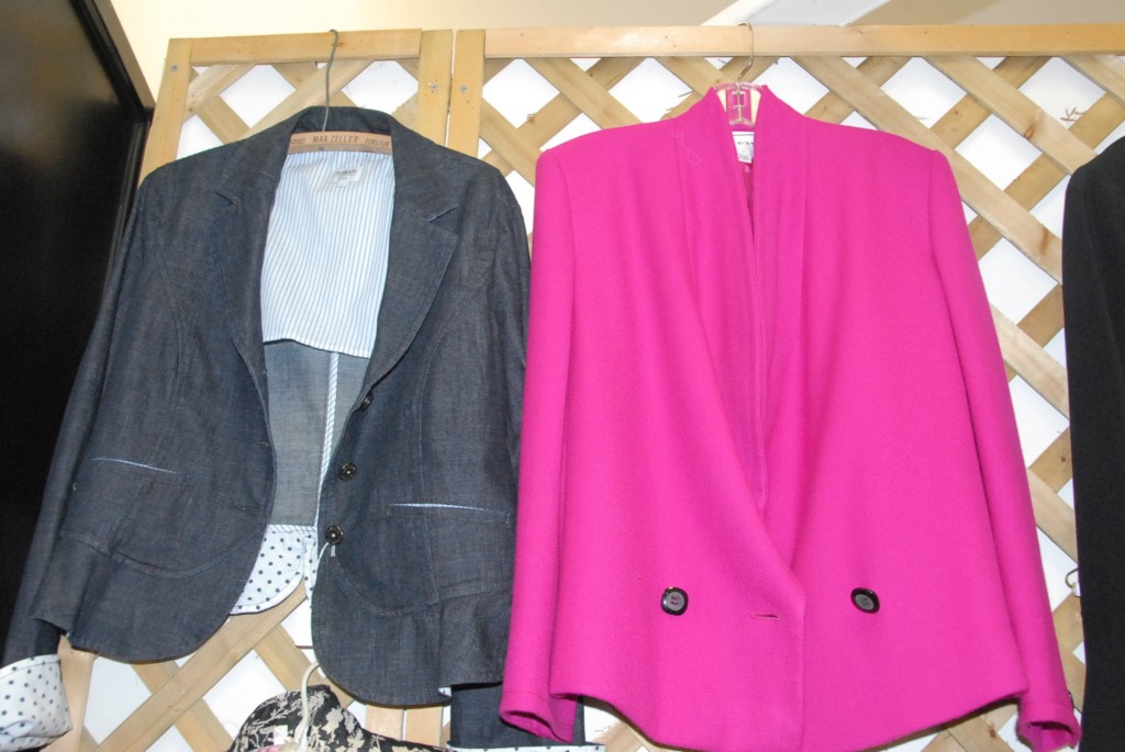 Group of jackets and clothing Armani, jean jacket, Ellen Tracy, Chicos, Lafayette white jacket, to pairs of Gucci shoes, Ferragamo pair of boots, Stuart Weitzman heels, Burberry shirt, Lafayette small shirt, and three Gucci belts.