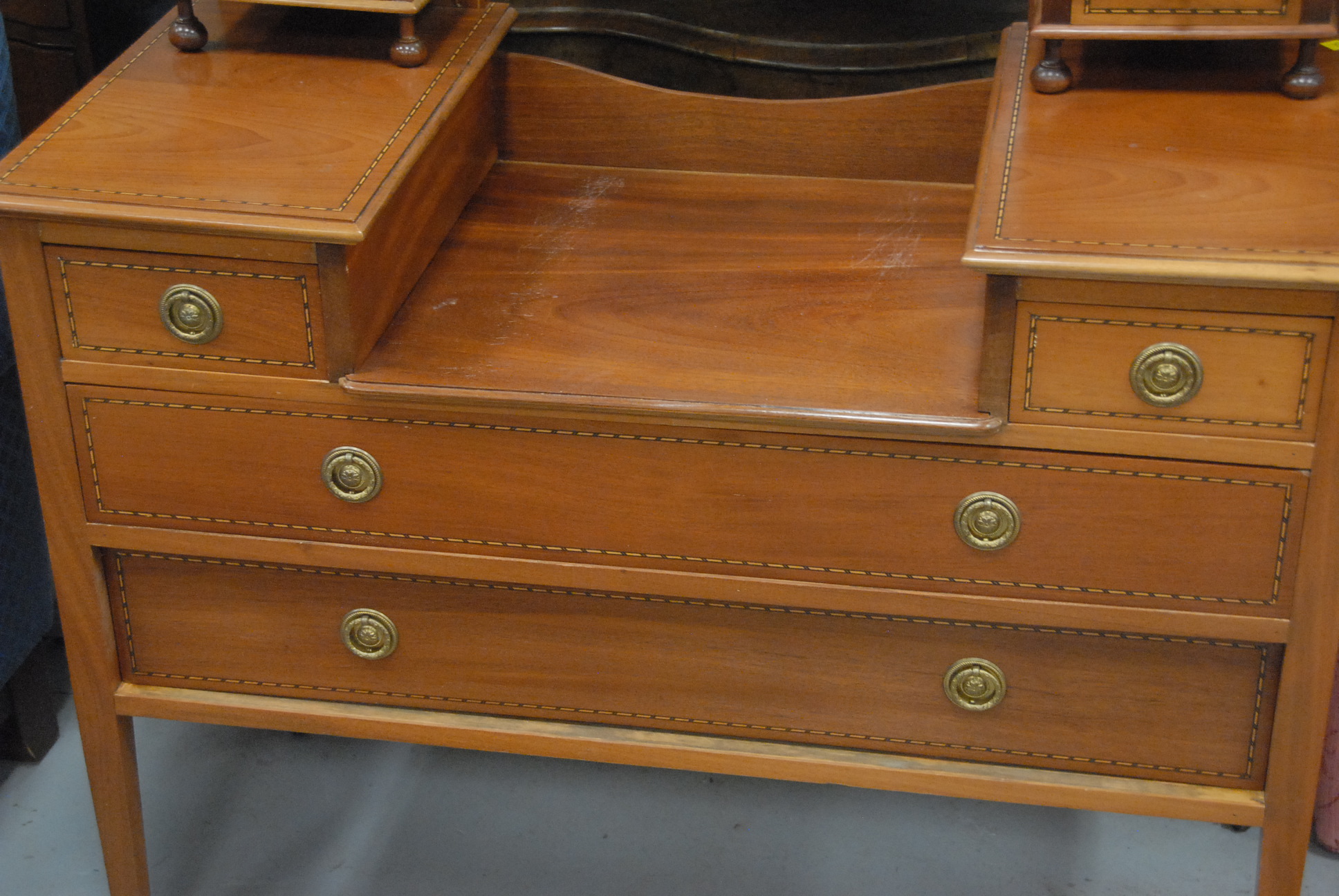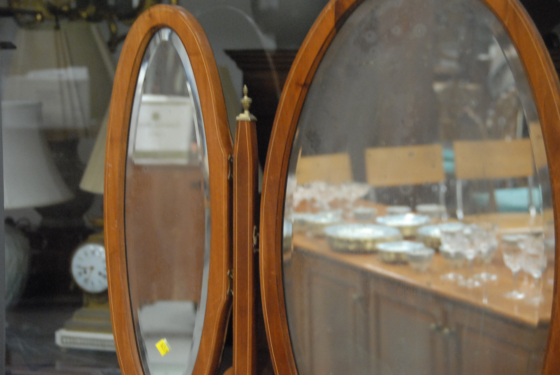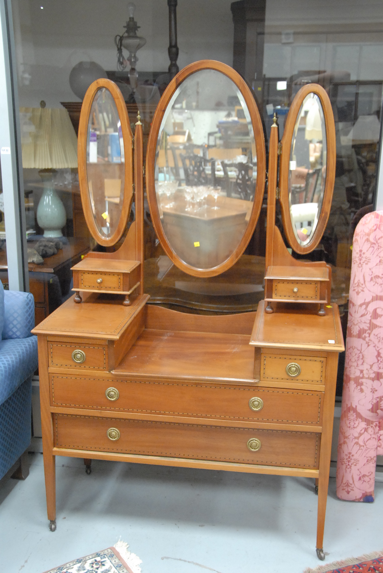 Inlaid mahogany vanity with triple folding mirror, ht. 67, wd. 41.