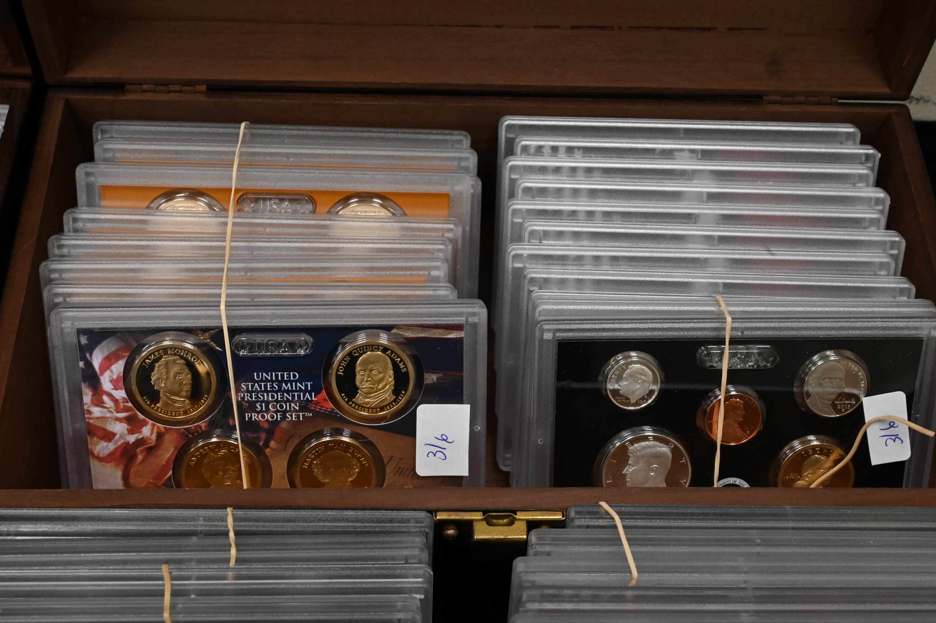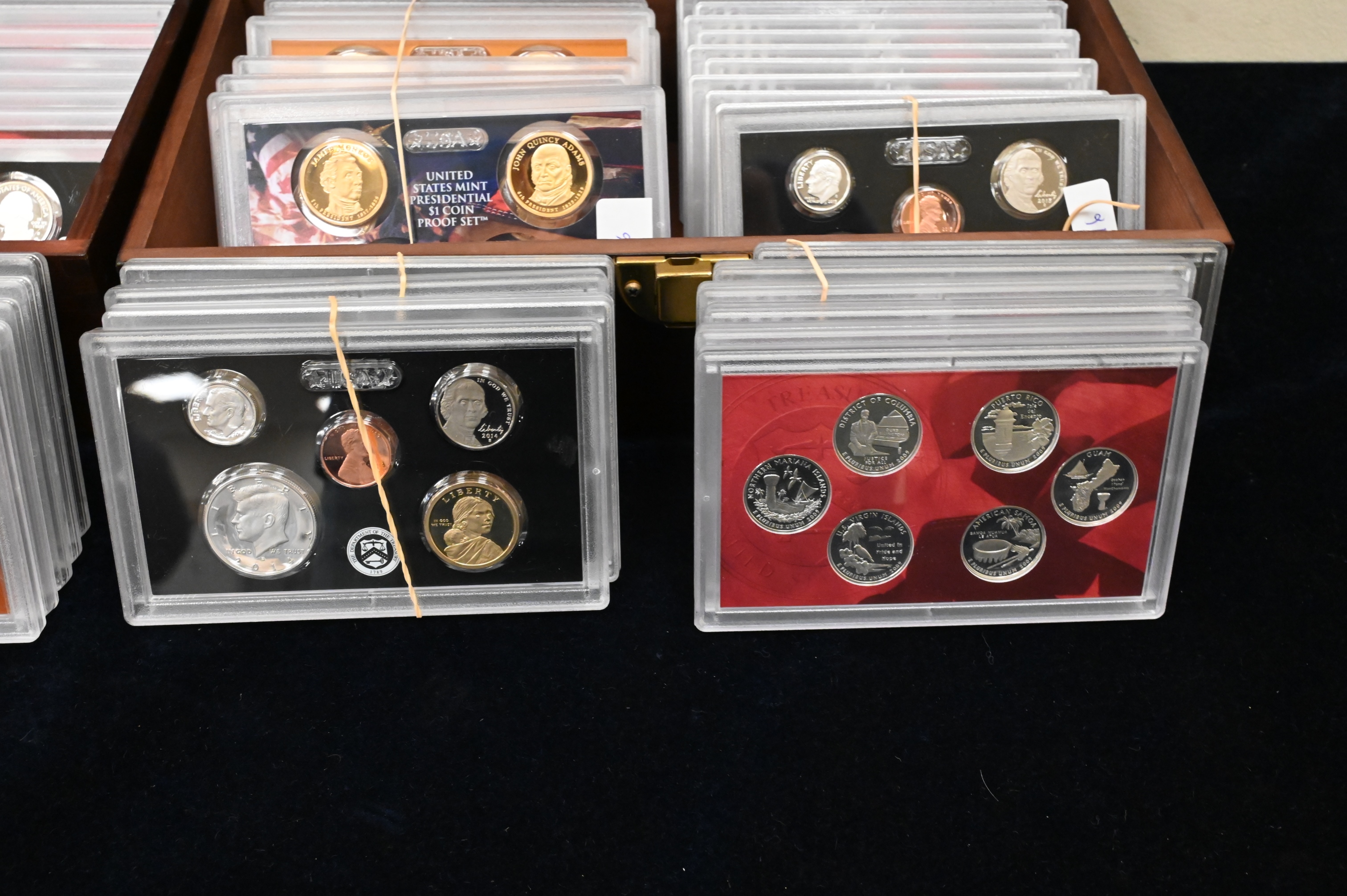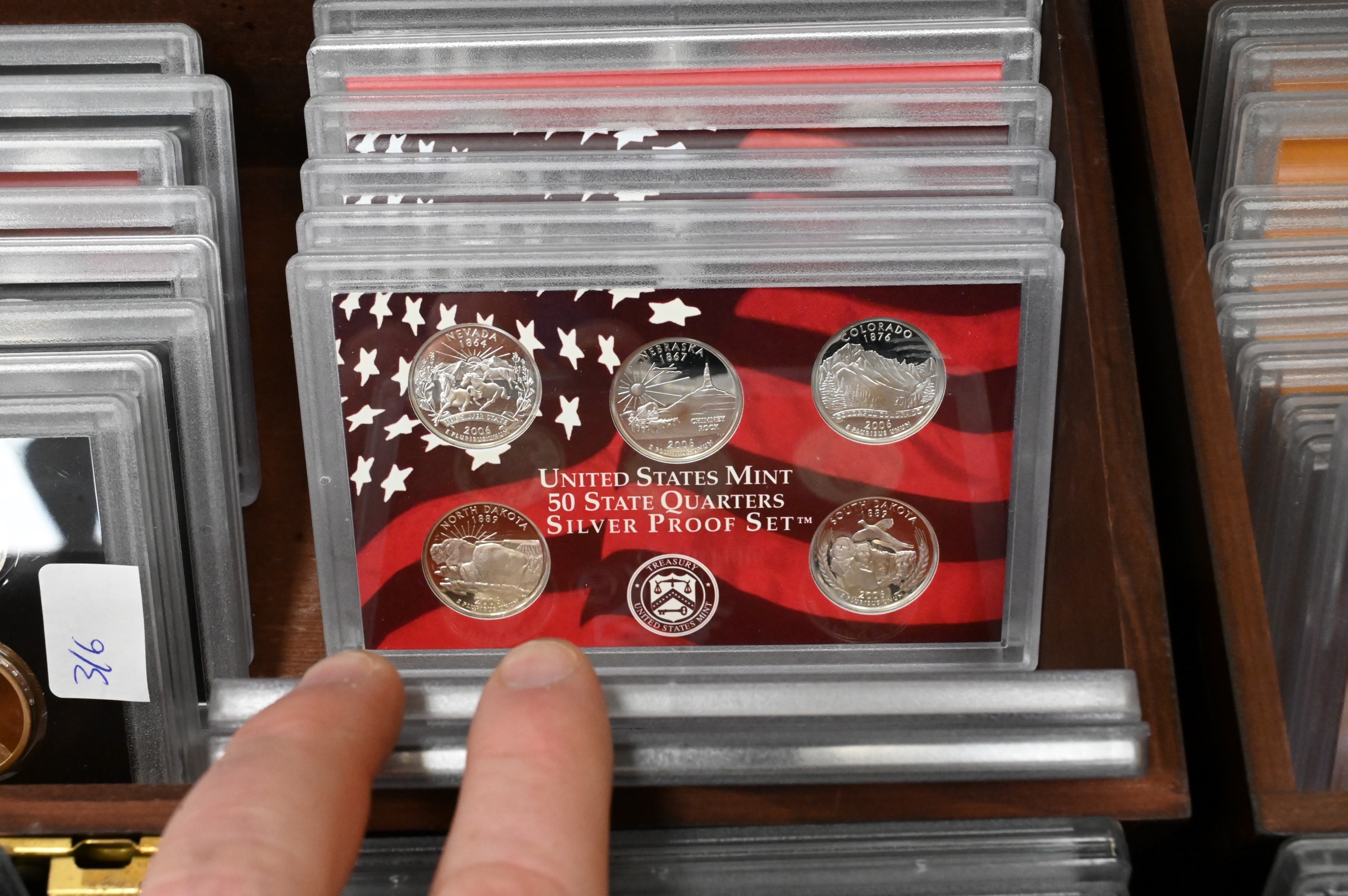 Large Lot of Proof Sets, to include seven sets of quarters and six sets of quarters U.S. mint and silver proof sets, 1999, 2000, 2001, 2002, 2003, 2004, 2005, 2006,and 2008. US mint proof sets with quarters 2011, 2014, 2015,two 2016, 2017,2018, proof Silver sets 1992, 1993, 1994, 1995, 1996, 1998, proof coins sets 2009, 2010, 2012, and 2013, along with presidential proof $1 eleven sets.