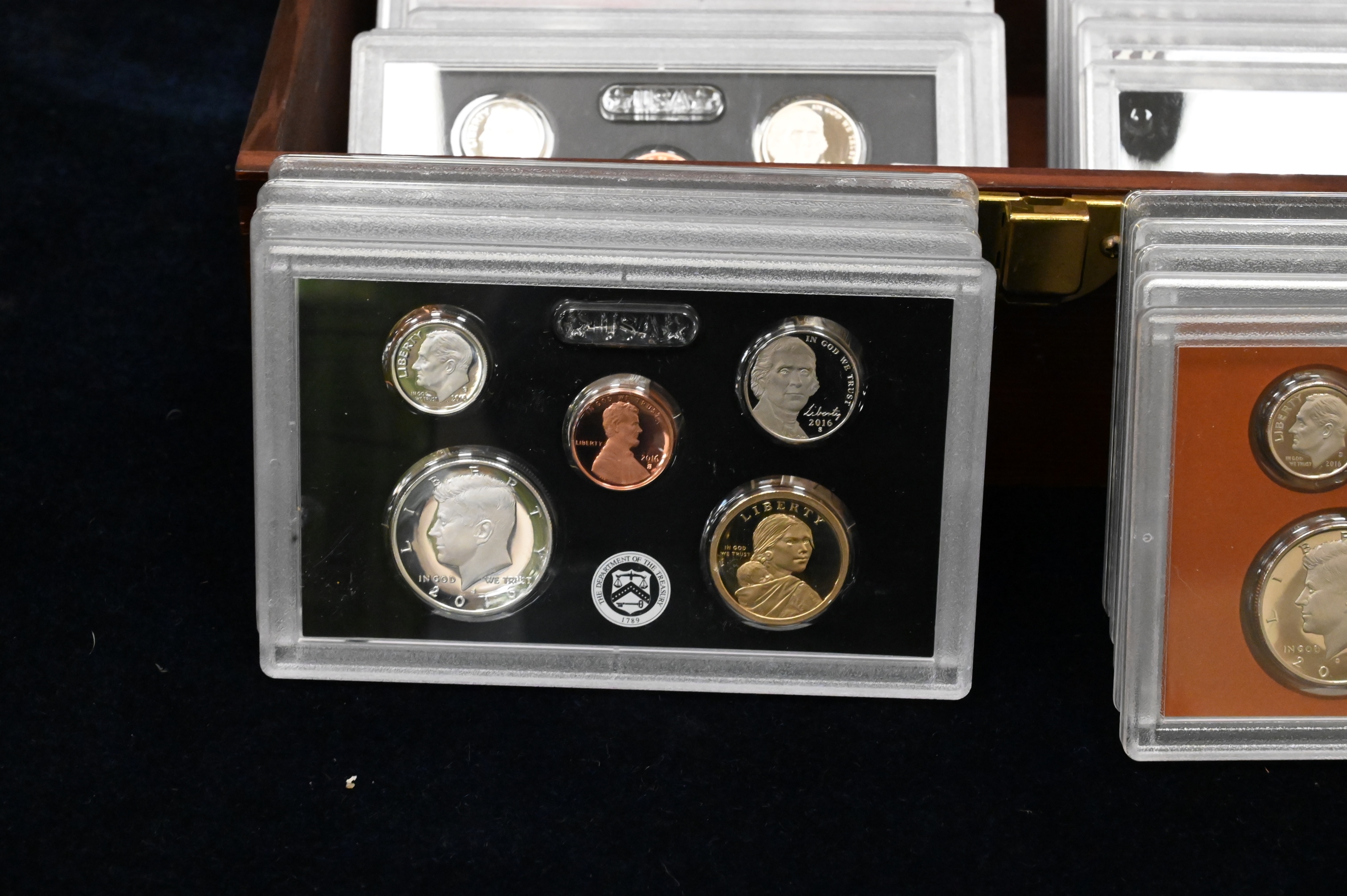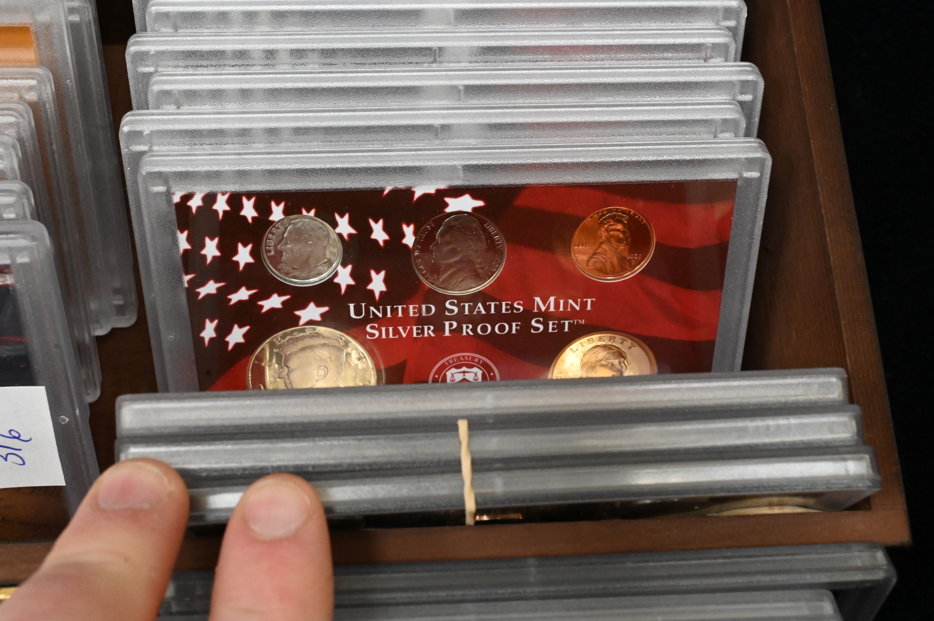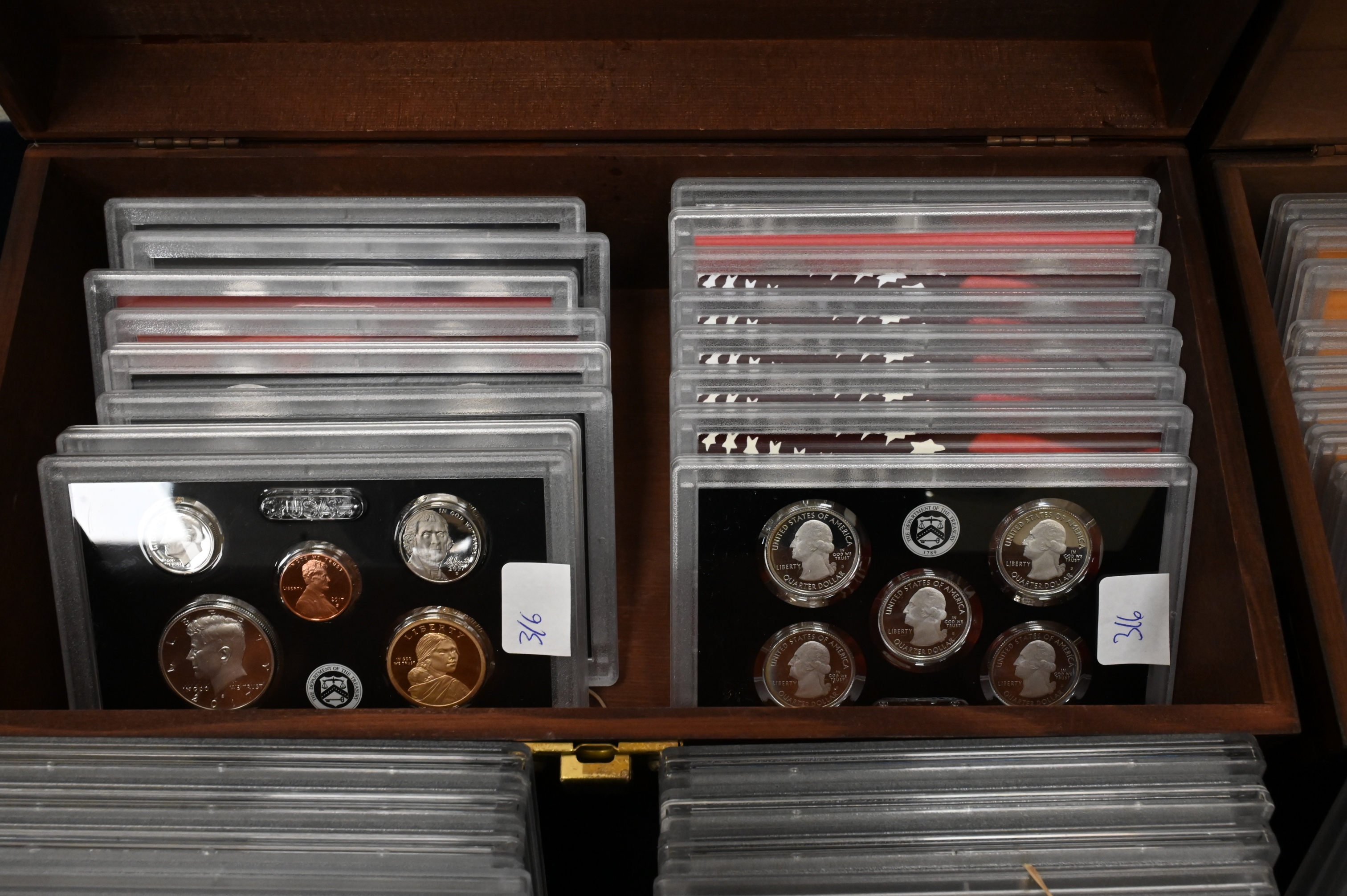Large Lot of Proof Sets, to include seven sets of quarters and six sets of quarters U.S. mint and silver proof sets, 1999, 2000, 2001, 2002, 2003, 2004, 2005, 2006,and 2008. US mint proof sets with quarters 2011, 2014, 2015,two 2016, 2017,2018, proof Silver sets 1992, 1993, 1994, 1995, 1996, 1998, proof coins sets 2009, 2010, 2012, and 2013, along with presidential proof $1 eleven sets.