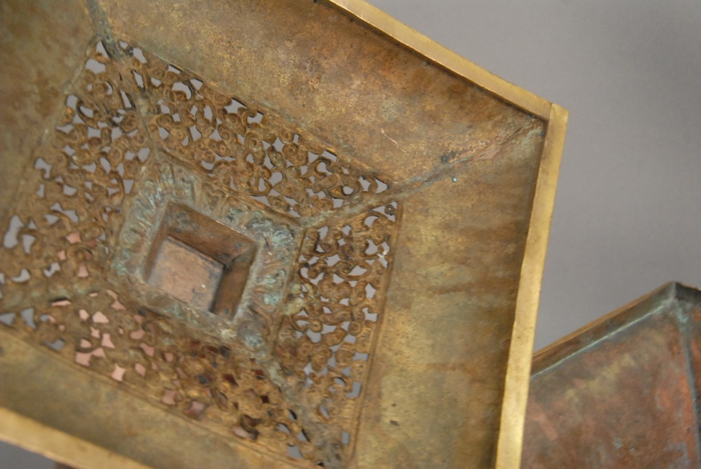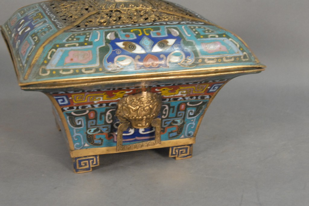 Large square cloisonn and brass censor with reticulated top and foo dog finial ,ht. 9 wd. 10.