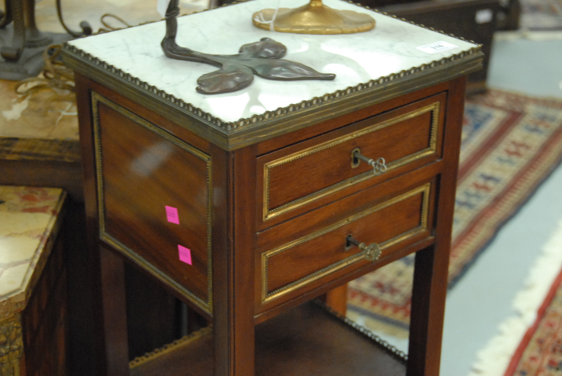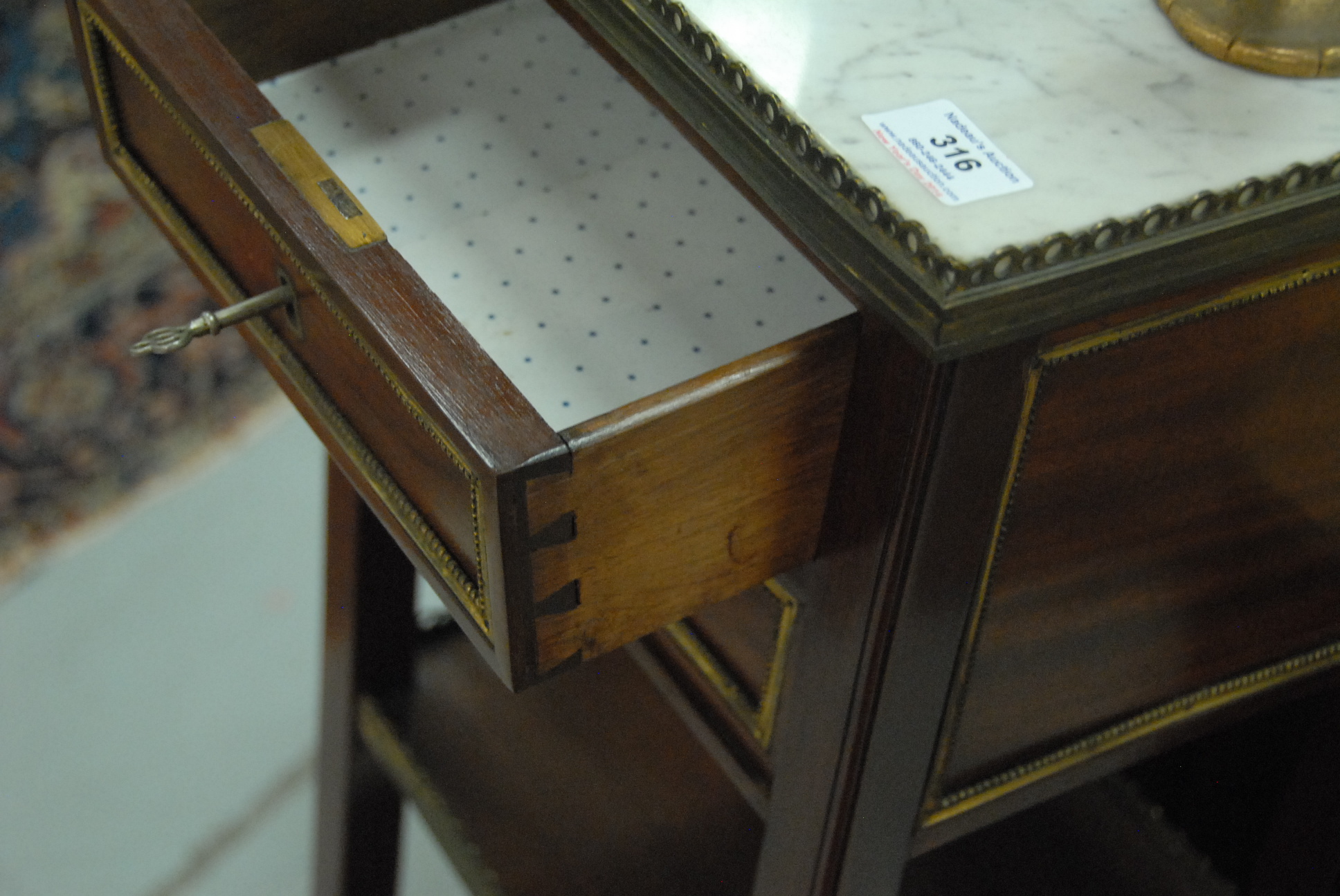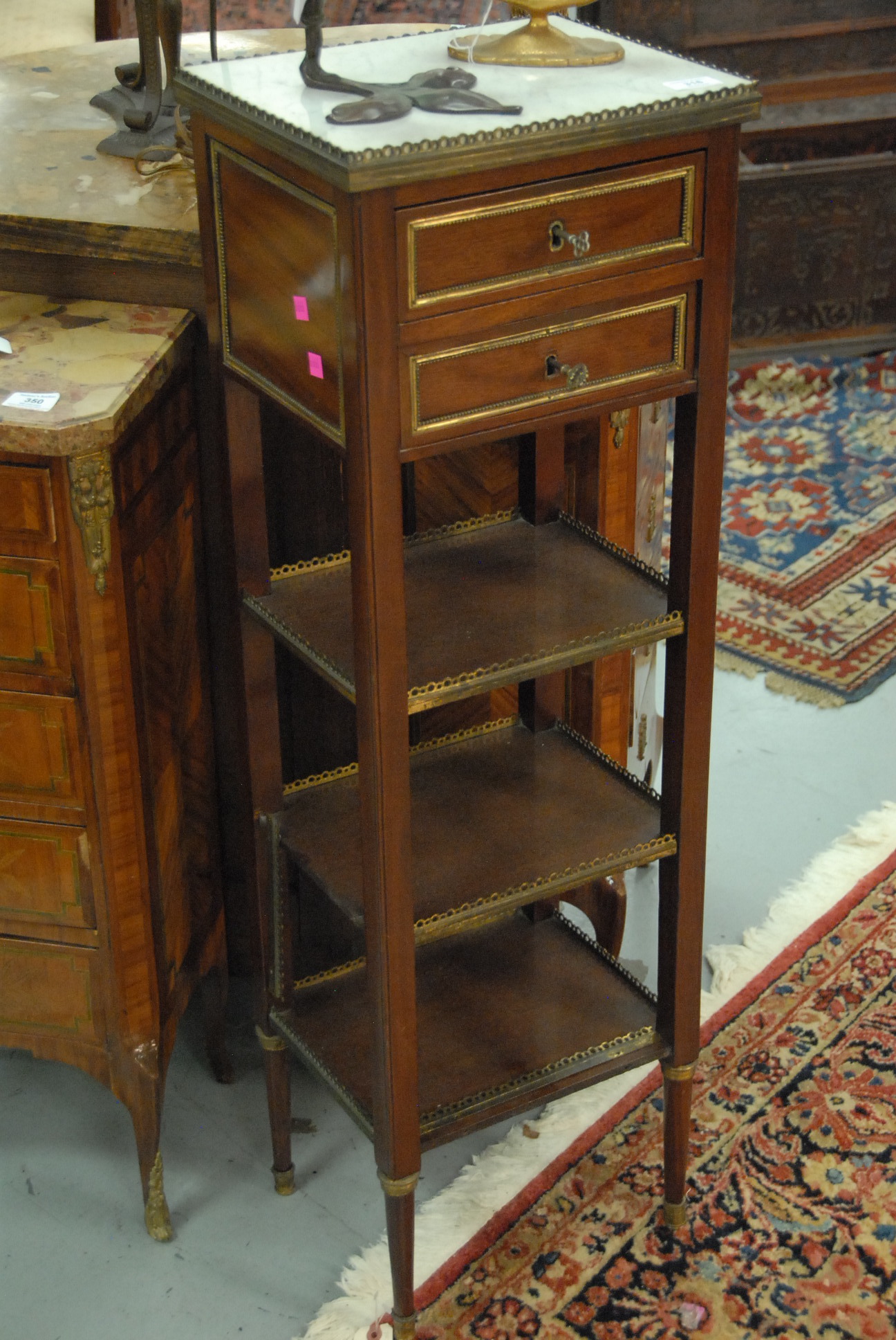 Lot 316: Louis XVI style stand with marble top and brass surround over two drawers over three shelves with brass surrounds on turned legs, late 19th early to 20th century. ht. 41in. top: 11 x 13