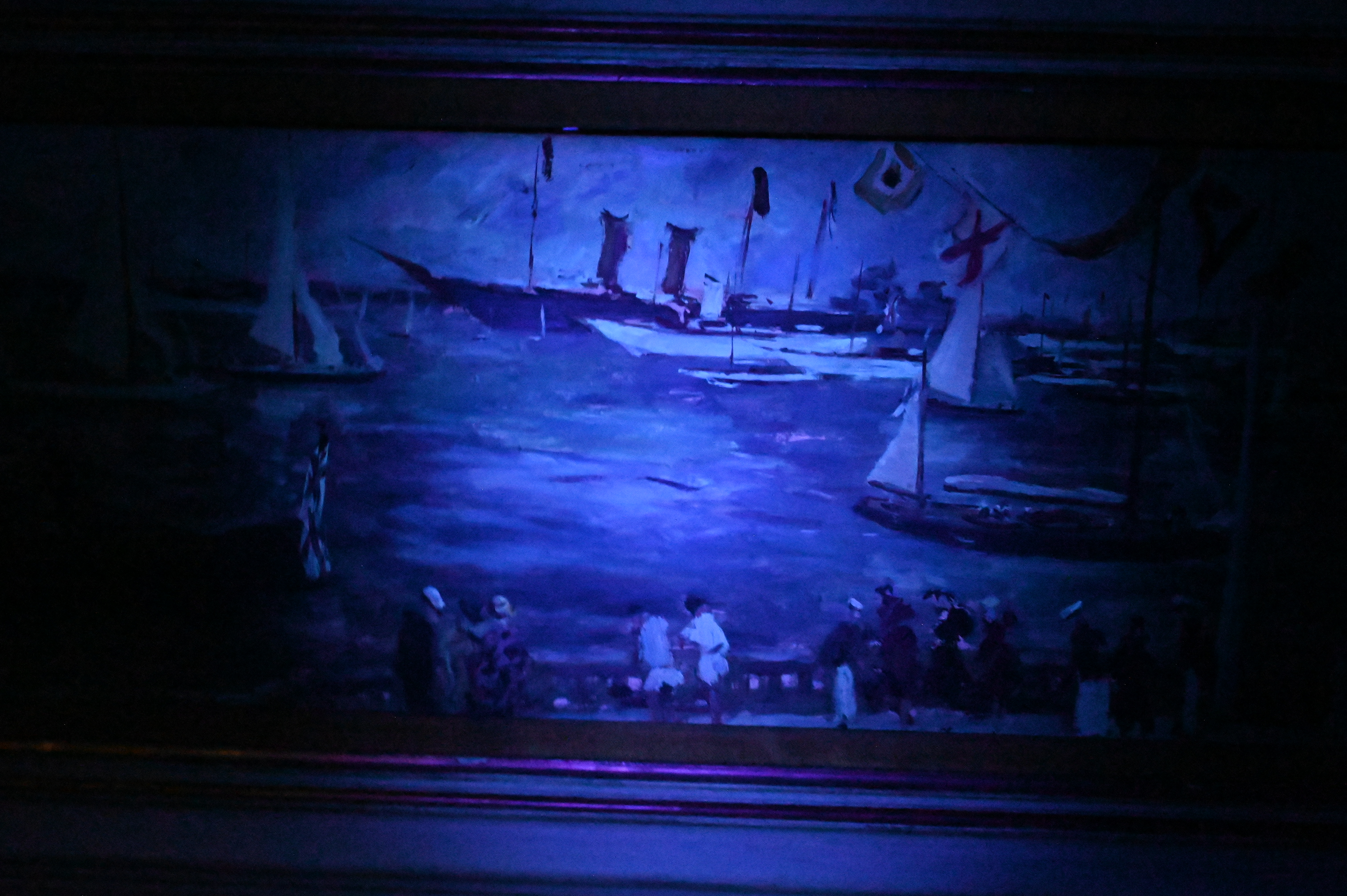 Paint fluoresces under UV light, does not seem to be inpainting. Some edgware, loose in frame.