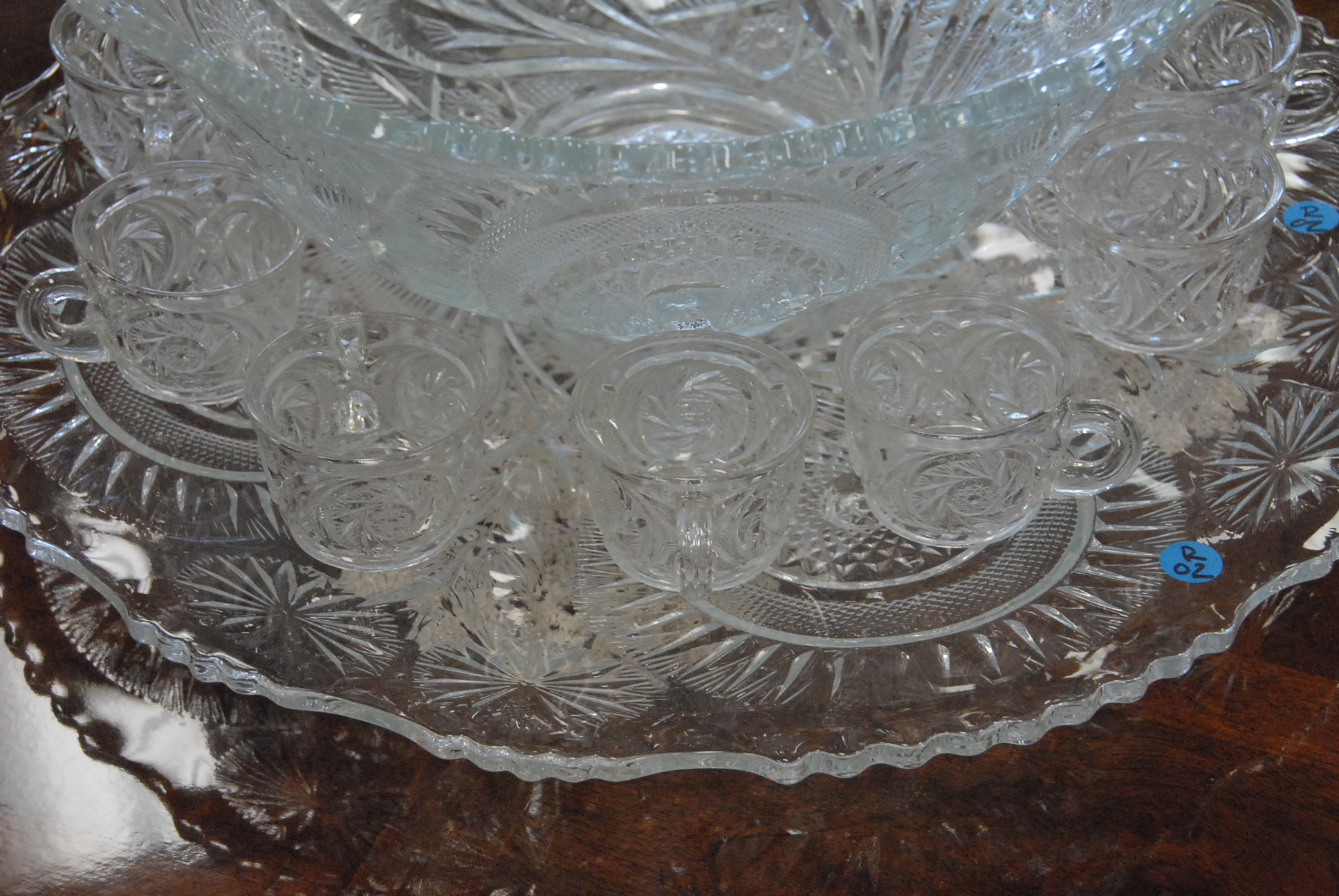 Pressed glass punch bowl, underplate, and cups.