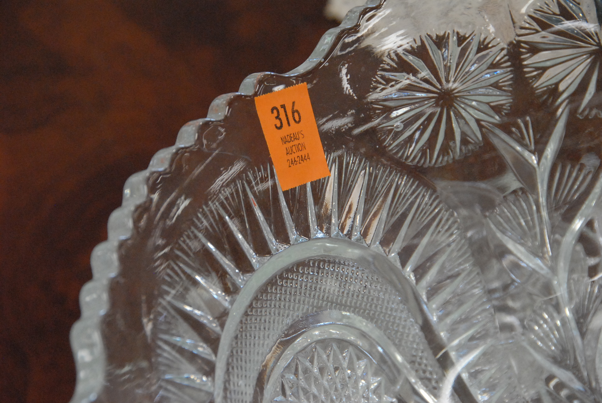Lot 316: Pressed glass punch bowl, underplate, and cups.