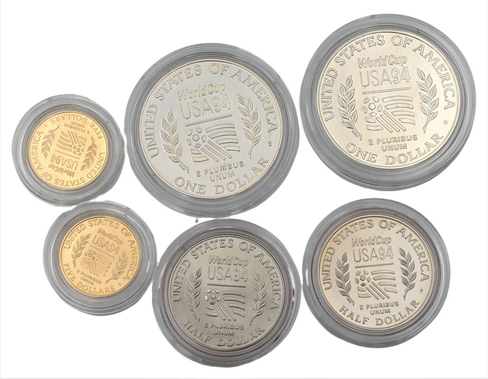 Six Piece Coin Lot, to include two 5 dollar gold, along with four 1994 coins Soccer, 1 three piece uncirculated set, 1 three piece proof set, 2 silver dollars, and C-N half -dollars.