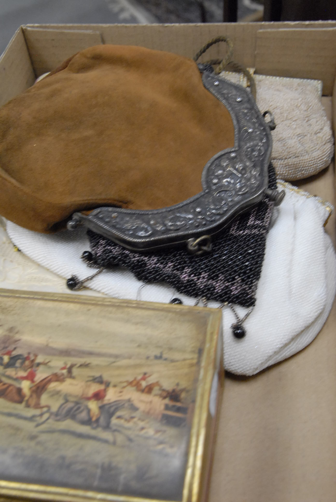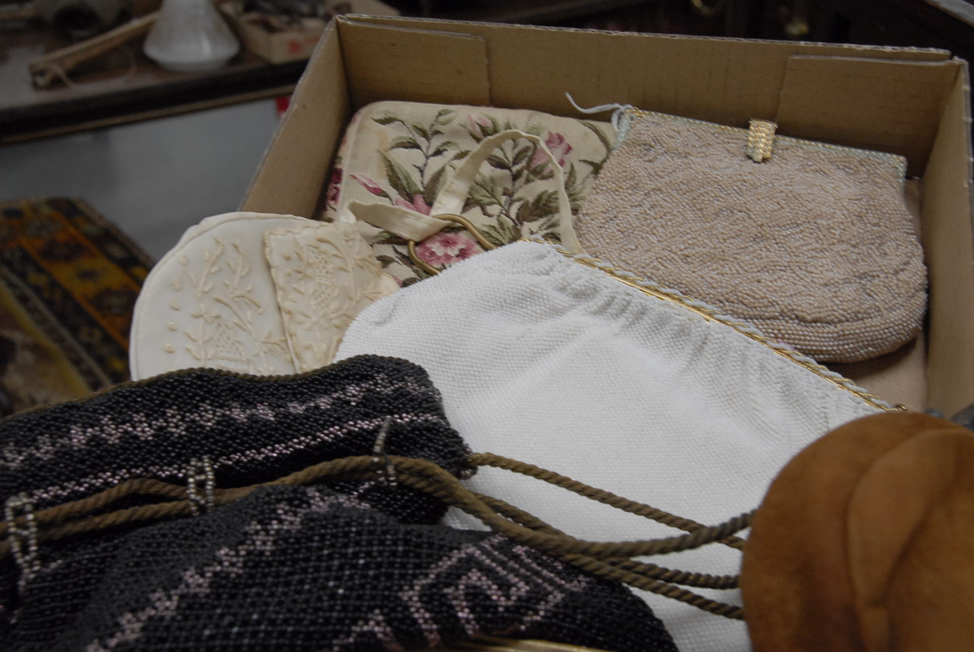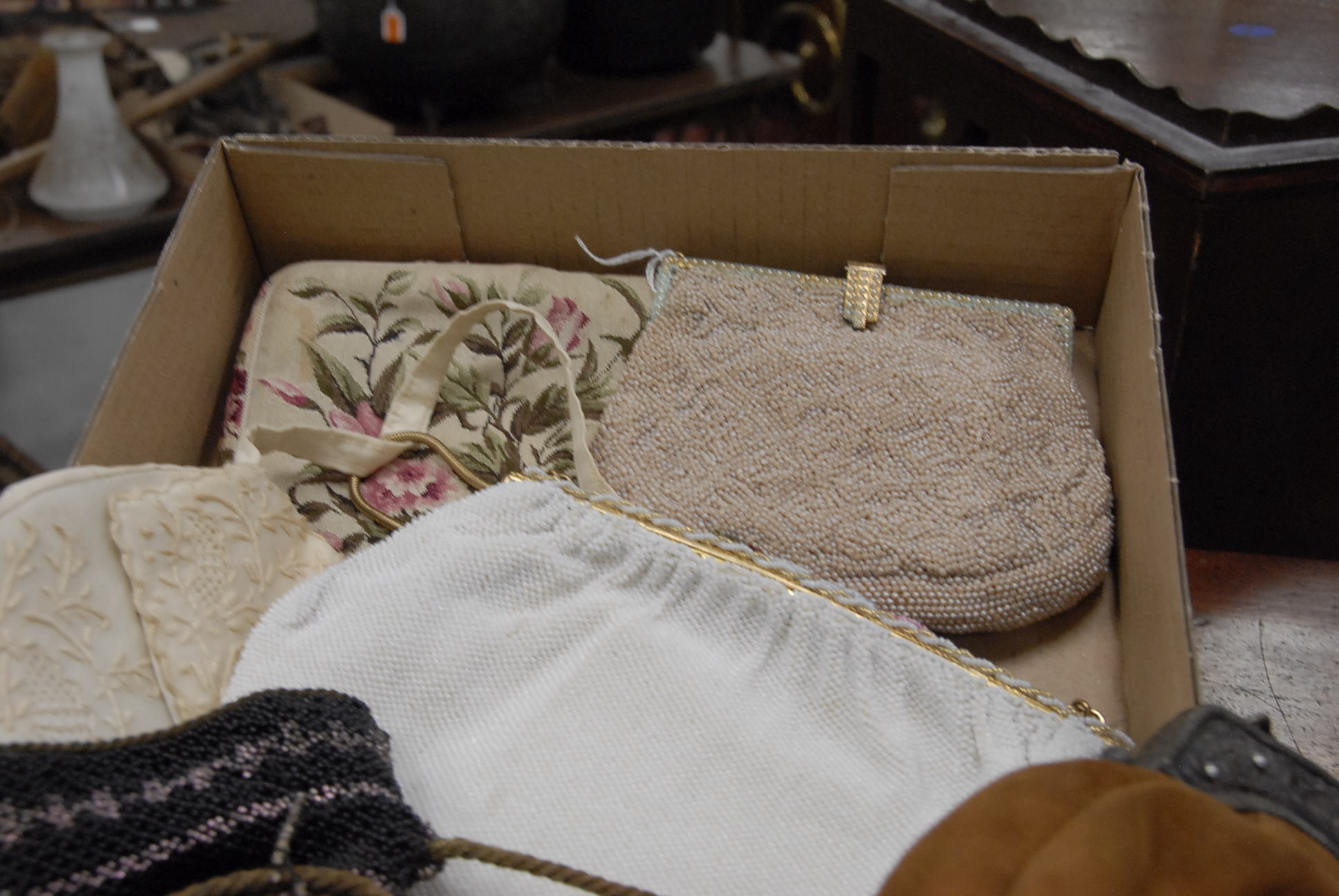 Six purses including three beaded purses, one embroidered, one with a silver plated top