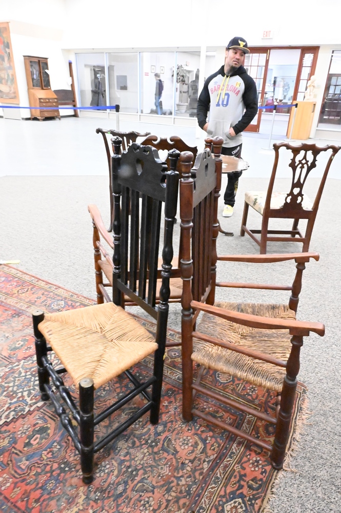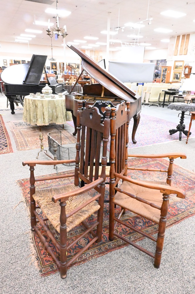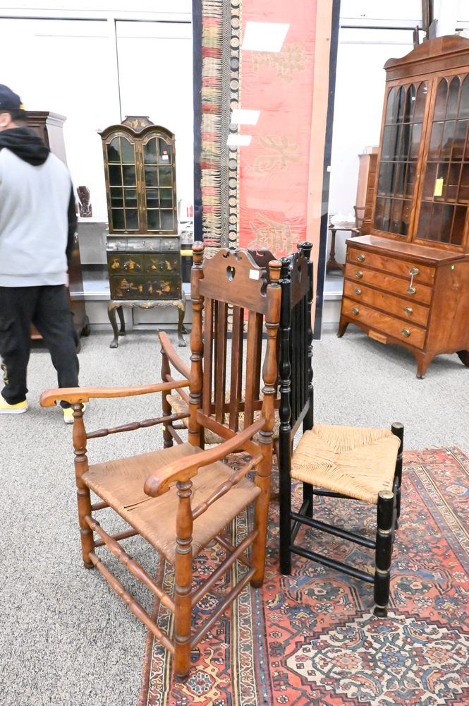 Lot 316: Three Heart and Crown Bannister Back Chairs, two having arms, one side, all with rush seats, 18th century, heights 44 – 45 inches.