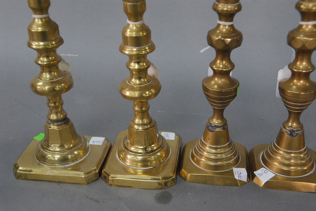 Lot 316: Three pairs of brass push up candlesticks. ht. 9in. and ht. 10in. Provenance: Brown Family, Windsor, Connecticut
