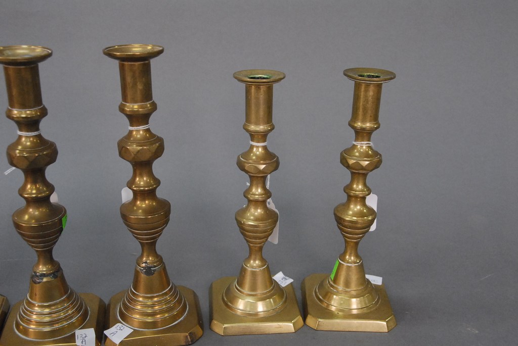 Three pairs of brass push up candlesticks. ht. 9in. and ht. 10in. Provenance: Brown Family, Windsor, Connecticut