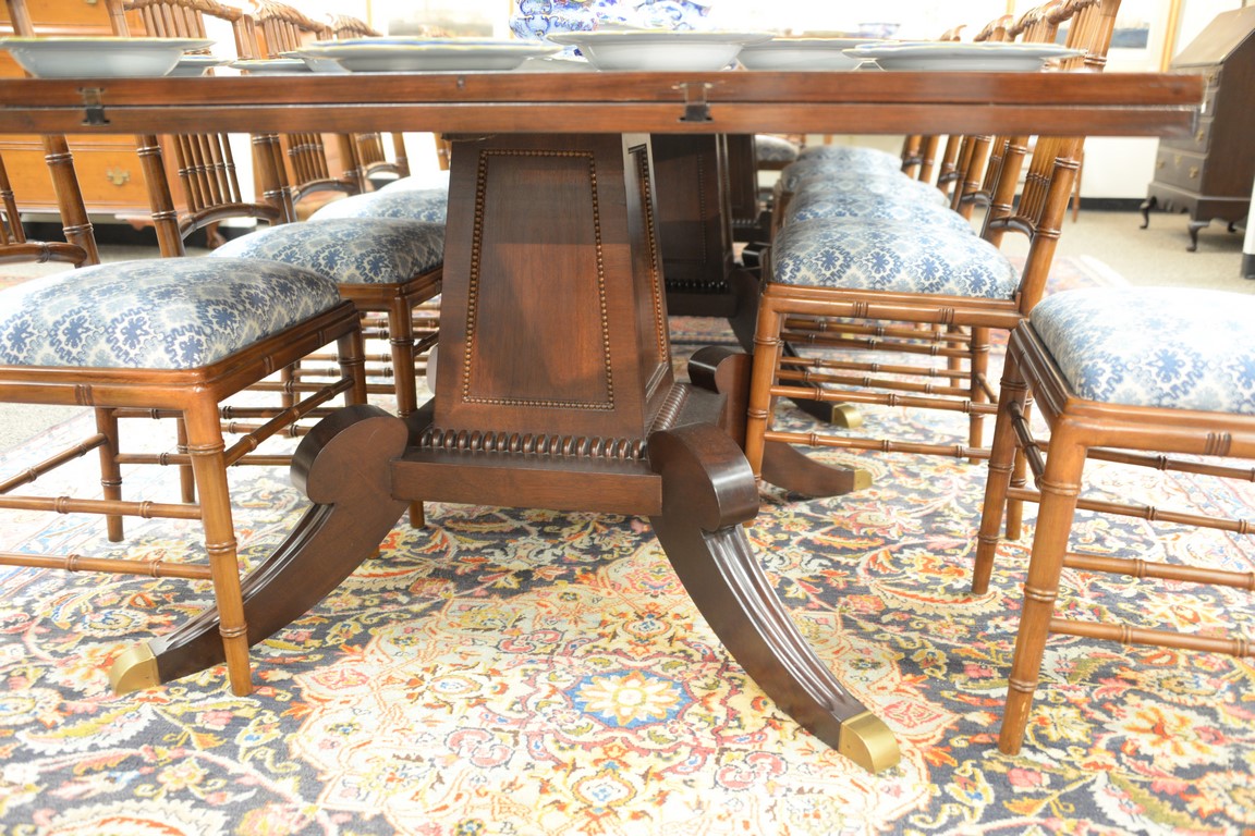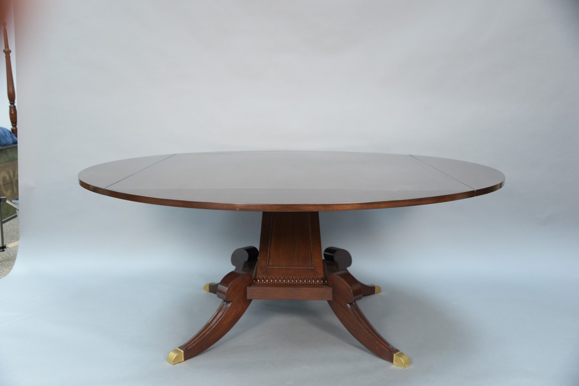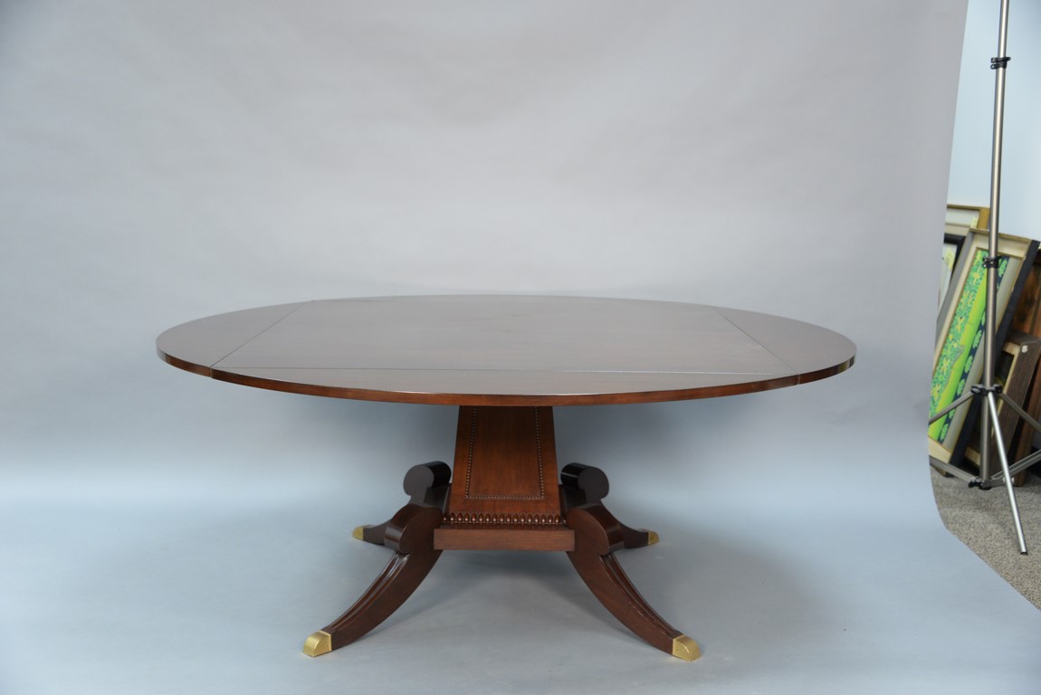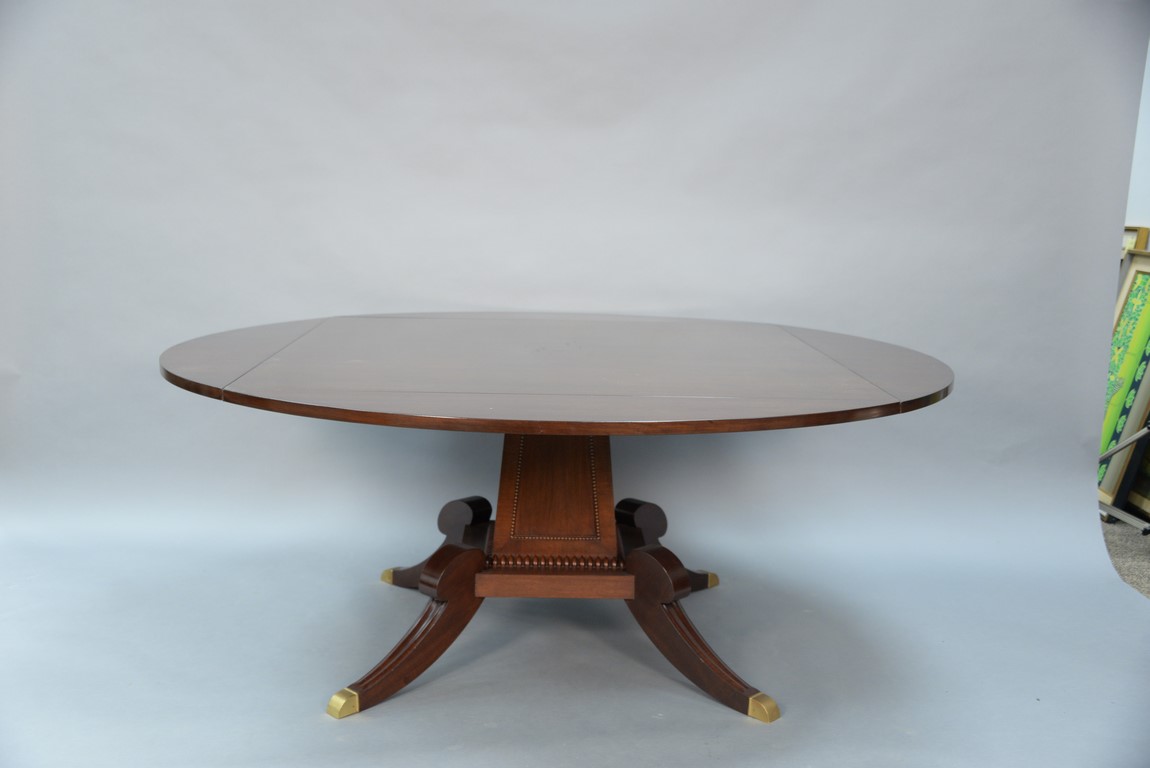 Three part mahogany dining table, each section separates as a square or round with four drop leaves, each table set on square pedestals on base with four downswept members ending in brass capped feet, 20th century. total length 156 inches, width 52 inches each table square 52 inches each table round 73 1/2 inches