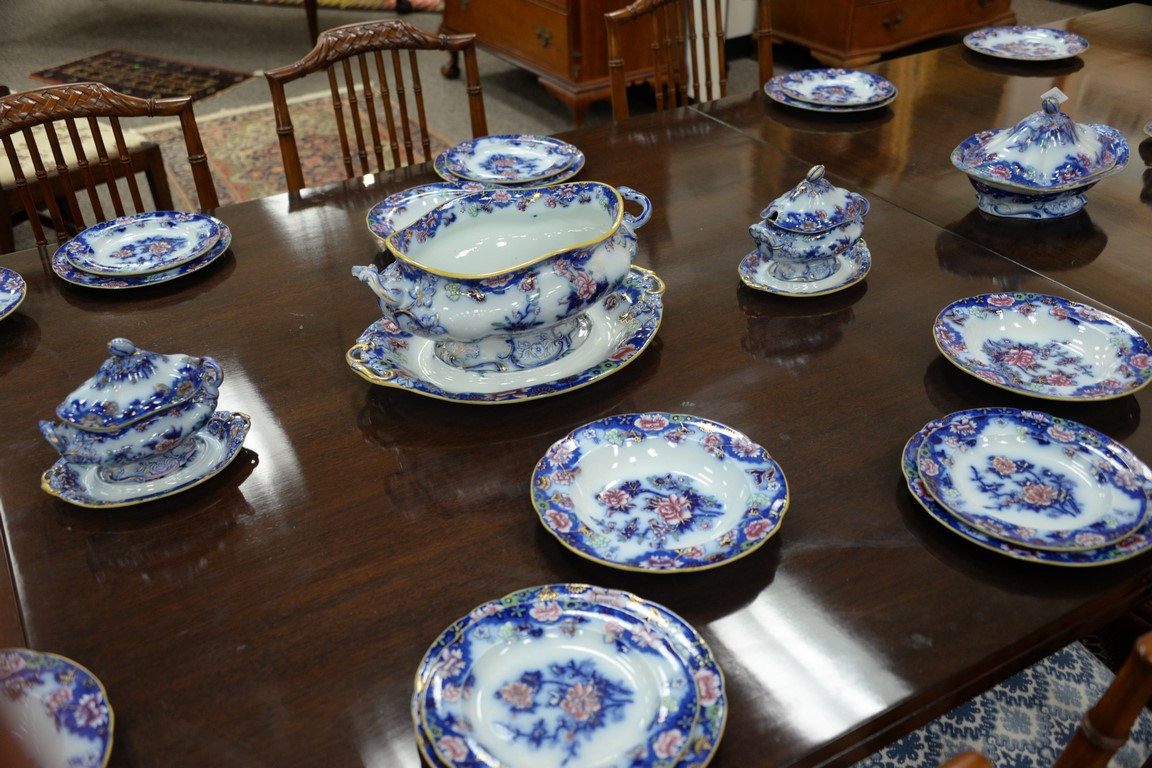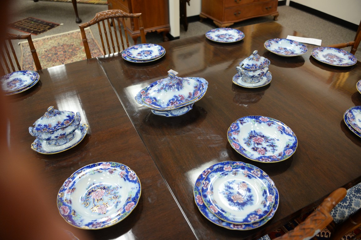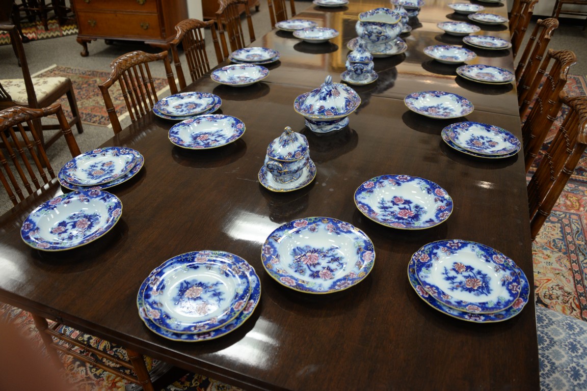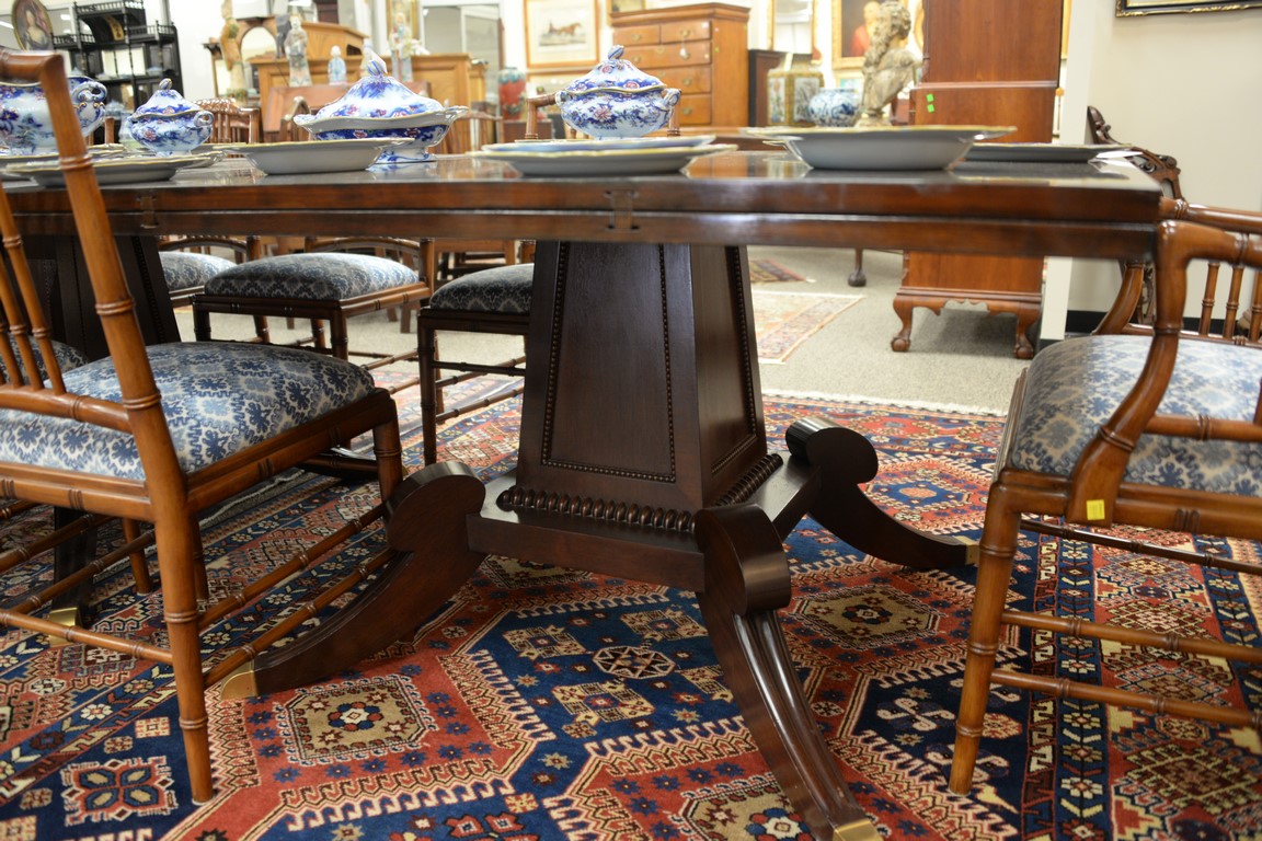Lot 316: Three part mahogany dining table, each section separates as a square or round with four drop leaves, each table set on square pedest…