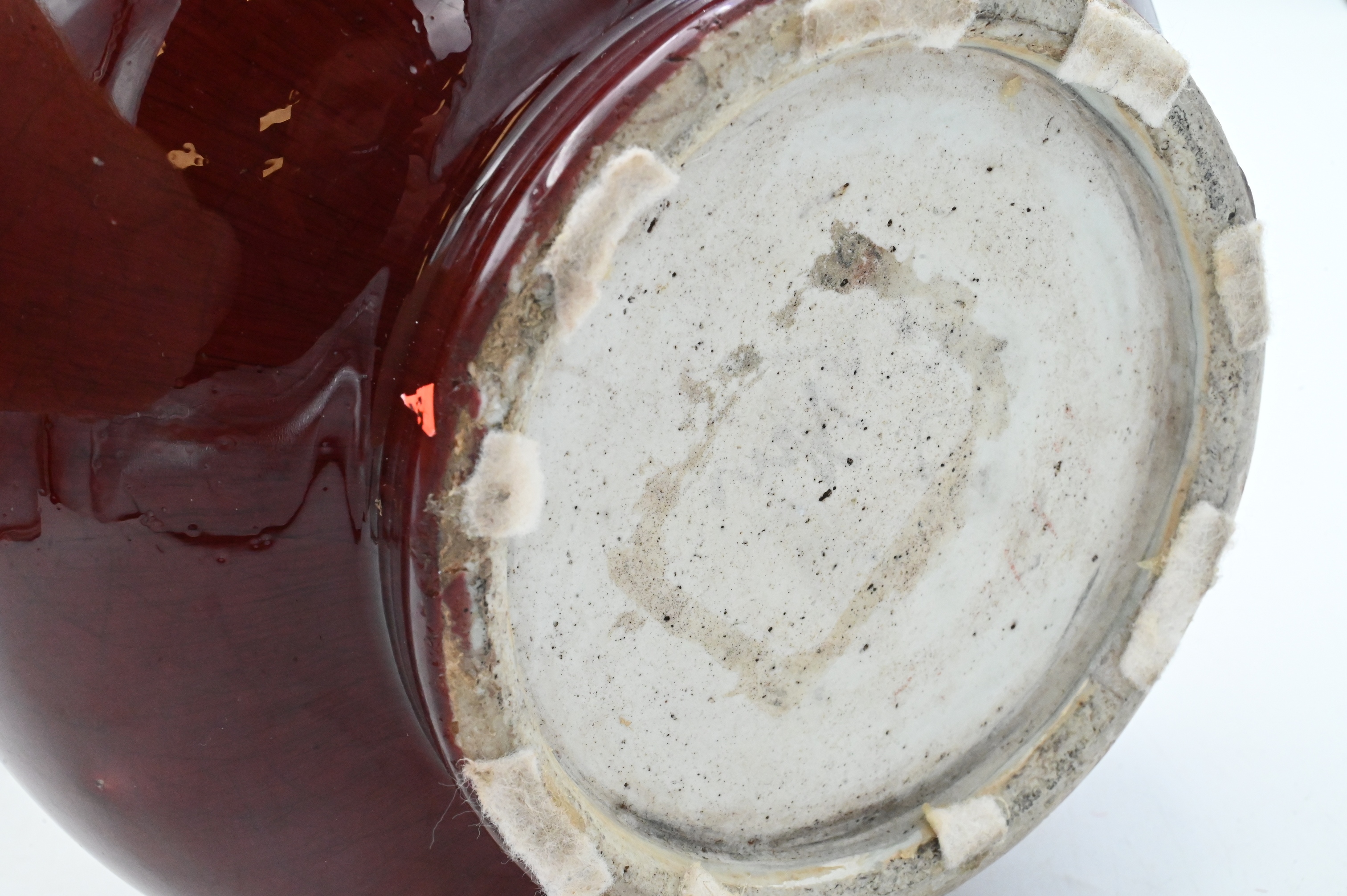 oxblood covered overall with unctuous red crackle glaze pulled from everted oatmeal mouth rim, repaired, copper red probably Daoguang, with straight neck, base unmarked with slight celadon tint, 19th century