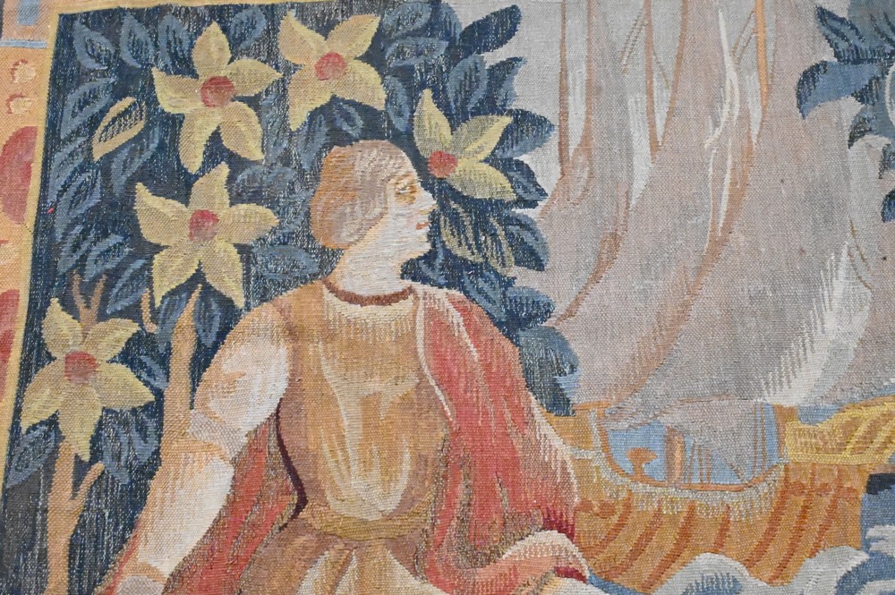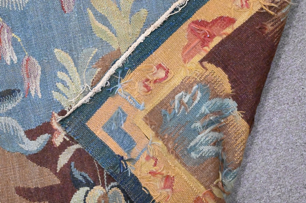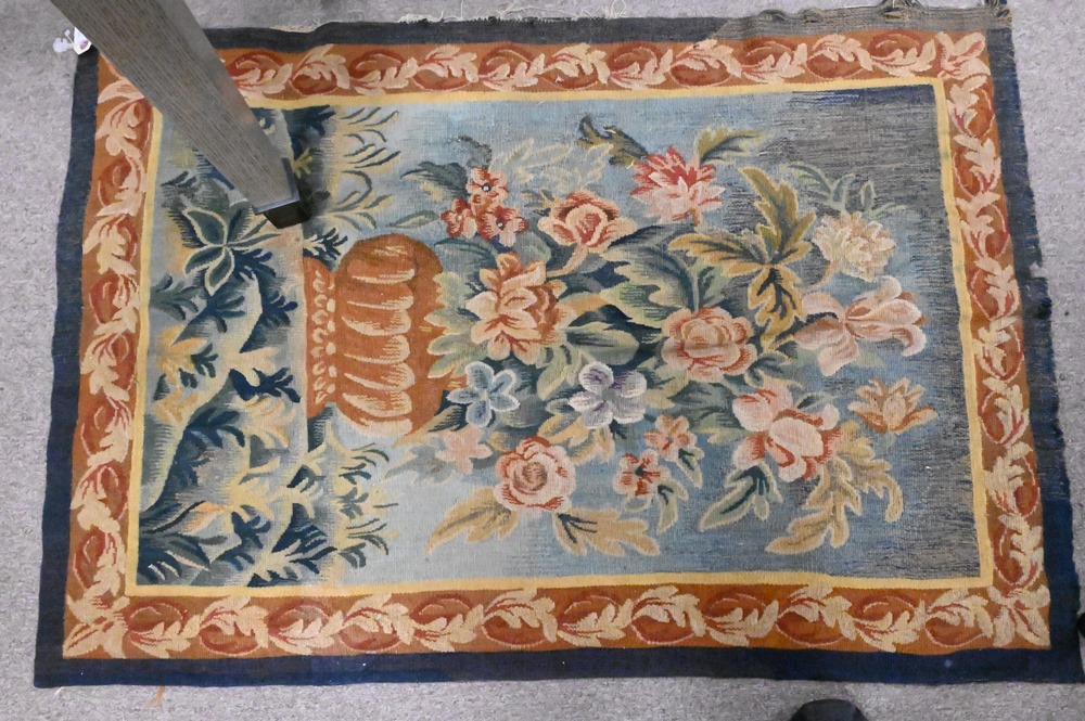 Lot 316: Two Continental Flatweave Throw Rugs, to include one depicting basket of flowers, the other with classical scene with figure, boot, and castle; 4′ 1″ x 5′ and 2′ 5″ x 3′ 7″.