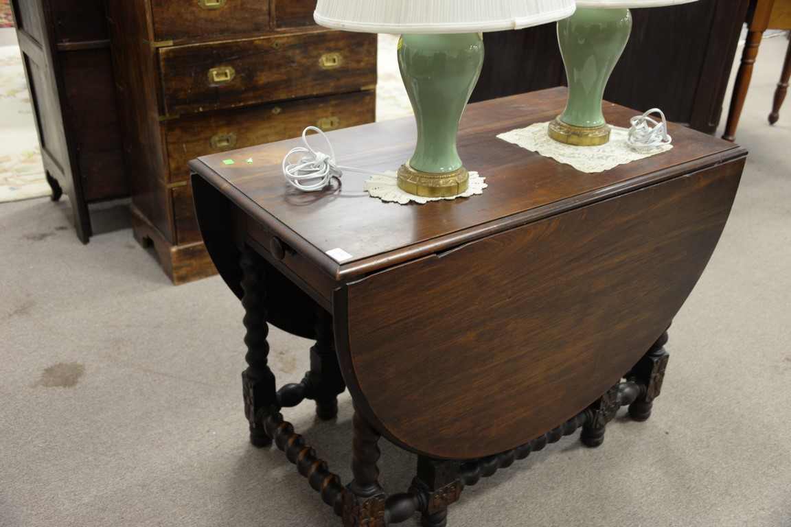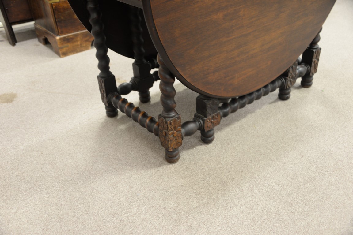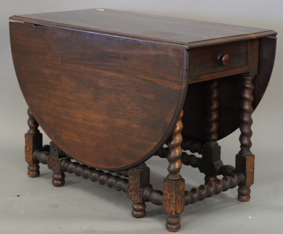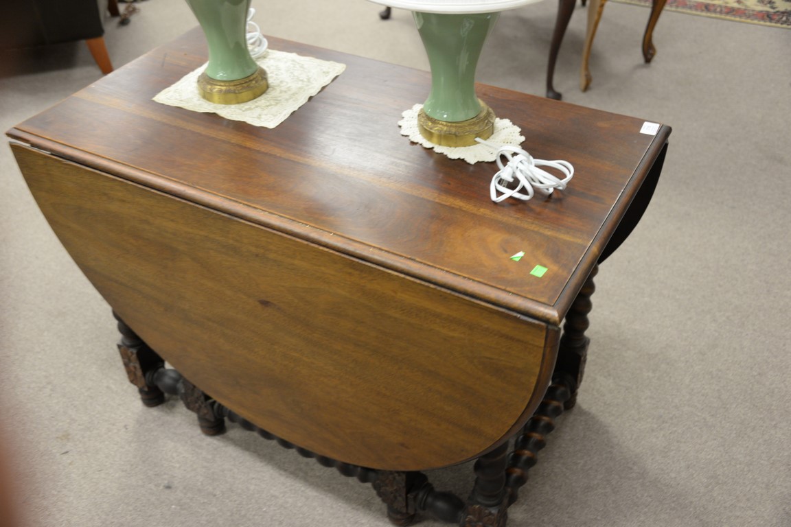 Lot 316: Walnut gate leg drop leaf table with spiral turned legs. top closed: 22 x 42
