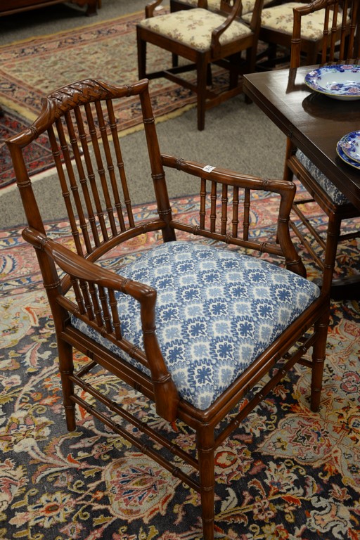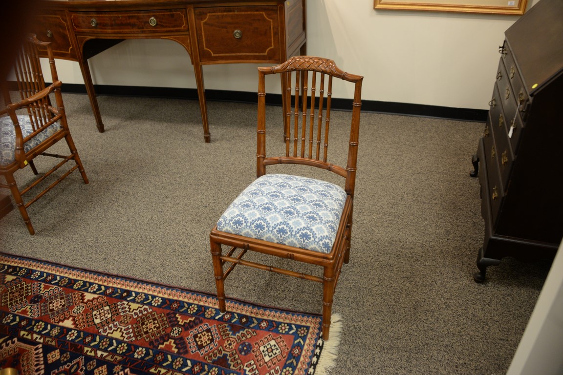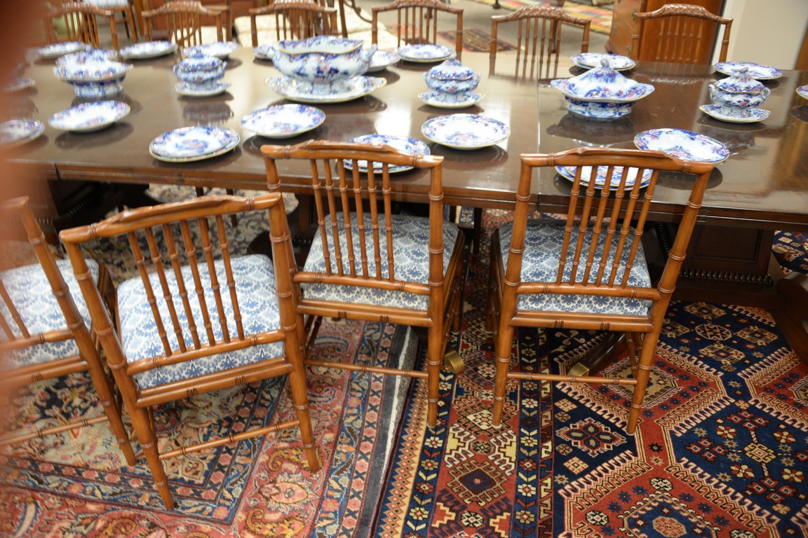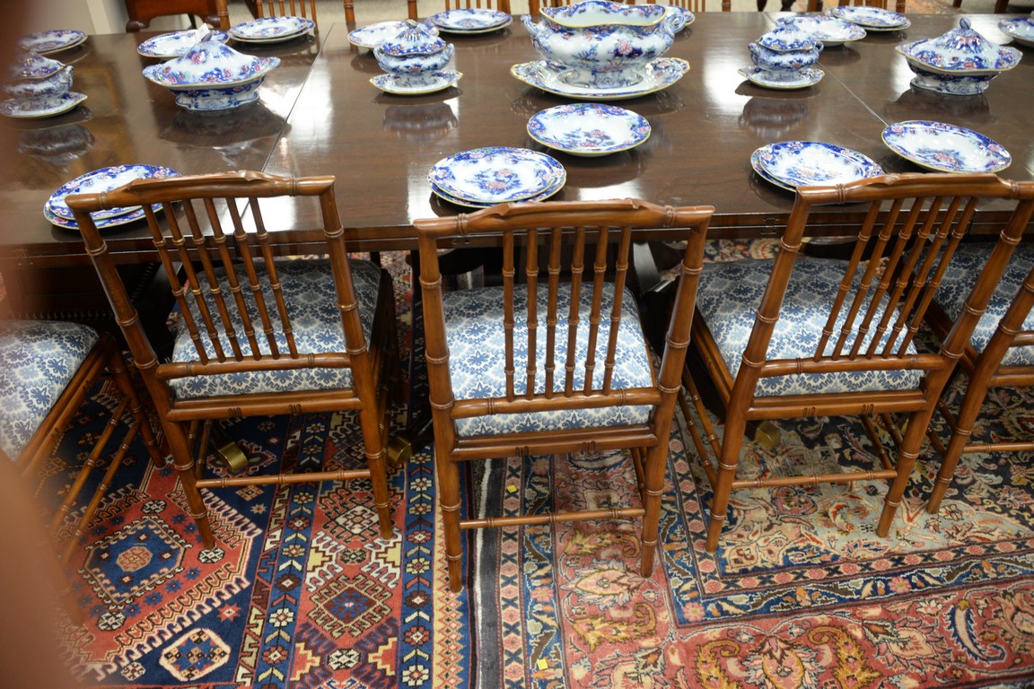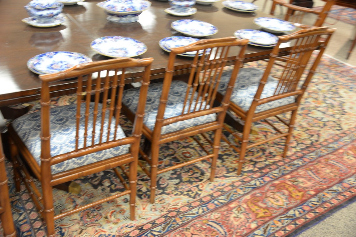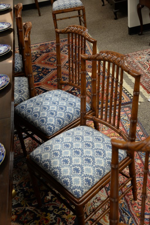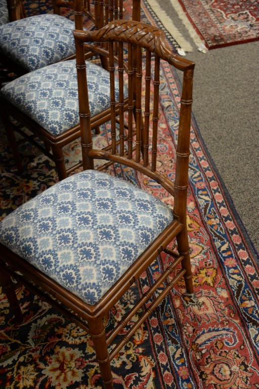 Lot 316A: Set of fourteen faux bamboo dining chairs, each with lattice top rail, bamboo style turnings, and upholstered slip seats on bamboo t…