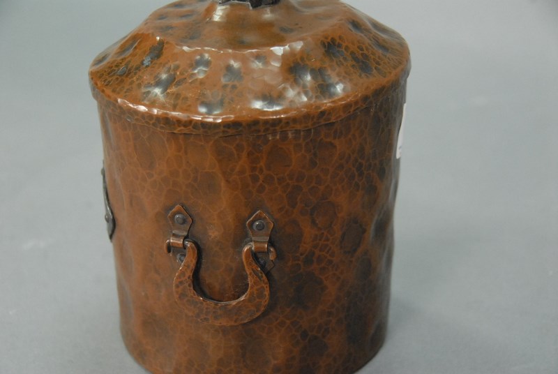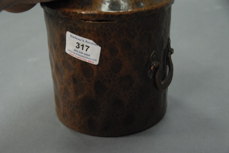 Lot 317: Arts & Crafts hand hammered copper covered tobacco jar with silver owl finial and plaque, not monogrammed marked on bottom Copper & Silver. ht. 9in.