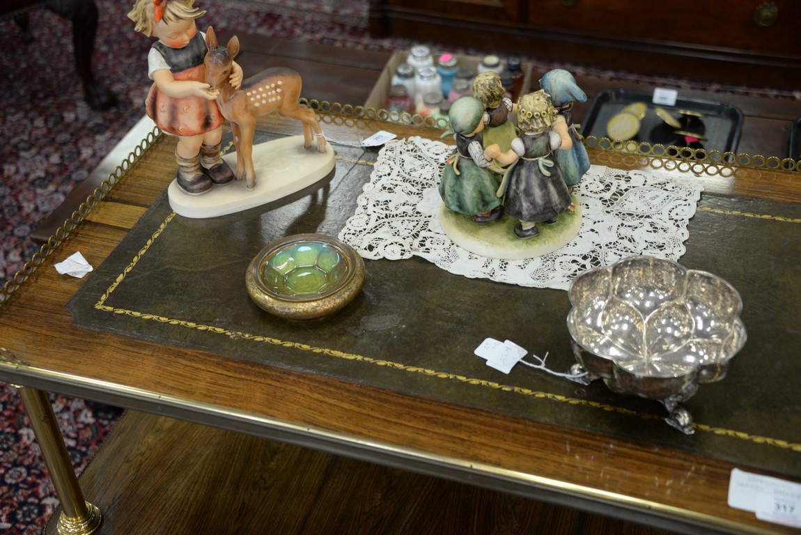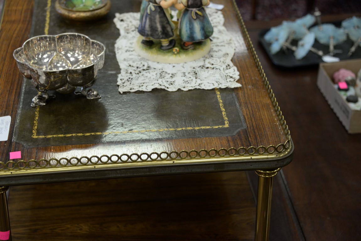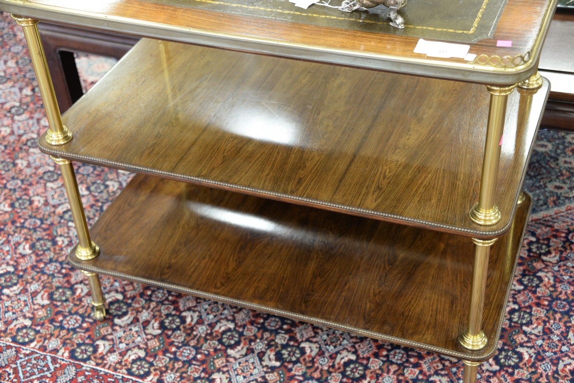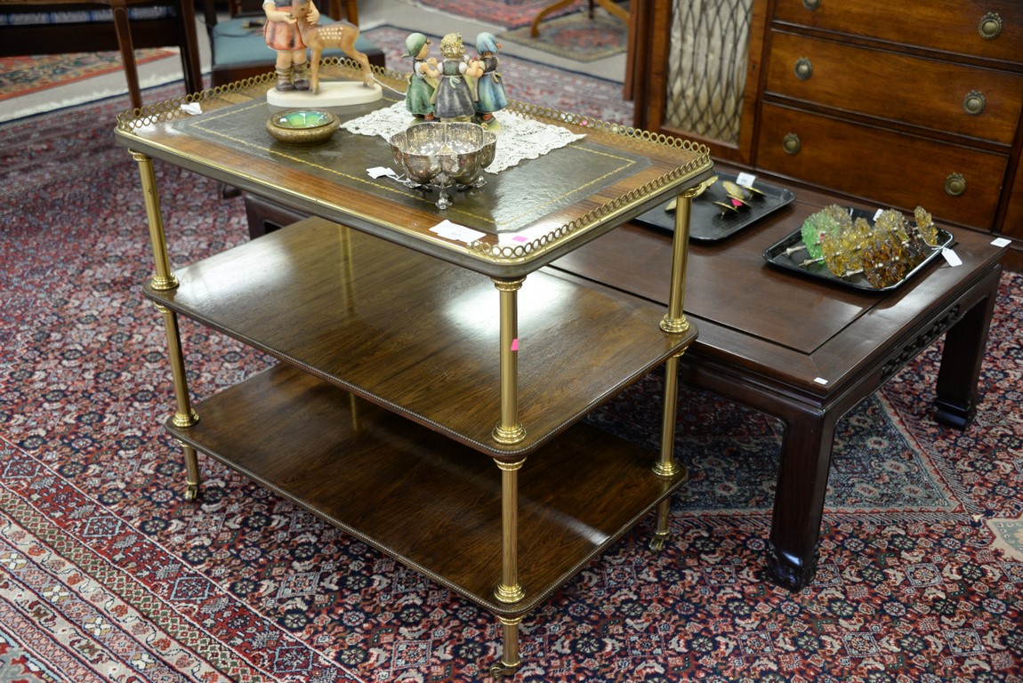 Lot 317: Baker Rosewood three tier serving cart with leather top and brass gallery on three sides. ht. 31 in. wd. 36 in. dp. 21 in.