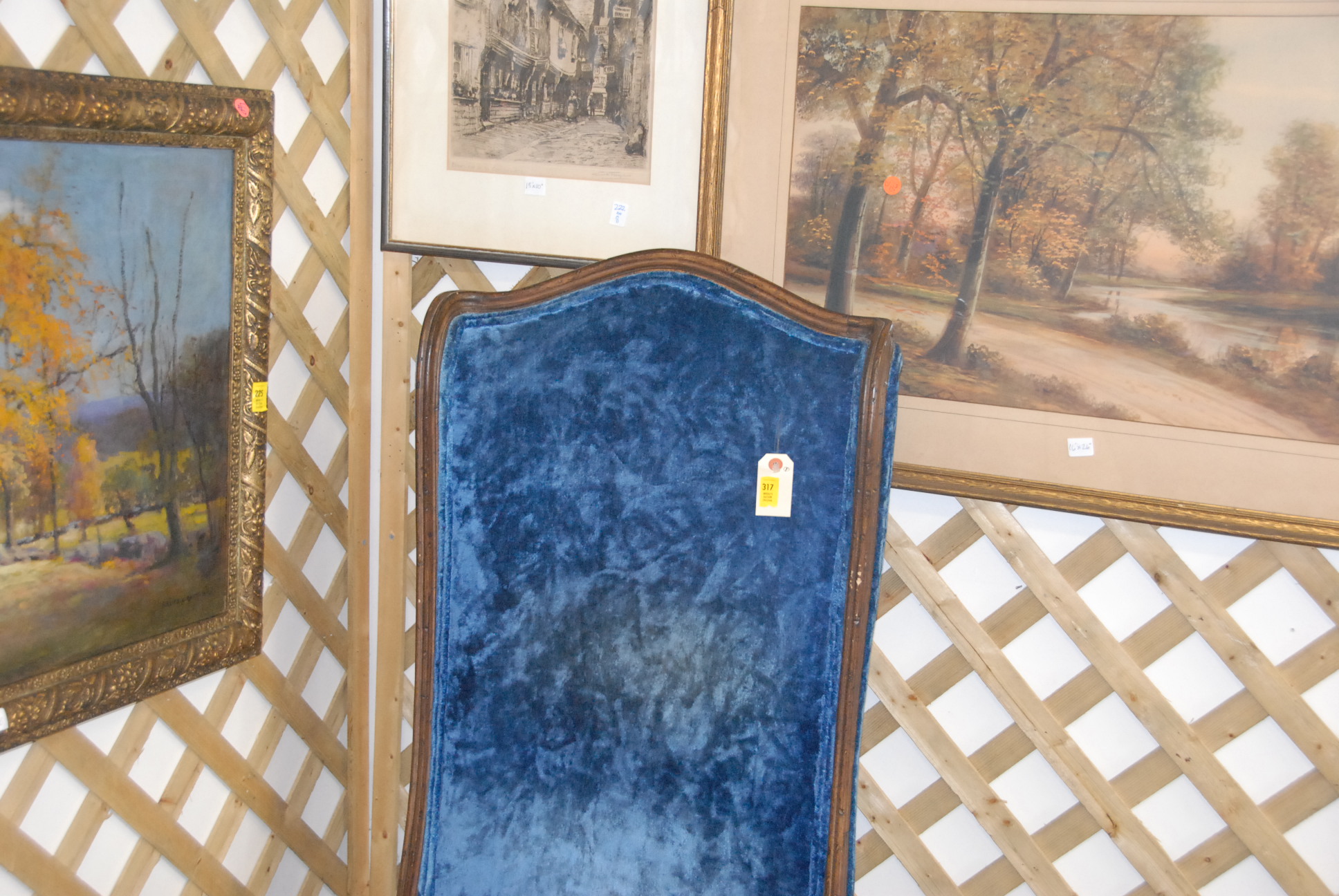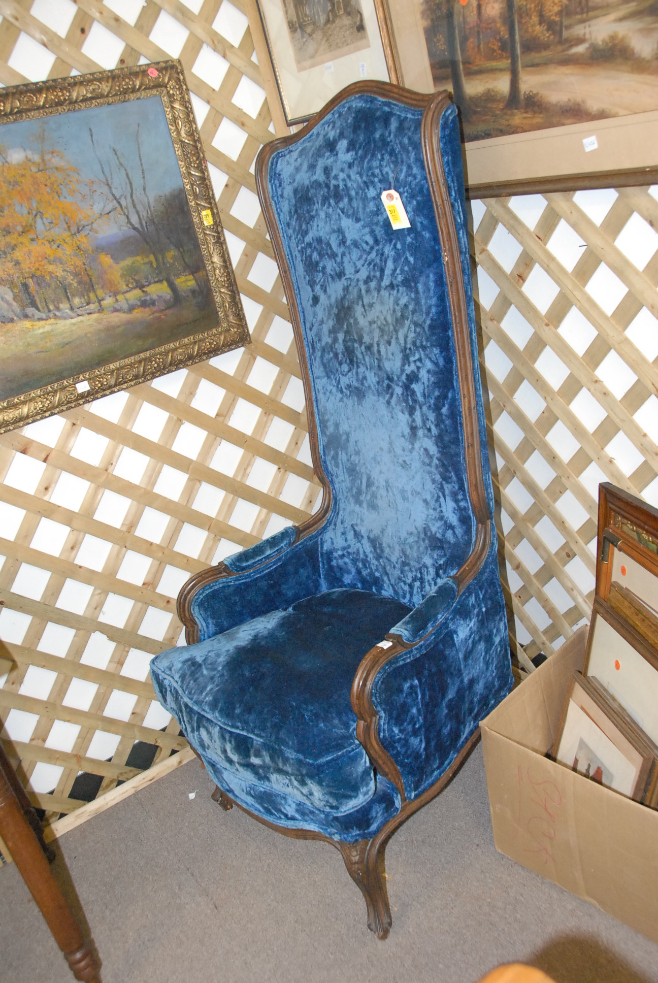 Blue upholstered high back living room chair.