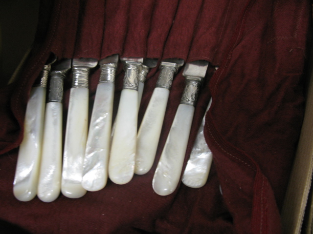 Box lot of ivory handled fish set, sterling silver ice tea spoons and pearl handled knives.